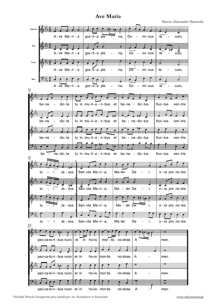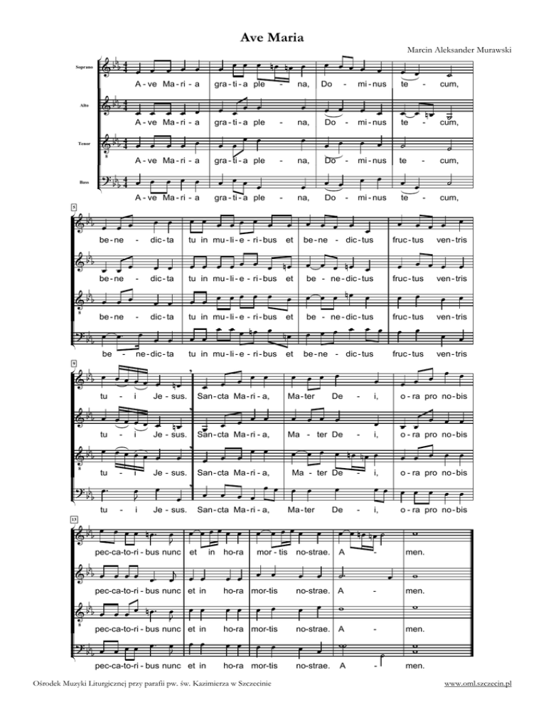 Ave Maria Soprano f a f f 44 k k k k k A - ve Ma - ri - a Alto f a f f 44 k k k k k A - ve Ma - ri - a Tenor Bass f aM f f 44 k k k k k A - ve Ma - ri - a b fff 44 k k k k k A - ve Ma - ri - a 5 f aff k k k be - ne f aff k k k be - ne - f aM f f k k k be - ne z b fff k k be 9 - gra - ti - a ple - k gra - ti - a ple k k k k gra - ti - a ple - k - - Do na, - Do - k k j mi - nus te k k tu in mu - li - e - ri - bus et k k k k k kk k k dic - ta tu in mu - li - e - ri - bus k k k f k k k k e kz k aff t pec-ca-to-ri - bus nunc j - cum, k k k k k be - ne - dic - tus fruc - tus ven - tris k k k k k be - ne - dic - tus fruc - tus k k k k ek k k k k k k k ven - tris tu in mu - li - e - ri - bus fruc - tus ven - tris Ma - ri - a, et be - ne - dic - tus ven - tris fruc - tus k k k et cum, k k k ek k ek k k k k k k k k Je - sus. 13 et - te k k k k k k k ek k k k ek k tu in mu - li - e - ri - bus cum, j k k mi - nus dic - ta j - k k ek j te cum, mi - nus k k k k k k dic - ta te k k k k k gra - ti - a ple Do k k mi - nus k k na, k k k k - k k na, - Do k k k kk k k ne - dic - ta i na, k k k k I ff k k k k f k k ek k k a tu - i Je - sus. San - cta I ff k k f k k k k ek a k k tu - i Je - sus. San - cta ff k k k k k k k I f aM k k tu - i Je - sus. San - cta I k z k k f bf f k k k t tu - k k k k k k k k k - k k k k ek ek k Marcin Aleksander Murawski be - ne - dic - tus k k k k Ma - ter De k k k k k k k Ma - ri - a, Ma - ter De k k k Ma - ri - a, k k - k k k k k k i, o - ra pro no - bis k k k k k k i, o - ra pro no - bis k k k k ek ek k Ma - ter De k k k k San - cta Ma - ri - a, - Ma - ter k De k k k k k - i, o - ra pro no - bis - i, o - ra pro no - bis kk k k k k k k kkkk k k k kkk k k k ek ek j et A f a f f k k k k k z ks k k pec-ca-to-ri - bus nunc et in f k aM f f k k k e k z kt k k pec-ca-to-ri - bus nunc et in kz k k k b fff k k k k t pec-ca-to-ri - bus nunc et in in ho-ra mor - tis no-strae. k k k k k k i - men. jz k i ho-ra mor-tis no-strae. A - men. ho-ra mor-tis no-strae. A - men. k k k k k k k k ho-ra mor-tis Ośrodek Muzyki Liturgicznej przy parafii pw. św. Kazimierza w Szczecinie k k k k no-strae. i ij A k k i j - ii men. www.oml.szczecin.pl
