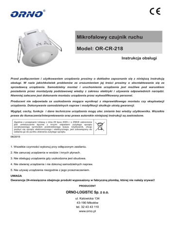 Mikrofalowy czujnik ruchu Model: OR-CR-218 Instrukcja obsługi Przed podłączeniem i użytkowaniem urządzenia prosimy o dokładne zapoznanie się z niniejszą instrukcją obsługi. W razie jakichkolwiek problemów ze zrozumieniem jej treści prosimy o skontaktowanie się ze sprzedawcą urządzenia. Samodzielny montaż i uruchomienie urządzenia jest możliwe pod warunkiem posiadania przez montażystę podstawowej wiedzy z zakresu elektryki i używania odpowiednich narzędzi. Niemniej zalecane jest dokonanie montażu urządzenia przez wykwalifikowany personel. Producent nie odpowiada za uszkodzenia mogące wyniknąć z nieprawidłowego montażu czy eksploatacji urządzenia. Dokonywanie samodzielnych napraw i modyfikacji skutkuje utratą gwarancji. Wygląd, cechy, funkcje i dane techniczne urządzenia mogą ulec zmianie bez wiedzy użytkownika. Wszelkie prawa do tłumaczenia/interpretowania oraz prawa autorskie niniejszej instrukcji są zastrzeżone. Zgodnie z przepisami Ustawy z dnia 29 lipca 2005 r. o ZSEiE zabronione jest umieszczanie łącznie z innymi odpadami zużytego sprzętu oznakowanego symbolem przekreślonego kosza. Użytkownik, chcąc pozbyć się sprzętu elektronicznego i elektrycznego, jest zobowiązany do oddania go do punktu zbierania zużytego sprzętu. 06/2015 1. Wszelkie czynności wykonuj przy odłączonym zasilaniu. 2. Nie zanurzaj urządzenia w wodzie i innych płynach. 3. Nie obsługuj urządzenia gdy uszkodzona jest obudowa. 4. Nie otwieraj urządzenia i nie dokonuj samodzielnych napraw. 5. Nie używaj urządzenia niezgodnie z jego przeznaczeniem. UWAGA Gwarancja 24-miesięczna obejmuje produkt wyposażony w fabryczną plombę, której nie należy zrywać! PRODUCENT ORNO-LOGISTIC Sp. z o.o. ul. Katowicka 134 43-190 Mikołów tel. 32 43 43 110 www.orno.pl CHARAKTERYSTYKA: FUNKCJE: Mikrofalowy (radarowy) czujnik ruchu jest aktywnym Brak wpływu temperatury na detekcję. Wbudowany czujnik zmierzchowy i przekaźnik detektorem ruchu - zintegrowany element pomiarowy wysyła elektromagnetyczne fale wysokiej czasowy. Detekcja ruchu przez szkło, tworzywa sztuczne, Wbudowany czujnik zmierzchowy pozwala częstotliwości (5,8 Ghz) i odbiera ich echo. Czujnik wykrywa zmiany najmniejszym w echu poruszeniem wywołane w nawet płyty gipsowo-kartonowe. wykrywać dzień i noc. Regulacja odbywa się obserwowanym obszarze. płynnie za pomocą pokrętła LUX w zakresie od 3 Urządzenie cechuje się wysoką częstotliwością pracy, (warunki nocne) do 2000 lux niewielką emisją mocy i bardzo dobrą detekcją ruchu w stronę do przeznaczony lub jest od czujnika do ruchu. montażu w Czujnik (nadaje się do niewielkich pomieszczeń) do 16m sufitach podwieszanych. Regulowany zasięg SENS w zakresie od 2m (nadaje się do dużych pomieszczeń). Regulowany czas załączania TIME – Minimalny czas to 10 sek±3 sek. Maksymalny czas to 12 min ±1 min. UWAGA Wysoka częstotliwość wysyłana przez czujnik ma moc <0,2mW, czyli około 1/5000 mocy emitowanej przez telefon mikrofalową. SPECYFIKACJA TECHNICZNA: WYMIARY: Napięcie zasilania: 230VAC / 50 Hz Częstotliwość pracy: 5,8 GHz Max. obciążenie: 1200W Kąt detekcji ruchu: 360° Regulacja natężenia światła: <3 – 2000 LUX Regulacja czasu świecenia: min: 10sec±3sec max: 12min±1min Regulacja zasięgu czujnika: 1-8 m (promień) Pobór mocy: około 0,9W Prędkość wykrywanego ruchu: 0,6~1,5 m/s Moc promieniowania: <0,2 mW Wysokość instalacji: 1,5~3,5 m Stopień ochrony: IP20 Waga netto: 0,1 kg komórkowy lub kuchenkę SCHEMAT POŁĄCZEŃ PRZEWODÓW INSTALACJA: (patrz schemat) KROK 1 KROK 2 KROK 3 KROK 4 Przed wybraniem miejsca montażu czujnika należy wziąć pod uwagę poniższe uwagi: - wysokość montażu 1,5~3,5 m - unikać montowania w sąsiedztwie urządzeń wytwarzających ciepło np. grzejniki, klimatyzatory - nie montować w zasięgu jasnego źródła światła - czujnik nie powinien znajdować się blisko urządzeń emitujących sile pole elektromagnetyczne. Czujnik należy podłączyć według poniższych kroków: 1. Wyłącz zasilanie. 2. Sprawdź odpowiednim przyrządem stan beznapięciowy na przewodach zasilających. 3. Zdejmij przezroczystą pokrywę winylową. 4. Zamontuj urządzenie za pomocą wkrętów. 5. Podłącz przewody pod zaciski zgodnie ze schematem podłączenia. 6. Dokręć wkręty, załóż przeźroczystą osłonę. 7. Odgiąć metalową sprężynę czujnika do góry, aż znajdzie się w położeniu “I” z czujnikiem, następnie wstawić czujnik do otworu lub skrzynki instalacyjnej, która jest na suficie, o takiej samej wielkości. Po zwolnieniu sprężyny czujnik zostanie zainstalowany. 8. Załącz obwód zasilania. 9. Dopasuj parametry pracy czujnika. DZIAŁANIE – TEST URZĄDZENIA Przekręć pokrętło SENS w kierunku zgodnym do ruchu wskazówek zegara na maksimum (+). LUX - regulacja natężenia światła TIME - regulacja czasu świecenia SENS - regulacja zasięgu Pokrętło TIME przekręć w kierunku przeciwnym do ruchu wskazówek zegara na minimum (10s). Pokrętło LUX przekręć w kierunku zgodnym do ruchu wskazówek zegara na maksimum (rys. obok) Po włączeniu zasilania, czujnik przejdzie w stan kalibracji. Światło załączy się od razu, a następnie w ciągu 10±3 sekund wyłączy się automatycznie. Po wykryciu ruchu w zasięgu pola detekcji czujnik zacznie działać prawidłowo. Gdy czujnik wykryje ruch w trakcie pierwszej indukcji zacznie ponownie odliczać czas. Ustaw pokrętło LUX na minimum - 3. Jeżeli oświetlenie otoczenia spadnie poniżej 3lux obciążenie zacznie działać gdy zostanie wykryty ruch. Uwaga: Podczas testowania urządzenia w świetle dziennym, pokrętło LUX należy obracać w kierunku (SUN), w przeciwnym wypadku czujnik nie będzie działać prawidłowo! UWAGI: Instalacji musi dokonywać elektryk lub osoba doświadczona. Nie wykorzystywać przedmiotów niestabilnych jako podstawy instalowania. Przed urządzeniem nie umieszczać przedmiotów mogących zakł