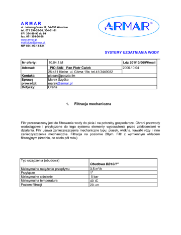 ARMAR ul. Jeleniogórska 12, 54-056 Wrocław tel. 071 354-26-06, 354-01-51 071 354-80-90 do 99 fax. 071 354-36-38 www.armar.pl mail:[email protected] NIP 894 -00-13-824 SYSTEMY UZDATNIANIA WODY Nr oferty: 10.04.1.M Ldz 201/10/06/W/mail Adresat: PIO-SAN Pan Piotr Ćwiek 25-411 Kielce ul. Górna 19a tel.41/3449082 [email protected] Marek Szyćko [email protected] Oferta 2006.10.04 Kontakt: Sprawę prowadzi: Dotyczy: 1. Filtracja mechaniczna Filtr przeznaczony jest do filtrowania wody do picia i na potrzeby gospodarcze. Chroni przewody wodociągowe i przyłączone do tego systemu elementy wyposaŜenia przed zakłóceniami w działaniu. Filtr usuwa zanieczyszczenia mechaniczne typu: piasek, włókna, kawałki rdzy i inne zanieczyszczenia mechaniczne. Filtracja na poziomie 20µm. Filtr z wymiennym wkładem filtracyjnym (średnio, co około pół roku) Typ urządzenia (obudowa) Maksymalne natęŜenie przepływu Przyłącze Maksymalne ciśnienie Maksymalna temperatura Poziom filtracji Obudowa BB10/1” 3,5 m3/h 1" 5 bar 40 °C 20 µm 2. Zmiękczanie Zmiękczacze serii ELEGANT Zastosowanie: w instalacjach domowych jako układ do częściowego zmiękczania wody, w obiektach usługowych i w małych kotłowniach wodnych. • Zmiękczacze dostępne w dwóch wersjach: o ze sterowaniem czasowym 740 (CH) – proces regeneracji jest inicjowany po upływie zadanego czasu z mikroprocesorowym sterownikiem objętościowym 760 (OB) uruchamia proces regeneracji złoŜa w funkcji objętości przepływającej wody i twardości o • WyposaŜenie standardowe o o • 5-cio cyklowy zawór sterujący zbiornik ciśnieniowy z Ŝywicą jonowymienną wbudowany w kompaktową obudowę WyposaŜenie dodatkowe o filtr ochronny siatkowy o zestaw montaŜowy (komplet przyłączy) • Środki eksploatacyjne o środek regenerujący NaCl w pastylkach lub w brykietach o wymienne wkłady filtracyjne w filtrze ochronnym • Dane techniczne o o o o o o przyłącze hydrauliczne 1” ciśnienie robocze 1,8-8 bar max temp. wody 38°C zasilanie 220 V/50Hz napięcie pracy 12V/50 Hz pobór mocy 3 W TYP ELEGANT 3 Przepływ nominalny [m /h] Spadek ciśnienia przy przepływie nominalnym [bar] Średnie zuŜycie soli na regenerację kg 08 ELEGANT 15 ELEGANT 25 ELEGANT 35 ELEGANT 0,4 0,3 0,7 0,4 0,9 0,4 1,3 0,4 Ok. 1,2 2,4 4 5,6 A/Z 08 33 66 48 55 8 A/Z 15 33 112 94 55 8 A/Z 25 33 112 94 55 8 A/Z 35 33 112 94 55 8 Wymiary: TYP ELEGANT szerokość całkowita [cm] wysokość całkowita [cm] wysokość przyłączy [cm] głębokość całkowita [cm] rozstaw przyłączy [cm] Zmiękczacz A/Z OPTIMA Zastosowanie: w instalacjach domowych jako układ do częściowego zmiękczania wody, w obiektach usługowych i w małych kotłowniach wodnych. • Zmiękczacze dostępne w dwóch wersjach: o ze sterowaniem czasowym 740 (CH) – proces regeneracji jest inicjowany po upływie Ŝądanego czasu o z mikroprocesorowym sterownikiem objętościowym 760 (OB) uruchamia proces regeneracji złoŜa w funkcji objętości przepływającej wody i twardości • o WyposaŜenie standardowe o 5-cio cyklowy zawór sterujący o zbiornik ciśnieniowy z Ŝywicą jonowymienną o zbiornik na zapas środka regenerującego z pokrywą transformator bezpieczeństwa 12 V • Środki eksploatacyjne o środek regenerujący NaCl w pastylkach lub w brykietach o wymienne wkłady filtracyjne w filtrze ochronnym • Dane techniczne o przyłącze hydrauliczne 1” o ciśnienie robocze 1,8-8 bar o max temp. wody 38°C o zasilanie 230 V/50Hz o napięcie pracy 12V/50 Hz o pobór mocy 3 W TYP OPTIMA Przepływ nominalny [m3/h] Spadek ciśnienia [bar] Średnie zuŜycie soli na regenerację [kg] A/Z 15 A/Z 25 A/Z 35 A/Z 45 A/Z 65 A/Z 75 A/Z 100 0,7 0,4 ok. 2,4 0,9 0,4 ok. 4,0 1,3 0,4 ok. 5,6 1,7 0,5 ok. 7,2 2,4 0,7 ok.10,4 2,7 0,9 ok.12 3,5 1,1 ok. 16 A/Z 15 A/Z 25 A/Z 35 A/Z 45 A/Z 65 A/Z 75 A/Z 100 60 108 93 30 60 130 117 30 83 130 117 46 83 155 140 46 89 155 140 46 97 155 140 52 99 183 168 52 Wymiary: TYP OPTIMA szerokość całkowita [cm] wysokość całkowita [cm] wysokość przyłączy [cm] głębokość całkowita [cm] rozstaw przyłączy [cm] 8 8 8 8 8 8 8 Zmiękczanie wody zapobiega powstawaniu "kamienia" w instalacjach wodnych i sprzętach gospodarstwa domowego, zapewnia tym samym wyŜszą jakość wody dla celów grzewczych. Urządzenie jest sterowane głowicą automatyczną firmy AUTOTROL. ZłoŜe jest regenerowane roztworem soli. Obsługa urządzenia polega na dosypywaniu soli do zbiornika solanki. Urządzenia występują z dwoma rodzajami głowic: CH czasowa- regeneracje ustawiamy czasowo, co 1,2,3...7 dni i odbywają się niezaleŜnie od ilości zuŜytej wody OB objętościowa- regeneracje odbywają się zaleŜnie od ilości zuŜytej wody, po wcześniejszym ustawieniu twardości wody i pojemności urządzenia, podczas regeneracji do instalacji podawana jest woda surowa TYP urządzenia A/Z 25 CH,OB.Optima, Elegant Przepływ nominalny 1,0 m3/h przy twardości 440 mgCaCO3 Ciśnienie pracy 2 - 8 bar Spadek ciśnienia przy przepływie nominalnym 0,4 bar Ilość Ŝywicy 25 litrów Temperatura pracy 1 - 38°C Przyłącze 1" Średnie zuŜycie soli na regenerację 3,5 kg Oferta cenowa l.p. 1 1a 2 2a lub 2b lub 2c lub Nazwa Filtracja mechaniczna Wkład filtracyjny Zmiękczacz Zmiękczacz Zmiękczacz Zmiękczacz Kod Ilość VAT [SZT] [%] Obudowa BB10/1” 1 22 BB10 BSE 20 A/Z 25 CH Optima A/Z 25OB Optima A/Z 25 CH Elegant A/Z 25 OB. Elegant 1 1 1 1 1 22 22 22 22 22 EURO przeliczane w kaŜdy poniedziałek po kursie sprzedaŜy BRE BANK MultiBank. Z tabeli oferta cenowa poz. 2 urządzenie jedno do wyboru Pozdrawiam Marek Szyćko Cena netto katalog