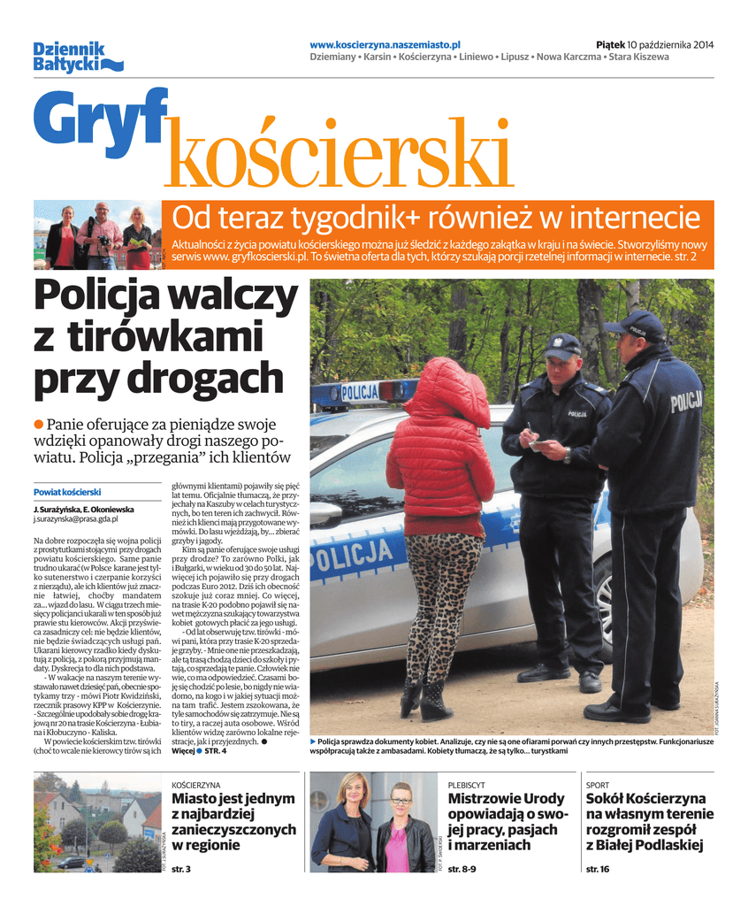 www.koscierzyna.naszemiasto.pl Piątek 10 października 2014 Dziemiany • Karsin • Kościerzyna • Liniewo • Lipusz • Nowa Karczma • Stara Kiszewa FOT. ARCH. Od teraz tygodnik+ również w internecie Aktualności z życia powiatu kościerskiego można już śledzić z każdego zakątka w kraju i na świecie. Stworzyliśmy nowy serwis www. gryfkoscierski.pl. To świetna oferta dla tych, którzy szukają porcji rzetelnej informacji w internecie. str. 2 Policja walczy z tirówkami przy drogach A Panie oferujące za pieniądze swoje głównymi klientami) pojawiły się pięć lat temu. Oficjalnie tłumaczą, że przyjechały na Kaszuby w celach turystycznych, bo ten teren ich zachwycił. Równieżichkliencimająprzygotowanewymówki. Do lasu wjeżdżają, by... zbierać grzyby i jagody. Kim są panie oferujące swoje usługi przy drodze? To zarówno Polki, jak iBułgarki,wwiekuod30do50lat. Najwięcej ich pojawiło się przy drogach podczas Euro 2012. Dziś ich obecność szokuje już coraz mniej. Co więcej, na trasie K-20 podobno pojawił się nawetmężczyznaszukającytowarzystwa kobiet gotowych płacić za jego usługi. - Odlat obserwuję tzw. tirówki - mówi pani, która przy trasie K-20 sprzedajegrzyby.-Mnieonenieprzeszkadzają, aletątrasąchodządziecidoszkołyipytają,cosprzedajątepanie.Człowieknie wie, co ma odpowiedzieć. Czasami boję się chodzić polesie, bo nigdy nie wiadomo, na kogo i w jakiej sytuacji można tam trafić. Jestem zszokowana, że tylesamochodówsięzatrzymuje.Niesą to tiry, a raczej auta osobowe. Wśród klientów widzę zarówno lokalne rejestracje, jak i przyjezdnych. A Więcej a STR. 4 J. Surażyńska, E. Okoniewska [email protected] FOT. J.SURAŻYŃSKA Na dobre rozpoczęła się wojna policji zprostytutkamistojącymi przydrogach powiatu kościerskiego. Same panie trudnoukarać(wPolsce karanejesttylko sutenerstwo i czerpanie korzyści z nierządu), ale ich klientów już znacznie łatwiej, choćby mandatem za...wjazddolasu. W ciągutrzechmiesięcypolicjanciukaraliwtensposóbjuż prawie stu kierowców. Akcji przyświeca zasadniczy cel: nie będzie klientów, nie będzie świadczących usługi pań. Ukarani kierowcy rzadko kiedy dyskutują z policją, z pokorą przyjmują mandaty. Dyskrecja to dla nich podstawa. - W wakacje na naszym terenie wystawałonawetdziesięćpań,obecniespotykamy trzy - mówi Piotr Kwidziński, rzecznik prasowy KPP w Kościerzynie. -Szczególnieupodobałysobiedrogękrajowąnr20natrasieKościerzyna-Łubiana i Kłobuczyno - Kaliska. Wpowieciekościerskimtzw.tirówki (choć to wcale nie kierowcy tirów są ich b Policja sprawdza dokumenty kobiet. Analizuje, czy nie są one ofiarami porwań czy innych przestępstw. Funkcjonariusze współpracują także z ambasadami. Kobiety tłumaczą, że są tylko... turystkami KOŚCIERZYNA PLEBISCYT SPORT Miasto jest jednym z najbardziej zanieczyszczonych w regionie Mistrzowie Urody opowiadają o swojej pracy, pasjach i marzeniach Sokół Kościerzyna na własnym terenie rozgromił zespół z Białej Podlaskiej str. 8-9 str. 16 str. 3 FOT. P. ŚWIDERSKI Powiat kościerski FOT. JOANNA SURAŻYŃSKA wdzięki opanowały drogi naszego powiatu. Policja „przegania” ich klientów 02//tygodnik 28 Od redaktora Joanna Surażyńska tyle nagród przyznały władze gminy Nowa Karczma zdolnym uczniom za ich osiągnięcia w nauce oraz szczególne osiągnięcia sportowe. Gmina wydała na ten cel ponad 11 tysięcy złotych. Warto podkreślić, że maksymalna wysokość finansowej nagrody wynosiła 600 złotych. Dodajmy, że jeden z uczniów otrzymał nagrodę rzeczową za udział w Finale Wojewódzkim Konkursu Matematycznego. Jak podkreślają władze gminy, celem przyznania nagród jest promowanie i wyróżnienie najbardziej uzdolnionych uczniów. Więcej na str. 14 (WM) Z przymrużeniem oka Gryf Kościerski+ już w sieci FOT. MACIEJ WAJER D Bezpieczny powiat FOT. MACIEJ WAJER Prawie 900 młodych ludzi wzięło udział w akcji zorganizowanej przez samorząd powiatowy, która odbyła się pod hasłem “Bezpieczny powiat”. Jej głównym celem było poszerzenie wiedzy na temat bezpieczeństwa publicznego. W akcji wzięli udział przedstawiciele policji, straży pożarnej. (WM) b Zostałem wezwany na uroczystość przekazania samochodów i musiałem zostawić wszystkie swoje obowiązki - zdaje się myśleć Andrzej Czaja, komendant kościerskiej policji. - Nawet krawat źle zawiązałem. Muszę go szybko poprawić, bo widzę, że burmistrz od “stóp do głów” jest elegancki Felieton hociaż pogoda jak na prawdziwą polską jesień przystało nastraja nas optymizmem, to już teraz można zauważyć, że w niektórych domach robi się chłodno. A to oznacza, że trzeba zadbać o podwyższenie temperatury. Czas więc na zakasanie rękawów i rozpalenie domowych ognisk. Na efekty takich działań nie trzeba było długo czekać, bo każdy widzi buchające czarnym dymem kominy. Czasami słabiej, a czasami mocniej. Raport przygotowany przez Wojewódzki Inspektorat Ochrony Środowi- ska w Gdańsku pokazuje, że Kościerzyna nadal znajduje się w czołówce najbardziej zanieczyszczonych miast w województwie pomorskim. Niestety, nie jest to powód do dumy. W tej niechlubnej czołówce znajdujemy się od wielu lat i raczej nic nie wskazuje na to, by w najbliższej przyszłości taka sytuacja miałaby się zmienić. Trzeba obiektywnie podkreślić, że władze miasta podejmują różne działania, by powietrze było bardziej czyste, jednak efekty są mizerne. Nie jest to oczywiście wina rządzących, bo kontrole przeprowadzane przez strażników miejskich ewidentnie pokazują, że sami sobie fundujemy emisję różnych zanieczyszczeń do powietrza. Myślę, że gdyby WIOŚ przeprowadziłby badania poza stolicą powiatu, to również nie napawałyby one optymizmem. Większość z nas jeździ przecież samochodami i może zaobserwować lokalny krajobraz, którego integralnym elementem są REDAKTOR PROWADZĄCY 