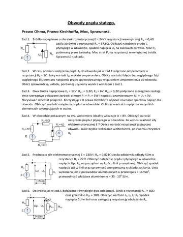 Obwody prądu stałego. Prawo Ohma, Prawo Kirchhoffa, Moc, Sprawnośd. Zad.1. Źródło napięciowe o sile elektromotorycznej E = 24V i rezystancji wewnętrznej Rw = 0,4Ω zasila żarówkę o rezystancji Ro = 57,6Ω. Obliczyd natężenie prądu I0 płynącego w obwodzie, spadek napięcia U0 na zaciskach żarówki. Moc P0 pobieraną przez żarówkę. Moc strat Ps na rezystancji wewnętrznej źródła. Sprawnośd η układu. Zad.2. W celu pomiaru natężenia prądu I0 do obwodu jak w zad.1 włączono amperomierz o rezystancji RA = 1Ω. Jaką wartośd I01 wskaże amperomierz. Oblicz wartości błędu bezwzględnego ∆I0 i względnego δI0 pomiaru natężenia prądu spowodowanego włączeniem amperomierza do obwodu. Oblicz sprawnośd η1 układu, porównaj uzyskany wynik z wynikiem z zad.1. Zad.3. Dwa źródła napięciowe E1 = 12V, Rw1 = 0,3Ω, E2 = 6V, Rw2 = 0,2Ω połączone szeregowo zasilają dwie szeregowo połączone żarówki o mocy P1 = P2 = 5W i napięciu znamionowym U1 = U2 = 9V. Narysowad schemat połączeo. Korzystając z II prawa Kirchhoffa napisad równanie spadków napięd dla obwodu. Obliczyd wartośd natężenia prądu I w obwodzie. Obliczyd wartości napięd na wszystkich elementach występujących w oczku. Zad.4. W obwodzie pokazanym na rys. woltomierz idealny wskazuje U = 8V. Obliczyd wartośd natężenia prądu I płynącego w obwodzie. Ile wynosi wartośd siły elektromotorycznej E ? Oblicz wartośd rezystancji zastępczej obwodu. Jakie będzie wskazanie woltomierza, po zwarciu rezystora R2. Zad.5. Prądnica o sile elektromotorycznej E = 230V i Rw = 0,821Ω zasila odbiornik odległy 50m o rezystancji R0 = 22Ω. Obliczyd natężenie prądu I płynącego w obwodzie, napięcia Uρ i Uo na początku i na koocu linii przesyłowej. Obliczyd spadek napięcia ∆U w linii oraz sprawnośd energetyczną η układu zasilania. Linia wykonana jest z przewodów aluminiowych o przekroju S = 16mm2, przewodnośd właściwa aluminium σ = 35 ∙ 106 S/m. Zad.6. Do źródła jak w zad.5 dołączono równolegle dwa odbiorniki. Silnik o rezystancji Ro1 = 60Ω oraz grzejnik o Ro2 = 30Ω. Obliczyd wartości I1, I2, I, Uo. Spadek napięcia ∆U w linii oraz zastępczą rezystancję obciążenia Ro.