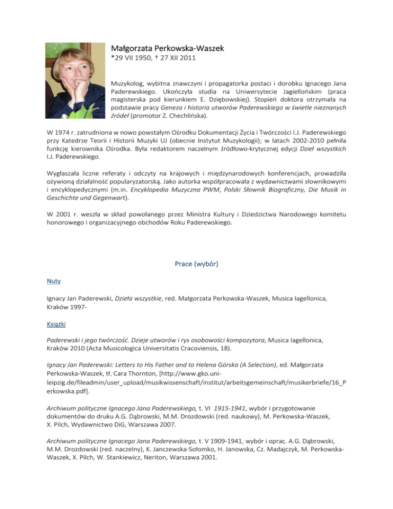 Małgorzata Perkowska-Waszek *29 VII 1950, † 27 XII 2011 Muzykolog, wybitna znawczyni i propagatorka postaci i dorobku Ignacego Jana Paderewskiego. Ukończyła studia na Uniwersytecie Jagiellońskim (praca magisterska pod kierunkiem E. Dziębowskiej). Stopień doktora otrzymała na podstawie pracy Geneza i historia utworów Paderewskiego w świetle nieznanych źródeł (promotor Z. Chechlińska). W 1974 r. zatrudniona w nowo powstałym Ośrodku Dokumentacji Życia i Twórczości I.J. Paderewskiego przy Katedrze Teorii i Historii Muzyki UJ (obecnie Instytut Muzykologii); w latach 2002-2010 pełniła funkcję kierownika Ośrodka. Była redaktorem naczelnym źródłowo-krytycznej edycji Dzieł wszystkich I.J. Paderewskiego. Wygłaszała liczne referaty i odczyty na krajowych i międzynarodowych konferencjach, prowadziła ożywioną działalność popularyzatorską. Jako autorka współpracowała z wydawnictwami słownikowymi i encyklopedycznymi (m.in. Encyklopedia Muzyczna PWM, Polski Słownik Biograficzny, Die Musik in Geschichte und Gegenwart). W 2001 r. weszła w skład powołanego przez Ministra Kultury i Dziedzictwa Narodowego komitetu honorowego i organizacyjnego obchodów Roku Paderewskiego. Prace (wybór) Nuty Ignacy Jan Paderewski, Dzieła wszystkie, red. Małgorzata Perkowska-Waszek, Musica Iagellonica, Kraków 1997Książki Paderewski i jego twórczość. Dzieje utworów i rys osobowości kompozytora, Musica Iagellonica, Kraków 2010 (Acta Musicologica Universitatis Cracoviensis, 18). Ignacy Jan Paderewski: Letters to His Father and to Helena Górska (A Selection), ed. Małgorzata Perkowska-Waszek, tł. Cara Thornton, [http://www.gko.unileipzig.de/fileadmin/user_upload/musikwissenschaft/institut/arbeitsgemeinschaft/musikerbriefe/16_P erkowska.pdf]. Archiwum polityczne Ignacego Jana Paderewskiego, t. VI 1915-1941, wybór i przygotowanie dokumentów do druku A.G. Dąbrowski, M.M. Drozdowski (red. naukowy), M. Perkowska-Waszek, X. Pilch, Wydawnictwo DiG, Warszawa 2007. Archiwum polityczne Ignacego Jana Paderewskiego, t. V 1909-1941, wybór i oprac. A.G. Dąbrowski, M.M. Drozdowski (red. naczelny), K. Janczewska-Sołomko, H. Janowska, Cz. Madajczyk, M. PerkowskaWaszek, X. Pilch, W. Stankiewicz, Neriton, Warszawa 2001. Za kulisami wielkiej kariery. Paderewski w dziennikach i listach Sylwina i Anieli Strakaczów 1936-1937, wstęp Małgorzata Perkowska-Waszek, Musica Iagellonica, Kraków 1994. Diariusz koncertowy Ignacego Jana Paderewskiego, Polskie Wydawnictwo Muzyczne, Kraków 1990. Artykuły Jeszcze o dacie urodzin i „powinności wojskowej” Paderewskiego, w: Muzykolog wobec świadectw źródłowych i dokumentów. Księga pamiątkowa dedykowana Profesorowi Piotrowi Poźniakowi w 70. rocznicę urodzin, Musica Iagellonica, Kraków 2009, s. 301-309. Eugène Ysaÿe w Polsce. Występy belgijskiego skrzypka w świetle polskiej prasy muzycznej i artystycznoliterackiej, w: Donum natalicum. Studia Thaddaeo Przybylski octogenario dedicata, red. Z. Fabiańska, A. Jarzębska, A. Sitarz, Musica Iagellonica, Kraków 2007, s. 384-405. Eugène Ysaýe en Pologne. Concerts du violoniste de notoriété mondiale – à la lumière de la presse polonaise musicale, artistique et littéraire, „Revue Belge de Musicologie” 2006 vol. LX, s. 155-168. The letters of I.J. Paderewski as a Source of Knowledge Concerning Cultural Relationships of Europer, w: Musikgeschichte in Mittel- und Osteuropa, Mitteilungen der internationalen Arbeitsgemeinschaft an der Universitaet Lepzig, Heft 10, Lepzig 2005, s. 43-56 [http://www.gko.unileipzig.de/fileadmin/user_upload/musikwissenschaft/pdf_allgemein/arbeitsgemeinschaft/heft10/1007 _perkowska-waszek.pdf]. O Paderewskim pedagogu, w: Muzyka wobec tradycji. Idee-dzieło-recepcja, studia pod redakcją Szymona Paczkowskiego, Instytut Muzykologii UW, Warszawa 2004, s. 619-631. O jeńcach Kozielska i Starobielska w korespondencji ze zbiorów Ośrodka Paderewskiego, w: Muzykolog wobec dzieła muzycznego: Zbiór prac dedykowanych doktor Elżbiecie Dziębowskiej w siedemdziesiątą rocznicę urodzin, red. M. Woźna-Stankiewicz, Z. Fabiańska, Musica Iagellonica, Kraków 1999, s. 71-80. Nieznane kompozycje Paderewskiego w świetle badań źródłowych, "Muzyka" 1988 nr 3, s. 21- 33. Ośrodek Dokumentacji Życia i Twórczości Paderewskiego, w: Muzykologia Krakowska 1911- 1986, red. E. Dziębowska, PWN, Kraków 1987, s. 47-52. Wczesne utwory Paderewskiego w świetle źródeł prasowych, "Muzyka" 1981 nr 3-4, s. 117-120. Początki i rozkwit kariery pianistycznej Paderewskiego, "Muzyka" 1977 nr 3, s. 39-59. Prace popularyzatorskie Ignacy Jan Paderewski o sobie. Zarys biografii wzbogacony listami artysty, Tarnów-Kąśna Dolna 2004. I. J. Paderewski (1860-1941), "Polish Culture" 2001 nr 3 (15), s. 46-47. Małgorzata Perkowska-Waszek, Iwona Fischer, Piotr Boroń, Kraków - Ignacemu J. Paderewskiemu, Rada Inicjatyw Społecznych i Gospodarczych - Muzeum Historii Fotografii, Kraków 2000. Śladami Paderewskiego. Rozmowa z Małgorzatą Perkowską, "Ruch Muzyczny" 1994 nr 21, s. 1, 6. Nuty, kamienie i groby (Korespondencja własna z Żytomierza), "Dziennik Polski" nr 119 (22-28 V 1992), s. 8. Rewizja nadzwyczajna przeciw pomówieniom Sylwina Strakacza, "Echo Krakowa" nr 126 (30 VI 1992), s. 1.