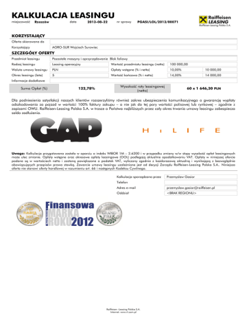 KALKULACJA LEASINGU miejscowość Rzeszów 2013-08-22 data nr sprawy PGASI/LOL/2013/00071 KORZYSTAJĄCY Oferta skierowana do Korzystający AGRO-SUR Wojciech Surowiec SZCZEGÓŁY OFERTY Przedmiot leasingu Pozostałe maszyny i oprzyrządowanie Blok foliowy Rodzaj leasingu Leasing operacyjny Wartość przedmiotu leasingu (netto) 100 000,00 Waluta umowy leasingu PLN Opłaty wstępne (% i netto) 10,00% 10 000,00 Okres leasingu (lata) 5 Wartość końcowa (% i netto) 14,00% 14 000,00 Informacje dodatkowe Suma Opłat (%) 122,78% Wysokość raty leasingowej (netto) 60 x 1 646,30 PLN Dla podniesienia satysfakcji naszych klientów rozszerzyliśmy również zakres ubezpieczenia komunikacyjnego o gwarancję wypłaty odszkodowania za pojazd w wartości 100% faktury zakupu – a nie jak do tej pory wartości polisowej lub rynkowej – zgodnie z zapisami OWU. Raiffeisen-Leasing Polska S.A. w trosce o Państwa najbliższych przez cały okres trwania umowy leasingu zabezpiecza saldo zadłużenia. Uwaga: Kalkulacja przygotowana została w oparciu o indeks WIBOR 1M – 2.6200 i w przypadku zmiany w/w stopy wysokość opłat leasingowych może ulec zmianie. Opłaty wstępne oraz okresowe opłaty leasingowe (OOL) podlegają aktualnie opodatkowaniu VAT. Opłaty w niniejszej ofercie podane są w wartościach netto i zostaną powiększone o podatek VAT, wyliczony zgodnie z każdorazową aktualną i wynikającą z bezwzględnie obowiązujących przepisów prawa stawką. Zawarcie umowy leasingu uzależnione jest od decyzji Zarządu Raiffeisen-Leasing Polska S.A.. Niniejsza oferta nie stanowi oferty handlowej w rozumieniu art. 66 i następnych Kodeksu Cywilnego. Kalkulacja sporządzona przez Przemyslaw Gasior Telefon Adres e-mail [email protected] Oddział <BRAK REGIONU> Raiffeisen -Leasing Polska S.A. Internet: www.rl.com.pl