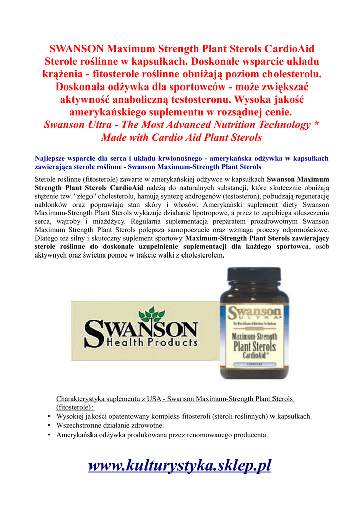 SWANSON Maximum Strength Plant Sterols CardioAid Sterole roślinne w kapsułkach. Doskonałe wsparcie układu krążenia - fitosterole roślinne obniżają poziom cholesterolu. Doskonała odżywka dla sportowców - może zwiększać aktywność anaboliczną testosteronu. Wysoka jakość amerykańskiego suplementu w rozsądnej cenie. Swanson Ultra - The Most Advanced Nutrition Technology * Made with Cardio Aid Plant Sterols Najlepsze wsparcie dla serca i układu krwionośnego - amerykańska odżywka w kapsułkach zawierająca sterole roślinne - Swanson Maximum-Strength Plant Sterols Sterole roślinne (fitosterole) zawarte w amerykańskiej odżywce w kapsułkach Swanson Maximum Strength Plant Sterols CardioAid należą do naturalnych substancji, które skutecznie obniżają stężenie tzw. "złego" cholesterolu, hamują syntezę androgenów (testosteron), pobudzają regenerację nabłonków oraz poprawiają stan skóry i włosów. Amerykański suplement diety Swanson Maximum-Strength Plant Sterols wykazuje działanie lipotropowe, a przez to zapobiega stłuszczeniu serca, wątroby i miażdżycy. Regularna suplementacja preparatem prozdrowotnym Swanson Maximum Strength Plant Sterols polepsza samopoczucie oraz wzmaga procesy odpornościowe. Dlatego też silny i skuteczny suplement sportowy Maximum-Strength Plant Sterols zawierający sterole roślinne do doskonałe uzupełnienie suplementacji dla każdego sportowca, osób aktywnych oraz świetna pomoc w trakcie walki z cholesterolem. Charakterystyka suplementu z USA - Swanson Maximum-Strength Plant Sterols (fitosterole): • Wysokiej jakości opatentowany kompleks fitosteroli (steroli roślinnych) w kapsułkach. • Wszechstronne działanie zdrowotne. • Amerykańska odżywka produkowana przez renomowanego producenta. www.kulturystyka.sklep.pl Jak można obniżyć poziom cholesterolu bez leków? Recepta jest prosta: naturalne sterole roślinne zawarte w suplemencie diety Swanson Maximum-Strength Plant Sterols pomogą ci w walce z cholesterolem. Sterole roślinne zawarte w amerykańskim suplemencie Swanson Maximum-Strength Plant Sterols obniżają poziom złego cholesterolu LDL, którego wysoki poziom powoduje choroby układu krążenia. Fitosterole, czyli sterole roślinne swoją budową przypominają cholesterol, dlatego też ich sposób działania polega na hamowanie wchłaniania złego cholesterolu w jelitach. Ponadto, Swanson Maximum-Strength Plant Sterols to wszechstronna prozdrowotna odżywka doskonała dla każdego! • • • • Sposób działania odżywki Maximum Strength Plant Sterols: obniża poziom cholesterolu, reguluje poziom trójglicerydów we krwi, poprawia stan skóry, włosów i paznokci, wspiera układ odpornościowy (immunologiczny) Dawkowanie oraz sposób użycia Maximum Strength Plant Sterols (profilaktyka chorób serca i układu krążenia): Jedna kapsułka raz dziennie. Nie przekraczać dziennej porcji. Produkt nie może być stosowany jako substytut prawidłowo zróżnicowanej diety. Produkt niewskazany dla kobiet w ciąży i karmiących. Opis i charakterystyka naturalnego suplementu Maximum Strength Plant Sterols Swanson USA: • 1 porcja = 1 kapsułka amerykańskiego preparatu ze sterolami roślinnymi • Ilość porcji w opakowaniu / Zawartość opakowania: 60 kapsułek Skład produktu wspierającego serce i układ krążenia Maximum Strength Plant Sterols: Zawartość: w jednej kapsułce CardioAid® Fitosterole 400mg - Beta Sitosterol 160-232 mg - Kampesterol 80-120 mg - Stigmasterol 56-88 mg - Brassikasterol 0-24 mg - Sitosterol 0-20 mg * CardioAid® jest znakiem zastrzeżonym przez firmę Archer Daniels Midland Co. Inne składniki amerykańskiego preparatu Swanson: • żelatyna, • mąka ryżowa • stearynian magnezu. www.kulturystyka.sklep.pl