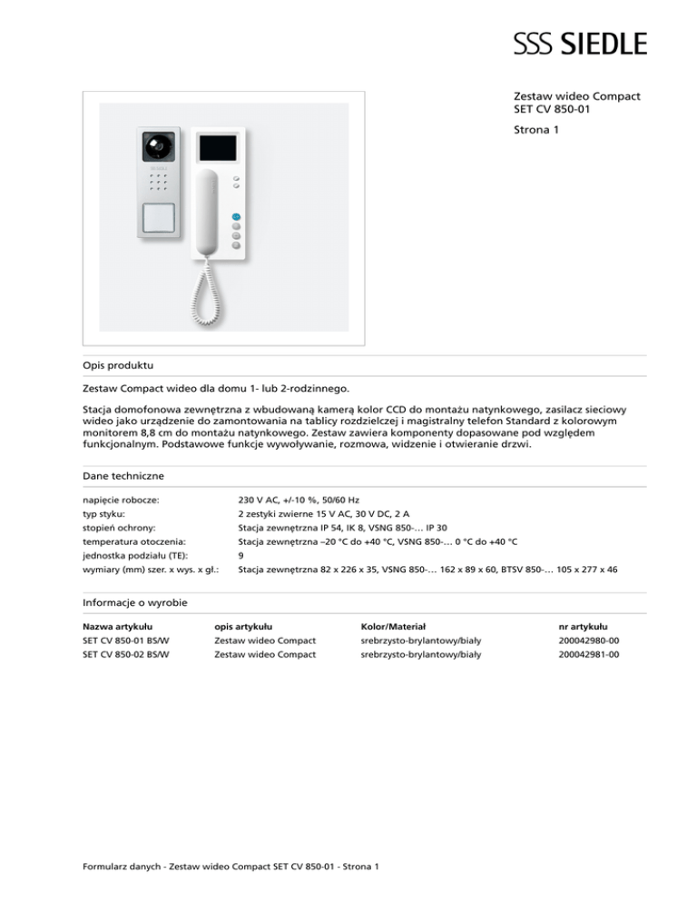 Zestaw wideo Compact SET CV 850-01 Strona 1 Opis produktu Zestaw Compact wideo dla domu 1- lub 2-rodzinnego. Stacja domofonowa zewnętrzna z wbudowaną kamerą kolor CCD do montażu natynkowego, zasilacz sieciowy wideo jako urządzenie do zamontowania na tablicy rozdzielczej i magistralny telefon Standard z kolorowym monitorem 8,8 cm do montażu natynkowego. Zestaw zawiera komponenty dopasowane pod względem funkcjonalnym. Podstawowe funkcje wywoływanie, rozmowa, widzenie i otwieranie drzwi. Dane techniczne napięcie robocze: 230 V AC, +/-10 %, 50/60 Hz typ styku: 2 zestyki zwierne 15 V AC, 30 V DC, 2 A stopień ochrony: Stacja zewnętrzna IP 54, IK 8, VSNG 850-… IP 30 temperatura otoczenia: Stacja zewnętrzna –20 °C do +40 °C, VSNG 850-… 0 °C do +40 °C jednostka podziału (TE): 9 wymiary (mm) szer. x wys. x gł.: Stacja zewnętrzna 82 x 226 x 35, VSNG 850-… 162 x 89 x 60, BTSV 850-… 105 x 277 x 46 Informacje o wyrobie Nazwa�artykułu opis�artykułu Kolor/Materiał nr�artykułu SET CV 850-01 BS/W Zestaw wideo Compact srebrzysto-brylantowy/biały 200042980-00 SET CV 850-02 BS/W Zestaw wideo Compact srebrzysto-brylantowy/biały 200042981-00 Formularz danych - Zestaw wideo Compact SET CV 850-01 - Strona 1 Zestaw wideo Compact SET CV 850-01 Strona 2 Osprzęt Nazwa�artykułu opis�artykułu Kolor/Materiał nr�artykułu ZTCV 850-0 osprzęt do urządzeń na biurko półprzeźroczysty 200034729-00 Części zamienne Nazwa�artykułu opis�artykułu Kolor/Materiał nr�artykułu CA 812-..., CV 850-... Siedle Śrubokręt pozostałe 200029931-00 CA 812-1/CV 850-1 Górna część tabliczki z nazwiskiem przeźroczysty 200029864-00 CA 812-1/CV 850-1 Wkładka z napisem do tabliczki z nazwiskiem biały 200029869-00 CA 812-2/CV 850-2 Górna część tabliczki z nazwiskiem przeźroczysty 200029865-00 CA 812-2/CV 850-2 Wkładka z napisem do tabliczki z nazwiskiem biały 200029870-00 CA/CV 812/850-...STA/STV 850-... Głośnik pozostałe 200029867-00 CV 850-1 BS Część górna obudowy srebrzysto-brylantowy 200029862-00 CV 850-1 W Wideo-Stacja zewnętrzna Siedle Compact Sygnał Biały 210005112-00 CV 850-1 W Obudowa-Część górna Sygnał Biały 210005113-00 CV 850-2 BS Część górna obudowy srebrzysto-brylantowy 200029863-00 CV 850-2 W Wideo-Stacja zewnętrzna Siedle Compact Sygnał Biały 210005114-00 CV 850-2 W Obudowa-Część górna Sygnał Biały 210005115-00 HT 811/840/850 W Słuchawka z przewodem sprężynującym biały 200029573-00 Formularz danych - Zestaw wideo Compact SET CV 850-01 - Strona 2 Zestaw wideo Compact SET CV 850-01 Strona 3 Formularz danych - Zestaw wideo Compact SET CV 850-01 - Strona 3 Zestaw wideo Compact SET CV 850-01 Strona 4 SET CV 850 Informacja o produktach 4,7 MB Pobieranie Informacja o produktach 4,7 MB Pobieranie Deklaracja Zgodności 551 kB Pobieranie Formularz danych - Zestaw wideo Compact SET CV 850-01 - Strona 4