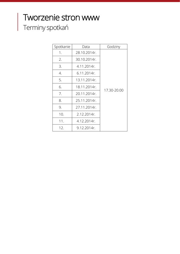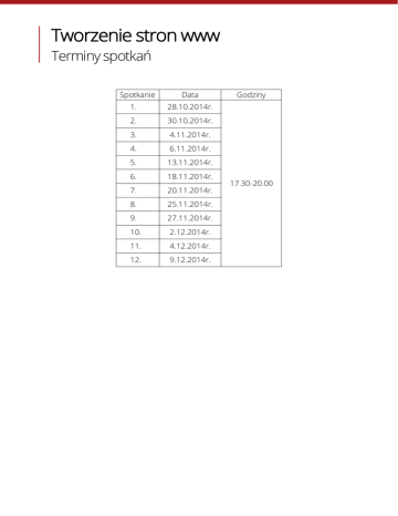 Tworzenie stron www Terminy spotkań Spotkanie Data 1. 28.10.2014r. 2. 30.10.2014r. 3. 4.11.2014r. 4. 6.11.2014r. 5. 13.11.2014r. 6. 18.11.2014r. 7. 20.11.2014r. 8. 25.11.2014r. 9. 27.11.2014r. 10. 2.12.2014r. 11. 4.12.2014r. 12. 9.12.2014r. Godziny 17.30-20.00
