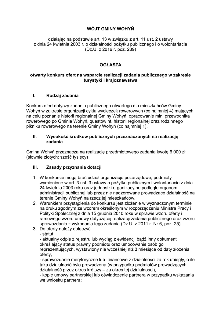 WÓJT GMINY WOHYŃ działając na podstawie art. 13 w związku z art. 11 ust. 2 ustawy z dnia 24 kwietnia 2003 r. o działalności pożytku publicznego i o wolontariacie (Dz.U. z 2016 r. poz. 239) OGŁASZA otwarty konkurs ofert na wsparcie realizacji zadania publicznego w zakresie turystyki i krajoznawstwa I. Rodzaj zadania Konkurs ofert dotyczy zadania publicznego otwartego dla mieszkańców Gminy Wohyń w zakresie organizacji cyklu wycieczek rowerowych (co najmniej 4) mających na celu poznanie historii regionalnej Gminy Wohyń, opracowanie mini przewodnika rowerowego po Gminie Wohyń, questów nt. historii regionalnej oraz rodzinnego pikniku rowerowego na terenie Gminy Wohyń (co najmniej 1). II. Wysokość środków publicznych przeznaczonych na realizację zadania Gmina Wohyń przeznacza na realizację przedmiotowego zadania kwotę 6 000 zł (słownie złotych: sześć tysięcy) III. Zasady przyznania dotacji 1. W konkursie mogą brać udział organizacje pozarządowe, podmioty wymienione w art. 3 ust. 3 ustawy o pożytku publicznym i wolontariacie z dnia 24 kwietnia 2003 roku oraz jednostki organizacyjne podległe organom administracji publicznej lub przez nie nadzorowane prowadzące działalność na terenie Gminy Wohyń na rzecz jej mieszkańców. 2. Warunkiem przystąpienia do konkursu jest złożenie w wyznaczonym terminie na druku zgodnym ze wzorem określonym w rozporządzeniu Ministra Pracy i Polityki Społecznej z dnia 15 grudnia 2010 roku w sprawie wzoru oferty i ramowego wzoru umowy dotyczącej realizacji zadania publicznego oraz wzoru sprawozdania z wykonania tego zadania (Dz.U. z 2011 r. Nr 6, poz. 25). 3. Do oferty należy dołączyć: - statut, - aktualny odpis z rejestru lub wyciąg z ewidencji bądź inny dokument określający status prawny podmiotu oraz umocowanie osób go reprezentujących, wystawiony nie wcześniej niż 3 miesiące od daty złożenia oferty, - sprawozdanie merytoryczne lub finansowe z działalności za rok ubiegły, o ile taka działalność była prowadzona (w przypadku podmiotów prowadzących działalność przez okres krótszy – za okres tej działalności), - kopię umowy partnerskiej lub oświadczenie partnera w przypadku wskazania we wniosku partnera; - zaświadczenie z banku o aktualnym numerze konta bankowego podmiotu lub kserokopia wyciągu bankowego (dopuszcza się bez danych finansowych). Załączniki do oferty powinny być złożone w oryginale lub potwierdzone za zgodność z oryginałem na każdej zapisanej stronie. 4. Ofertę należy przygotować według określonych zasad: - formularz należy wypełnić w sposób czytelny, - oferta musi być kompletna i zawierać odpowiedzi na wszystkie zawarte w niej pytania, - formularz winien być podpisany przez osoby uprawnione do składania oświadczeń woli w imieniu oferenta; jeżeli osoby uprawnione nie dysponują pieczęciami imiennymi. Podpis powinien być złożony pełnym imieniem i nazwiskiem z zaznaczeniem pełnionej funkcji. 5. Dotacja zostanie udzielona podmiotowi wyłonionemu w drodze konkursu i jest przeznaczona na dofinansowanie (wsparcie) zadania publicznego określonego w ogłoszeniu w maksymalnej wysokości 90 % wartości zadania. Wybór oferty nie gwarantuje przyznania środków we wnioskowanej wysokości. Szczegółowe warunki realizacji i finansowania zadania regulować będzie umowa zawarta między Wójtem Gminy Wohyń a Oferentem, sporządzona wg wzoru określonego w załączniku Nr 2 do rozporządzenia Ministra Pracy i Polityki Społecznej z dnia 15 grudnia 2010 roku w sprawie wzoru oferty i ramowego wzoru umowy dotyczącej realizacji zadania publicznego oraz wzoru sprawozdania z wykonania tego zadania. Decyzję o udzieleniu dotacji podejmuje Wójt Gminy Wohyń na podstawie opinii komisji konkursowej. IV. Termin i warunki realizacji zadania 1. Zadanie powinno być zrealizowane do 31 grudnia 2016 r. 2. Zadanie winno być realizowane z największą starannością, zgodnie z zawartą umową oraz obowiązującymi przepisami prawa. 3. Koszty realizacji zadania poniesione przez Oferenta przed dniem podpisania umowy nie podlegają refundacji. V. Termin składania ofert Oferty należy składać w zamkniętej kopercie z dopiskiem „Organizacja zadania publicznego w zakresie turystyki i krajoznawstwa w 2016 roku” do dnia 22 kwietnia 2016 r. do godz. 12.00 w sekretariacie Urzędu Gminy Wohyń ul. Radzyńska 4, 21-310 Wohyń. Oferty złożone po terminie zostaną odrzucone z przyczyn formalnych. VI. Tryb i kryteria stosowane przy wyborze ofert oraz termin dokonania wyboru ofert Otwarcie ofert nastąpi w dniu 22 kwietnia 2016 r. o godz. 12.15 w siedzibie Urzędu Gminy Wohyń. Otwarcia i oceny formalnej oraz merytorycznej ofert dokona powołana przez Wójta komisja konkursowa. Zastrzega się prawo do unieważnienia konkursu ofert w całości lub w części bez podania przyczyny. Kryteria formalne: - ocena, czy podmiot składający ofertę jest uprawniony do jej złożenia na podstawie art. 3 ustawy o działalności pożytku publicznego i o wolontariacie, - ocena terminowości złożenia ofert, - ocena kompletności złożonej dokumentacji. Kryteria merytoryczne: - ocena szczegółowego zakresu rzeczowego zadania, - termin i realizację zadania, - kalkulacja przewidywanych kosztów realizacji zadania, - informacja o wcześniejszych działaniach oferenta, - informacja o posiadanych zasobach rzeczowych i kadrowych zapewniających wykonanie zadania oraz o planowanej wysokości środków finansowych na jego realizację. VII. Informacja o zrealizowanych przez Gminę Wohyń w roku ogłoszenia otwartego konkursu ofert i w roku poprzednim zadaniach publicznych tego samego rodzaju i związanych z nimi kosztami. Gmina Wohyń w 2015 r. wsparła realizację zadania w zakresie upowszechniania kultury fizycznej, sportu i turystyki w kwocie 18 000 zł. Wójt Gminy Wohyń /-/ Stanisław Jóźwik
