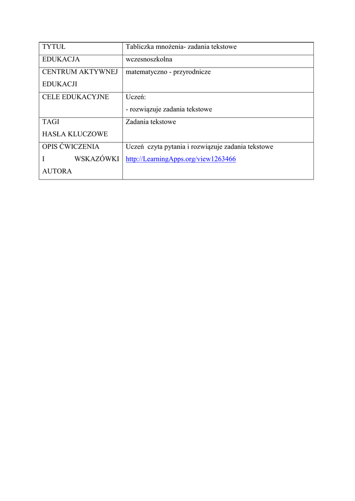 TYTUŁ Tabliczka mnożenia- zadania tekstowe EDUKACJA wczesnoszkolna CENTRUM AKTYWNEJ matematyczno - przyrodnicze EDUKACJI CELE EDUKACYJNE Uczeń: - rozwiązuje zadania tekstowe TAGI Zadania tekstowe HASŁA KLUCZOWE OPIS ĆWICZENIA I AUTORA Uczeń czyta pytania i rozwiązuje zadania tekstowe WSKAZÓWKI http://LearningApps.org/view1263466