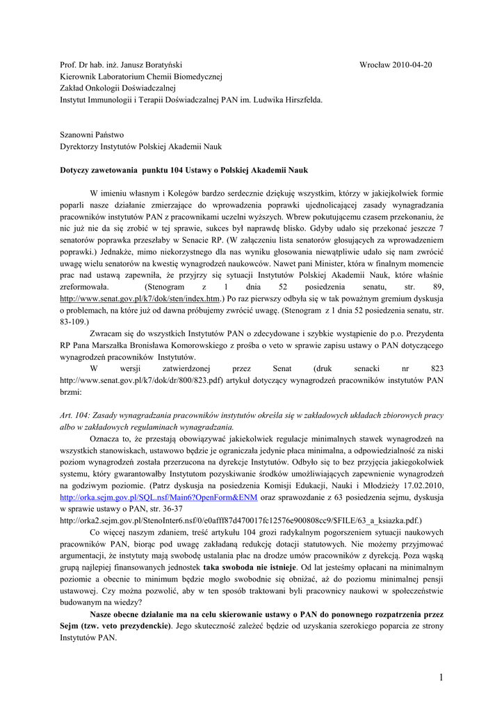Prof. Dr hab. inż. Janusz Boratyński Kierownik Laboratorium Chemii Biomedycznej Zakład Onkologii Doświadczalnej Instytut Immunologii i Terapii Doświadczalnej PAN im. Ludwika Hirszfelda. Wrocław 2010-04-20 Szanowni Państwo Dyrektorzy Instytutów Polskiej Akademii Nauk Dotyczy zawetowania punktu 104 Ustawy o Polskiej Akademii Nauk W imieniu własnym i Kolegów bardzo serdecznie dziękuję wszystkim, którzy w jakiejkolwiek formie poparli nasze działanie zmierzające do wprowadzenia poprawki ujednolicającej zasady wynagradzania pracowników instytutów PAN z pracownikami uczelni wyższych. Wbrew pokutującemu czasem przekonaniu, że nic już nie da się zrobić w tej sprawie, sukces był naprawdę blisko. Gdyby udało się przekonać jeszcze 7 senatorów poprawka przeszłaby w Senacie RP. (W załączeniu lista senatorów głosujących za wprowadzeniem poprawki.) Jednakże, mimo niekorzystnego dla nas wyniku głosowania niewątpliwie udało się nam zwrócić uwagę wielu senatorów na kwestię wynagrodzeń naukowców. Nawet pani Minister, która w finalnym momencie prac nad ustawą zapewniła, że przyjrzy się sytuacji Instytutów Polskiej Akademii Nauk, które właśnie zreformowała. (Stenogram z 1 dnia 52 posiedzenia senatu, str. 89, http://www.senat.gov.pl/k7/dok/sten/index.htm.) Po raz pierwszy odbyła się w tak poważnym gremium dyskusja o problemach, na które już od dawna próbujemy zwrócić uwagę. (Stenogram z 1 dnia 52 posiedzenia senatu, str. 83-109.) Zwracam się do wszystkich Instytutów PAN o zdecydowane i szybkie wystąpienie do p.o. Prezydenta RP Pana Marszałka Bronisława Komorowskiego z prośba o veto w sprawie zapisu ustawy o PAN dotyczącego wynagrodzeń pracowników Instytutów. W wersji zatwierdzonej przez Senat (druk senacki nr 823 http://www.senat.gov.pl/k7/dok/dr/800/823.pdf) artykuł dotyczący wynagrodzeń pracowników instytutów PAN brzmi: Art. 104: Zasady wynagradzania pracowników instytutów określa się w zakładowych układach zbiorowych pracy albo w zakładowych regulaminach wynagradzania. Oznacza to, że przestają obowiązywać jakiekolwiek regulacje minimalnych stawek wynagrodzeń na wszystkich stanowiskach, ustawowo będzie je ograniczała jedynie płaca minimalna, a odpowiedzialność za niski poziom wynagrodzeń została przerzucona na dyrekcje Instytutów. Odbyło się to bez przyjęcia jakiegokolwiek systemu, który gwarantowałby Instytutom pozyskiwanie środków umożliwiających zapewnienie wynagrodzeń na godziwym poziomie. (Patrz dyskusja na posiedzenia Komisji Edukacji, Nauki i Młodzieży 17.02.2010, http://orka.sejm.gov.pl/SQL.nsf/Main6?OpenForm&ENM oraz sprawozdanie z 63 posiedzenia sejmu, dyskusja w sprawie ustawy o PAN, str. 36-37 http://orka2.sejm.gov.pl/StenoInter6.nsf/0/e0afff87d470017fc12576e900808cc9/$FILE/63_a_ksiazka.pdf.) Co więcej naszym zdaniem, treść artykułu 104 grozi radykalnym pogorszeniem sytuacji naukowych pracowników PAN, biorąc pod uwagę zakładaną redukcję dotacji statutowych. Nie możemy przyjmować argumentacji, że instytuty mają swobodę ustalania płac na drodze umów pracowników z dyrekcją. Poza wąską grupą najlepiej finansowanych jednostek taka swoboda nie istnieje. Od lat jesteśmy opłacani na minimalnym poziomie a obecnie to minimum będzie mogło swobodnie się obniżać, aż do poziomu minimalnej pensji ustawowej. Czy można pozwolić, aby w ten sposób traktowani byli pracownicy naukowi w społeczeństwie budowanym na wiedzy? Nasze obecne działanie ma na celu skierowanie ustawy o PAN do ponownego rozpatrzenia przez Sejm (tzw. veto prezydenckie). Jego skuteczność zależeć będzie od uzyskania szerokiego poparcia ze strony Instytutów PAN. 1 Biorąc pod uwagę dyskusje w Senacie i wyniki głosowania, jesteśmy za przedstawieniem poprawki 32 (poprawka ś.p. Senator Fetlińskiej) która jest odpowiednikiem art.151 Ustawy o szkolnictwie wyższym i brzmi: art. 104 otrzymuje brzmienie: "Art. 104. Warunki wynagradzania za pracę i przyznawania innych świadczeń związanych z pracą dla pracowników instytutów określi, w drodze rozporządzenia, minister właściwy do spraw nauki w porozumieniu z ministrem właściwym do spraw pracy, ustalając wysokość minimalnej i maksymalnej stawki wynagrodzenia zasadniczego w odniesieniu do poszczególnych stanowisk oraz wysokość i warunki przyznawania innych składników wynagrodzenia tak, aby wysokość przeciętnego miesięcznego wynagrodzenia w instytucie, w poszczególnych grupach pracowników w relacji do kwoty bazowej określanej w ustawie budżetowej dla pracowników wymienionych w art. 5 pkt 1 lit. a ustawy z dnia 23 grudnia 1999 r. o kształtowaniu wynagrodzeń w państwowej sferze budżetowej oraz o zmianie niektórych ustaw (Dz. U. Nr 110, poz. 1255, z późn. zm.) nie była niższa: 1) w grupie stanowisk profesorów zwyczajnych – od 391,8 %, 2) w grupie stanowisk profesorów nadzwyczajnych, profesorów wizytujących i adiunktów - od 261,2 %, 3) w grupie stanowisk asystentów - od 130,6 %, 4) w grupie pozostałych pracowników - od 130,6 % - kwoty bazowej określanej w ustawie budżetowej, z uwzględnieniem zasady, że wysokość indywidualnych stawek poszczególnych składników wynagrodzenia pracowników instytutu ustala dyrektor."; Dlatego zwracam się do Państwa z apelem o pisemne poparcie wniosku o skierowanie do ponownego rozpatrzenia JEDNEGO zapisu ustawy o PAN -. artykułu 104. Idealną formą takiego poparcia byłaby uchwała Rady Naukowej (ewentualnie Prezydium). Jednak ze względu na bardzo ograniczony czas w jakim można złożyć wniosek, równie cenny będzie list podpisany przez dyrekcje i/lub pracowników i/lub związki zawodowe. Rada Naukowa Instytutu Immunologii poparła nasze wystąpienie do Senatu w tej sprawie. Pragnę raz jeszcze zaznaczyć, że nie negujemy całej ustawy. Po raz pierwszy od wielu lat rząd rozpoczął proces kompleksowej reformy nauki w Polsce. Zmiany idą w kierunku promocji najlep