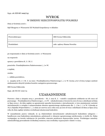 Sygn. akt XX GC 1097/13 WYROK W IMIENIU RZECZYPOSPOLITEJ POLSKIEJ Dnia 27 kwietnia 2016 r. Sąd Okręgowy w Warszawie XX Wydział Gospodarczy w składzie: Przewodniczący: SSO Iwona Falkowska Protokolant: sekr. sądowy Hanna Nowicka po rozpoznaniu w dniu 27 kwietnia 2016 r. w Warszawie na rozprawie sprawy z powództwa K. J. i M. J. przeciwko Przedsiębiorstwu Państwowemu (...) w W. o zapłatę orzeka: 1. oddala powództwo, 2. zasądza od K. J. i M. J. na rzecz Przedsiębiorstwa Państwowego (...) w W. kwotę 3 617 zł (trzy tysiące sześćset siedemnaście złotych) tytułem kosztów zastępstwa procesowego. SSO Iwona Falkowska Sygn. akt XX GC 1097/13 UZASADNIENIE Pozwem z dnia 2 sierpnia 2013 r. powodowie – M. J. oraz K. J. - wnieśli o zasądzenie solidarnie na ich rzecz od pozwanego - Przedsiębiorstwa Państwowego (...) w W. - odszkodowania w kwocie 60.000 zł wraz z odsetkami od dnia 21 lipca 2013 r. do dnia zapłaty za ograniczenie sposobu korzystania z nieruchomości, w tym zmniejszenie wartości nieruchomości w związku z ustanowieniem obszaru ograniczonego użytkowania dla (...) im. (...) w W. Uchwałą nr 76/11 Sejmiku Województwa (...) z dnia 20 czerwca 2011 roku oraz 40.000 zł wraz z odsetkami od dnia 21 lipca 2013 roku do dnia zapłaty tytułem rewitalizacji akustycznej budynków. W uzasadnieniu pozwu wskazali, że są właścicielami nieruchomości zabudowanych budynkiem usługowo – handlowym oraz budynkiem mieszkalnym, położonych w obszarze ograniczonego użytkowania, w strefie Z2. Hałas występujący na terenie należącym do powodów znacznie przekracza dopuszczalne normy. Przelatujące samoloty uniemożliwiają prowadzenie swobodnej rozmowy oraz swobodny wypoczynek w dzień i w nocy. W ocenie powodów aby zapewnić właściwy klimat akustyczny w budynkach konieczne jest poniesienie kosztów związanych z wymianą drzwi, okien, montażem rolet itp. Zapewnienie ciszy ciąży na powodach szczególnie, jako na pracodawcach. Powodowie wskazali, że ich roszczenia związane są z wprowadzeniem uchwały nr 76/11 Sejmiku Województwa (...) z 20 czerwca 2011 roku, która ograniczyła prawo ich własności (pozew, k.2 – 14). W odpowiedzi na pozew Przedsiębiorstwo Państwowe (...) wniosło o oddalenie powództwa w całości jako bezpodstawnego, a w szczególności z powodu upływu terminu zawitego na dochodzenie roszczeń. Według pozwanego nieruchomości powodów znajdowały się już uprzednio w obszarze ograniczonego użytkowania z 2007 r., a zatem możliwość wystąpienia z roszczeniami istniała już w chwili wejścia w życie rozporządzenia nr 50. Ponadto brak jest w stosunku do nieruchomości wprowadzenia nowych lub zwiększenia dotychczasowych ograniczeń na podstawie uchwały z 20 czerwca 2011 roku. Dodatkowo w ocenie pozwanego powodowie nie wykazali żadnej szkody, która powstałaby w związku z wprowadzeniem obszaru ograniczonego użytkowania, a która polegałaby na uniemożliwieniu lub istotnym ograniczeniu powodom możliwości korzystania z nieruchomości w sposób dotychczasowy lub zgodnie z dotychczasowym przeznaczeniem. Według pozwanego, strona powodowa nie wykazała również, że budynki nie posiadają właściwego klimatu akustycznego oraz że występują przekroczenia dopuszczalnych norm hałasu lotniczego powodujące konieczność przeprowadzenia rewitalizacji akustycznej budynku. Powodowie nie wykazali także, aby samo położenie nieruchomości w obszarze ograniczonego użytkowania powodowało spadek ich wartości. (odpowiedź na pozew, k.128 – 146) Sąd ustalił następujący stan faktyczny: Powodowie są właścicielami na zasadach majątkowej wspólności małżeńskiej - działki nr (...) z obrębu (...) o powierzchni 0.1227 ha, położonej w W., dzielnicy U., zabudowanej budynkami o łącznej powierzchni zabudowy wynoszącej 262m2, obejmującej budynek mieszkalny, dwukondygnacyjny o powierzchni zabudowy 137 m2, wybudowany w roku 1990, w którym obecnie mieszkają powodowie oraz budynek handlowo – usługowy, jednokondygnacyjny o powierzchni zabudowy 125 m2, przebudowany w 2001 roku z budynku gospodarczego i garażu. - działki nr (...) obrębu 8 O., o powierzchni 0.0800 ha, położnej w gminie M., na której usytuowany jest jednokondygnacyjny budynek o ujawnionej w rejestrze gruntów funkcji „inne mieszkalne”, stanowiący funkcjonalną część budynku usługowo – handlowego położonego na działce nr (...), jak i bezpośrednio do tego budynku przylegający o powierzchni zabudowy 106,37 m 2, dla której to nieruchomości Sąd Rejonowy w Pruszkowie, VI Wydział Ksiąg Wieczystych prowadzi księgę wieczystą numer (...). Pierwszą z działek, nr 98/6 (poprzedni numer ewidencyjny (...)) powodowie nabyli w 1987 roku. W 1990 roku ukończyli budowę domu jednorodzinnego, w którym mieszkają do dzisiaj. Dla nieruchomości Sąd Rejonowy dla (...) w W., XIII Wydział Ksiąg Wieczystych prowadzi księgę wieczystą numer (...). Natomiast działkę nr (...) powodowie nabyli w 1997 roku, a w 1999 roku wybudowali na niej budynek usługowo – handlowy, w którym prowadzą działalność gospodarczą, której przedmiotem jest sprzedaż hurtowa niewyspecjalizowana, sprzedaż gazów technicznych oraz transport drogowy. (okoliczności bezsporne, niekwestionowane twierdzenia powodów.4, odpis z księgi wieczystej nr (...), k.75 – 77 oraz (...), k. 71 - 74). W dniu 7 sierpnia 2007 r. zostało wydane rozporządzenie nr 50 Wojewody (...) w sprawie utworzenia obszaru ograniczonego użytkowania dla (...) im. (...) w W.. Przedmiotowe rozporządzenie wprowadzało pojęcie obszaru ograniczonego użytkowania. Utworzono wówczas strefę M wraz z granicami tego obszaru naniesionymi odpowiednio na mapę stanowiącą załącznik do tego rozporządzenia. Zarówno przebieg jak i opis granic strefy M oraz wykaz działek określały załączniki nr 4 i 5, 6. W § 4 ust. 1 rozporządzenia wskazano, iż w obszarze ograniczonego użytkowania zabrania się: 