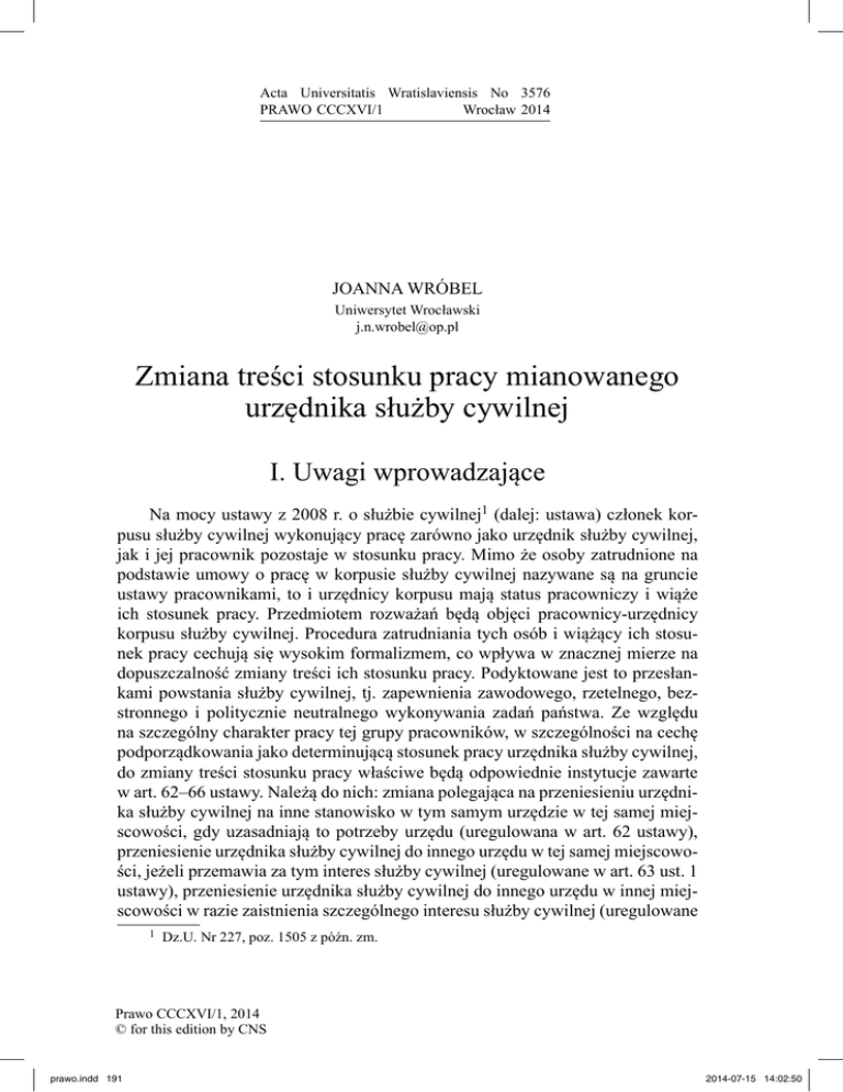 Acta Universitatis Wratislaviensis No 3576 PRAWO CCCXVI/1 Wrocław 2014 JOANNA WRÓBEL Uniwersytet Wrocławski [email protected] Zmiana treści stosunku pracy mianowanego urzędnika służby cywilnej I. Uwagi wprowadzające Na mocy ustawy z 2008 r. o służbie cywilnej1 (dalej: ustawa) członek korpusu służby cywilnej wykonujący pracę zarówno jako urzędnik służby cywilnej, jak i jej pracownik pozostaje w stosunku pracy. Mimo że osoby zatrudnione na podstawie umowy o pracę w korpusie służby cywilnej nazywane są na gruncie ustawy pracownikami, to i urzędnicy korpusu mają status pracowniczy i wiąże ich stosunek pracy. Przedmiotem rozważań będą objęci pracownicy-urzędnicy korpusu służby cywilnej. Procedura zatrudniania tych osób i wiążący ich stosunek pracy cechują się wysokim formalizmem, co wpływa w znacznej mierze na dopuszczalność zmiany treści ich stosunku pracy. Podyktowane jest to przesłankami powstania służby cywilnej, tj. zapewnienia zawodowego, rzetelnego, bezstronnego i politycznie neutralnego wykonywania zadań państwa. Ze względu na szczególny charakter pracy tej grupy pracowników, w szczególności na cechę podporządkowania jako determinującą stosunek pracy urzędnika służby cywilnej, do zmiany treści stosunku pracy właściwe będą odpowiednie instytucje zawarte w art. 62–66 ustawy. Należą do nich: zmiana polegająca na przeniesieniu urzędnika służby cywilnej na inne stanowisko w tym samym urzędzie w tej samej miejscowości, gdy uzasadniają to potrzeby urzędu (uregulowana w art. 62 ustawy), przeniesienie urzędnika służby cywilnej do innego urzędu w tej samej miejscowości, jeżeli przemawia za tym interes służby cywilnej (uregulowane w art. 63 ust. 1 ustawy), przeniesienie urzędnika służby cywilnej do innego urzędu w innej miejscowości w razie zaistnienia szczególnego interesu służby cywilnej (uregulowane 1 Dz.U. Nr 227, poz. 1505 z późn. zm. Prawo CCCXVI/1, 2014 © for this edition by CNS prawo.indd 191 2014-07-15 14:02:50 192 JOANNA WRÓBEL w art. 63 ust. 2 ustawy), przeniesienie urzędnika do innego urzędu w tej samej lub innej miejscowości w razie likwidacji urzędu, w którym urzędnik służby cywilnej wykonuje pracę, lub reorganizacji tego urzędu w sposób uniemożliwiający dalsze zatrudnienie urzędnika służby cywilnej (uregulowane w art. 66 ustawy) oraz przeniesienie członka korpusu służby cywilnej do innego urzędu, także w innej miejscowości, na jego wniosek lub za jego zgodą (uregulowane w art. 64 ustawy). Samo pojęcie zmiany treści stosunku pracy może być ujmowane na dwóch płaszczyznach. W ujęciu szerokim zmianę treści stosunku pracy należy definiować jako wszelkie modyfikacje zachodzące po jego nawiązaniu, a dotyczące różnorakich zmian elementów składających się na treść stosunku pracy, tj. zmiany podmiotowe, zmiany ściśle treściowe oraz zmiany w zakresie podstawy prawnej, jak też zmiany, które nie polegają na uszczupleniu praw czy zwiększeniu obowiązków, ale na istotnej zmianie sytuacji rzeczywistej pracownika. Znaczenie węższe oznaczać będzie nic innego, jak zastąpienie jednego z dotychczasowych elementów innym lub też jego wyeliminowanie z treści stosunku pracy. Jak przyjmuje się w doktrynie, wskazane zmiany mogą dotyczyć wyłącznie stosunków trwałych, chociaż istnieją także odmienne poglądy w tym zakresie2. Akcentowane jest też stanowisko, zgodnie z którym za zmiany treści stosunku pracy uważa się jedynie zmiany konstytutywne, czyli takie, które tworzą dla stron nową sytuację prawną, trwałe, tj. nadające zmienionym elementom treści stosunku pracy taką samą moc jak elementy ukształtowane przy zawarciu stosunku pracy oraz następujące po jego nawiązaniu3. Przy tak rozumianym ujęciu zmiany treści stosunku pracy z zakresu tego pojęcia wyklucza się jednostronne powierzenie przez pracodawcę pracy w trybie art. 42 § 4 kodeksu pracy. W rozważanych tu kwestiach będą to zmiany odnośnie do miejsca wykonywania pracy lub wynagrodzenia. Modyfikacje nie obejmują jednak zmiany podmiotowej rozumianej jako zmiana osoby pracownika4. Zmiana treści stosunku pracy w znaczeniu węższym polega na włączeniu do dotychczas trwającego stosunku pracy nowych praw i obowiązków albo ograniczeniu, rozszerzeniu względnie zastąpieniu ich innymi5. Rozumienie węższe utożsamiane jest często, w odniesieniu do umownych stosunków pracy, z kierownictwem pracodawcy, a co za tym idzie — możliwością jednostronnego modyfikowania treści stosunku pracy, która jest realizowana bez konieczności stosowania unormowań w zakresie wypowiedzenia zmieniającego zawartego w dyspozycji art. 42 kodeksu pracy. Ze względu jednak na szczególny nominacyj2 Por. J. Stelina, Charakter prawny stosunku pracy z mianowania, Gdańsk 2005, s. 141–142. Por. T. Bińczyka-Majewska, Zmiana treści umownego stosunku pracy, Warszawa 1985, s. 13–15. 4 Por. A. Dubowik, Ł. Pisarczyk, Prawo urzędnicze, Warszawa 2011, s. 206. 5 Por. A. Dubowik, Zmiana treści stosunku pracy z mianowania — wybrane zagadnienia, „Praca i Zabezpieczenie Społeczne” 1998, nr 7–8, s. 12. 3 Prawo CCCXVI/1, 2014 © for this edition by CNS prawo.indd 192 2014-07-15 14:02:50 Zmiana treści stosunku pracy mianowanego urzędnika służby cywilnej 193 ny charakter stosunku pracy urzędników służby cywilnej pojęcie zmiany w ujęciu wąskim nie ma szerszego zastosowania, zwłaszcza zaś z powodu szerokiego i bardziej restrykcyjnego wachlarza modyfikacji przewidzianego przepisami ustawy o służbie cywilnej niż ten określony w kodeksie pracy6. Umowne stosunki pracy, do których zastosowanie znajdują przepisy kodeksu pracy, w tym w odniesieniu do zmiany treści stosunku pracy — art. 42 kodeksu pracy, przewidują możliwość zakończenia stosunku pracy w razie niezaakceptowania przedstawionych przez pracodawcę nowych warunków pracy czy płacy po upływie określ