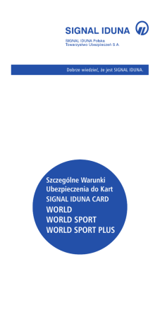 Dobrze wiedzieć, że jest SIGNAL IDUNA. Szczególne Warunki Ubezpieczenia do Kart SIGNAL IDUNA CARD WORLD WORLD SPORT WORLD SPORT PLUS SIGNAL IDUNA Polska Towarzystwo Ubezpieczeń S.A. ul. Przyokopowa 31, 01-208 Warszawa, ubezpiecza posiadaczy SIGNAL IDUNA CARD (Karta SIC) w wariantach Karta SIC WORLD, Karta SIC WORLD SPORT oraz Karta SIC WORLD SPORT PLUS Posiadacze Kart SIC WORLD ubezpieczeni są od kosztów leczenia wraz z assistance, odpowiedzialności cywilnej w życiu prywatnym oraz odpowiedzialności cywilnej związanej z amatorskim uprawianiem sportu i kosztów ratownictwa w czasie podróży zagranicznej do wszystkich państw świata, z wyłączeniem USA i Kanady, oraz od następstw nieszczęśliwych wypadków na terenie całego świata (także na terenie Rzeczypospolitej Polskiej, USA i Kanady) w okresie ważności Karty. Posiadacze Kart SIC WORLD SPORT oraz Kart SIC WORLD SPORT PLUS ubezpieczeni są od kosztów leczenia wraz z assistance, następstw nieszczęśliwych wypadków, odpowiedzialności cywilnej w życiu prywatnym oraz odpowiedzialności cywilnej związanej z uprawianiem sportu i kosztów ratownictwa w czasie podróży zagranicznej do wszystkich państw świata, z wyłączeniem USA i Kanady, oraz od następstw nieszczęśliwych wypadków na terenie całego świata (także na terenie Rzeczypospolitej Polskiej, USA i Kanady) w okresie ważności Karty. Posiadacze Kart SIC WORLD SPORT są objęci ochroną ubezpieczeniową podczas amatorskiego uprawiania sportu oraz uprawiania sportów zimowych i sportów wysokiego ryzyka. Posiadacze Kart SIC WORLD SPORT PLUS są objęci ochroną ubezpieczeniową podczas amatorskiego uprawiania sportu, uprawiania sportów zimowych i sportów wysokiego ryzyka oraz sportów wyczynowych. Szczegółowe definicje sportów (amatorskich, zimowych, wysokiego ryzyka i wyczynowych) sformułowane są w Szczególnych Warunkach Ubezpieczenia. Należy zapoznać się z Warunkami Ubezpieczenia dla posiadaczy Kart SIC w wariantach WORLD, WORLD SPORT oraz WORLD SPORT PLUS. 2 Poniższa instrukcja jest jedynie materiałem pomocniczym. 1. Podczas pobytu za granicą: W przypadku zdarzenia (nagłego zachorowania, nieszczęśliwego wypadku lub zdarzenia mogącego skutkować roszczeniem z tytułu odpowiedzialności cywilnej) należy skontaktować się niezwłocznie z: Centralą Alarmowa: tel.: + 48 (22) 864 55 26 fax: + 48 (22) 575 95 75 sms: + 48 661 000 888 Centrala Alarmowa czynna jest 7 dni w tygodniu 24h, obsługa jest w języku polskim. Numer telefonu do Centrali Alarmowej jest zapisany na odwrocie każdej Karty SIC. Centrala Alarmowa przejmie organizację wizyty lekarskiej, potwierdzenie kosztów leczenia, organizację transportu i innych świadczeń assistance służących pomocy Ubezpieczonemu. Należy postępować zgodnie ze wskazaniami konsultantów. UWAGA !!!! Ubezpieczony zobowiązany jest niezwłocznie zgłosić zaistnienie zdarzenia objętego ochroną ubezpieczeniową do Centrali Alarmowej! 2. Po powrocie do Polski: W przypadku zdarzeń (nagłego zachorowania, nieszczęśliwego wypadku lub zdarzenia mogącego skutkować roszczeniem z tytułu odpowiedzialności cywilnej) po powrocie do Polski, Ubezpieczony zobowiązany jest do wypełnienia i podpisania druku zgłoszenia szkody (dostępnego na stronie internetowej: www.signal-iduna.pl) oraz przesłania go wraz z załączonymi oryginalnymi rachunkami i wymaganą dokumentacją (każdorazowo wskazana w druku zgłoszenia szkody) drogą korespondencyjną na adres: SIGNAL IDUNA Polska Towarzystwo Ubezpieczeń S.A. Biuro Obsługi Roszczeń ul. Przyokopowa 31, 01-208 Warszawa tel.: + 48 22 505 61 60 3.W przypadku nieszczęśliwego wypadku, który miał miejsce na terenie Polski, USA lub Kanady Ubezpieczony powinien: •bezpośrednio po nieszczęśliwym wypadku zgłosić się do lekarza i uzyskać zaświadczenie zawierające opis odniesionych obrażeń ciała, diagnozę lekarską, •zachować pełną dokumentację lekarską i wszystkie wyniki badań dotyczące nieszczęśliwego wypadku, •pobrać ze strony internetowej druk „zgłoszenia szkody z ubezpieczenia NNW”, •po zakończonym leczeniu i rehabilitacji, przesłać dokładnie wypełniony druk „zgłoszenia szkody z ubezpieczenia NNW” wraz z pełną dokumentacją medyczną na adres: SIGNAL IDUNA Polska Towarzystwo Ubezpieczeń S.A. Biuro Obsługi Roszczeń ul. Przyokopowa 31, 01-208 Warszawa tel.: + 48 22 505 61 60 3 Spis treści Postanowienia ogólne str 5 Definicje str 6 Zawarcie umowy ubezpieczenia str 9 Okres ubezpieczenia i zakres terytorialny ubezpieczenia str 9 Suma ubezpieczenia str 9 Ubezpieczenie kosztów leczenia i assistance (kod ryzyka KL) Przedmiot ubezpieczenia str 12 Ubezpieczenie kosztów ratownictwa (kod ryzyka KR) str 15 Ograniczenia odpowiedzialności str 15 Ubezpieczenie następstw nieszczęśliwych wypadków (kod ryzyka NNW) Przedmiot ubezpieczenia str 17 Tabela świadczeń następstw nieszczęśliwych wypadków str 18 Ograniczenia odpowiedzialności str 22 Postępowanie w razie nagłego zachorowania lub nieszczęśliwego wypadku str 24 Ubezpieczenie odpowiedzialności cywilnej (kod ryzyka OC) Przedmiot ubezpieczenia str 24 Ograniczenia odpowiedzialności str 25 Postępowanie w razie zaistnienia szkody z ubezpieczenia odpowiedzialności cywilnej str 26 Ustalenie i wypłata świadczenia/odszkodowania str 27 Termin wypłaty świadczenia str 29 Sposób rozpatrywania odwołań, skarg i wniosków str 29 Roszczenia regresowe str 30 Postanowienia końcowe str 30 Certyfikat Ubezpieczenia str 32 4 SZCZEGÓLNE WARUNKI UBEZPIECZENIA DO KART SIGNAL IDUNA CARD WORLD, WORLD SPORT, WORLD SPORT PLUS POSTANOWIENIA OGÓLNE § 1. 1.Na podstawie niniejszych Szczególnych Warunków Ubezpieczenia, zwanych dalej SWU, SIGNAL IDUNA Polska Towarzystwo Ubezpieczeń Spółka Akcyjna, zwane dalej „SIGNAL IDUNA Polska TU S.A.” udziela wszystkim posiadaczom kart SIGNAL IDUNA CARD (SIC) w wersji WORLD lub WORLD SPORT lub WORLD SPORT PLUS, zwanych dalej