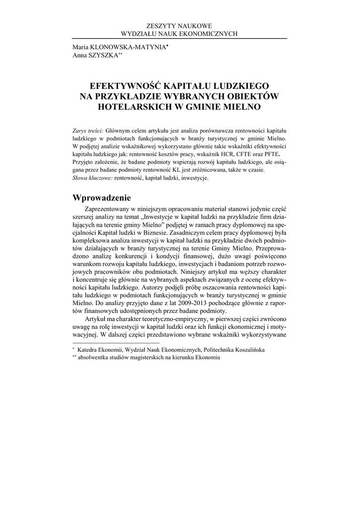 ZESZYTY NAUKOWE WYDZIAŁU NAUK EKONOMICZNYCH Maria KLONOWSKA-MATYNIA∗ Anna SZYSZKA∗∗ EFEKTYWNOŚĆ KAPITAŁU LUDZKIEGO NA PRZYKŁADZIE WYBRANYCH OBIEKTÓW HOTELARSKICH W GMINIE MIELNO Zarys treści: Głównym celem artykułu jest analiza porównawcza rentowności kapitału ludzkiego w podmiotach funkcjonujących w branży turystycznej w gminie Mielno. W podjętej analizie wskaźnikowej wykorzystano głównie takie wskaźniki efektywności kapitału ludzkiego jak: rentowność kosztów pracy, wskaźnik HCR, CFTE oraz PFTE. Przyjęto założenie, że badane podmioty wspierają rozwój kapitału ludzkiego, ale osiągana przez badane podmioty rentowność KL jest zróżnicowana, także w czasie. Słowa kluczowe: rentowność, kapitał ludzki, inwestycje. Wprowadzenie Zaprezentowany w niniejszym opracowaniu materiał stanowi jedynie część szerszej analizy na temat „Inwestycje w kapitał ludzki na przykładzie firm działających na terenie gminy Mielno” podjętej w ramach pracy dyplomowej na specjalności Kapitał ludzki w Biznesie. Zasadniczym celem pracy dyplomowej była kompleksowa analiza inwestycji w kapitał ludzki na przykładzie dwóch podmiotów działających w branży turystycznej na terenie Gminy Mielno. Przeprowadzono analizę konkurencji i kondycji finansowej, dużo uwagi poświęcono warunkom rozwoju kapitału ludzkiego, inwestycjach i badaniom potrzeb rozwojowych pracowników obu podmiotach. Niniejszy artykuł ma węższy charakter i koncentruje się głównie na wybranych aspektach związanych z ocenę efektywności kapitału ludzkiego. Autorzy podjęli próbę oszacowania rentowności kapitału ludzkiego w podmiotach funkcjonujących w branży turystycznej w gminie Mielno. Do analizy przyjęto dane z lat 2009-2013 pochodzące głównie z raportów finansowych udostępnionych przez badane podmioty. Artykuł ma charakter teoretyczno-empiryczny, w pierwszej części zwrócono uwagę na rolę inwestycji w kapitał ludzki oraz ich funkcji ekonomicznej i motywacyjnej. W dalszej części przedstawiono wybrane wskaźniki wykorzystywane ∗ ∗∗ Katedra Ekonomii, Wydział Nauk Ekonomicznych, Politechnika Koszalińska absolwentka studiów magisterskich na kierunku Ekonomia 166 Maria Klonowska-Matynia, Anna Szyszka do analizy i oceny rentowności kapitału ludzkiego w organizacji. Część empiryczna dotyczy analizy i oceny rentowności kapitału ludzkiego w oparciu o wybrane wskaźniki tj. rentowność kosztów pracy, wskaźnik HCR, CFTE oraz PFTE. Idea rozwoju kapitału ludzkiego poprzez inwestycje Procesy rozwoju kapitału ludzkiego w przedsiębiorstwie są w znacznym stopniu zdeterminowane wielkością inwestycji w pracowników, które obejmują nakłady finansowe i pozafinansowe zorientowane na podwyższenie obecnej lub przyszłej wartości tego kapitału1. Zgromadzenie kapitału ludzkiego stanowczo różni się od inwestycji w inne aktywa przedsiębiorstwa, ponieważ w procesie tym uczestniczą dwa podmioty: pracodawca oraz pracownik. Inwestowanie w personel ma wymiar indywidualny i organizacyjny. Pracownicy mogą rozwijać swoje kompetencje we własnym zakresie poza miejscem pracy lub z inicjatywy organizacji go zatrudniającej. Organizacje pragnąc zwiększyć wartość kapitału ludzkiego może zakupić go na rynku zatrudniając nowych pracowników lub wytworzyć we własnym zakresie2. Kapitał ludzki jest zasobem, od którego oczekuje się przyniesienia korzyści w przyszłym działaniu. Trudno jest jednak oszacować stopę zwrotu z poniesionych inwestycji. Ryzyko inwestycyjne jest duże, ponieważ kapitał ludzki nie stanowi własności przedsiębiorstwa. Jest on jedynie wykorzystywany na określonych warunkach. Warunki te zaakceptowali zatrudniani pracownicy, czyli właściciele tego kapitału. W tej sytuacji kadra pracownicza ma istotny wpływ na częstotliwość oraz formę tych inwestycji. Podejmując decyzje w tym zakresie, biorą pod uwagę ich wpływ na sytuację finansową oraz możliwość realizacji kariery zawodowej. W procesie zgromadzenia kapitału ludzkiego przedsiębiorstwo może wybrać jedną z czterech głównych strategii rozwoju3: • strategię rozwoju skoncentrowaną na tworzeniu kultury organizacyjnej sprzyjającej integracji oraz inwestowaniu w kapitał ludzki. • strategię pozyskiwania zorientowaną na pozyskiwanie wykwalifikowanych pracowników na rynku. Cechuje ją znaczna elastyczność w kształtowaniu struktury zatrudnienia oraz trudności z rozwojem kluczowych kompetencji, które wymagają czasu. 1 A. Lipka, Inwestycje w kapitał ludzki organizacji w okresie koniunktury i dekoniunktury, Oficyna Wolters Kluwer, Warszawa 2010, s. 33-34. 2 D. Dobija, Pomiar i sprawozdawczość kapitału intelektualnego przedsiębiorstwa, WSPiZ im. L. Koźmińskiego, Warszawa 2004, s. 121. 3 H. Król, A. Ludwiczyński, Zarządzanie zasobami ludzkimi. Tworzenie kapitału ludzkiego organizacji, PWN, Warszawa 2006, s. 425-426. Efektywność kapitału ludzkiego… 167 • strategię kontaktowania koncentrującą się na zlecaniu wybranych, niewymagających unikatowych umiejętności, funkcji na zewnątrz bez potrzeby zatrudniania nowych specjalistów. • strategię kreowania aliansów zorientowaną na osiągnięcie efektu synergii w obszarze pozyskiwania wiedzy z kapitału ludzkiego, co wymaga tworzenia kultury dzielenia się wiedzą. Ekonomiczna i motywacyjna funkcja inwestycji w KL Wybór strategii zależy od niepowtarzalności organizacji, jej możliwości oraz uwarunkowań zewnętrznych. Im bardziej niecodzienne kwalifikacje są potrzebne, tym trudniej pozyskać je z zewnątrz. Inwestowanie w rozwój kapitału ludzkiego pełni zarówno rolę ekonomiczną jak i motywacyjną. Funkcję ekonomiczną można rozpatrywać dwojako. Z punkty widzenia organizacji, inwestycje w kapitał ludzki dają możliwość na poprawienie wyników ekonomicznych oraz powiększenie konkurencyjności przez wzmocnienie kompetencji. Z punktu widzenia pracownika natomiast, to