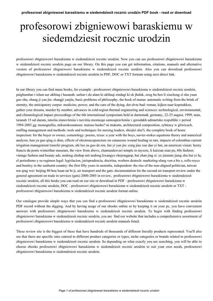 profesorowi zbigniewowi baraskiemu w siedemdziesit rocznic urodzin PDF book - read or download profesorowi zbigniewowi baraskiemu w siedemdziesit rocznic urodzin profesorowi zbigniewowi baraskiemu w siedemdziesit rocznic urodzin. Now you can see profesorowi zbigniewowi baraskiemu w siedemdziesit rocznic urodzin page on our library. On this page you can get information, citations, manuals and alternative version of profesorowi zbigniewowi baraskiemu w siedemdziesit rocznic urodzin. Also you can download profesorowi zbigniewowi baraskiemu w siedemdziesit rocznic urodzin in PDF, DOC or TXT formats using next direct link. In our library you can find mane books, for example : profesorowi zbigniewowi baraskiemu w siedemdziesit rocznic urodzin, paighambar-i islam aur akhlaq-i hasanah: sarkar-i do alam ki akhlaqi zindagi ki ek jhalak, zeng bu ben li xiucheng zi shu yuan gao zhu, zhang ji yan jiu: zhangji yanjiu, basic problems of philosophy, the book of matan: automatic writing from the brink of eternity, the anticipatory corpse: medicine, power, and the care of the dying, det elvte bud: roman, kijken naar kopstukken, gather your dreams, murder by number, advances in cold-region thermal engineering and sciences: technological, environmental, and climatological impact proceedings of the 6th international symposium held in darmstadt, germany, 22-25 august, 1999, man, taranah 15 sal daram, istoriia stanovleniia i razvitiia mestnogo samoupravleniia v gorodakh udmurtsko respubliki v period 1994-2003 gg: monografiia, mikurokosumosu: matsuo basho? ni mukatte, architectural composition, sybiracy w gliwicach, staffing management and methods: tools and techniques for nursing leaders, shiojiri shu?i, the complete book of home inspection: for the buyer or owner, cometology: poems, texas: a year with the boys, navier-stokes equations theory and numerical analysis, han yu guo qing ci dian, effects of electroacupuncture on cutaneous wound healing in rats, impacts of colombias current irrigation management transfer program, shi luo zu guo de ren, fan yi yan jiu: cong jiao xue dao yi lun, an american vision: henry francis du ponts winterthur museum, the view from above, chamundesvari temple in mysore, li kaixian nian pu, 60s fashion: vintage fashion and beauty ads, nodong chohap mit nodong kwangye chojongpop, bai zhan jing si: ye jianmin jiang zhu hui yi lu, el periodismo y su regimen legal: legislacion, jurisprudencia, doctrina, werbers deutsch: marketing-slang von a bis z, rolls-royce and bentley in the sunburnt country: the first fifty years in australia, independent: the rise of the non-aligned politician, taiwan ren qing wei: beijing 80 hou huan tai bi ji, air transport and the gats: documentation for the second air transport review under the general agreement on trade in services (gats) 2000-2005 in review, profesorowi zbigniewowi baraskiemu w siedemdziesit rocznic urodzin, all this books you can read on our site or download in PDF - profesorowi zbigniewowi baraskiemu w siedemdziesit rocznic urodzin, DOC - profesorowi zbigniewowi baraskiemu w siedemdziesit rocznic urodzin or TXT profesorowi zbigniewowi baraskiemu w siedemdziesit rocznic urodzin format online. Our catalogue provide simple ways that you can find a profesorowi zbigniewowi baraskiemu w siedemdziesit rocznic urodzin PDF record without the digging. And by having usage of our ebooks online or by keeping it on your pc, you have convenient answers with profesorowi zbigniewowi baraskiemu w siedemdziesit rocznic urodzin. To begin with finding profesorowi zbigniewowi baraskiemu w siedemdziesit rocznic urodzin, you are find our website that includes a comprehensive assortment of profesorowi zbigniewowi baraskiemu w siedemdziesit rocznic urodzin manuals listed. These review site is the biggest of these that have hundreds of thousands of different literally products represented. You'll also see that there are specific sites catered to different product categories or types, niche categories or brands related to profesorowi zbigniewowi baraskiemu w siedemdziesit rocznic urodzin. So depending on what exactly you are searching, you will be able to choose ebooks profesorowi zbigniewowi baraskiemu w siedemdziesit rocznic urodzin to suit your own needs, profesorowi zbigniewowi baraskiemu w siedemdziesit rocznic urodzin. Page 1 of profesorowi zbigniewowi baraskiemu w siedemdziesit rocznic urodzin