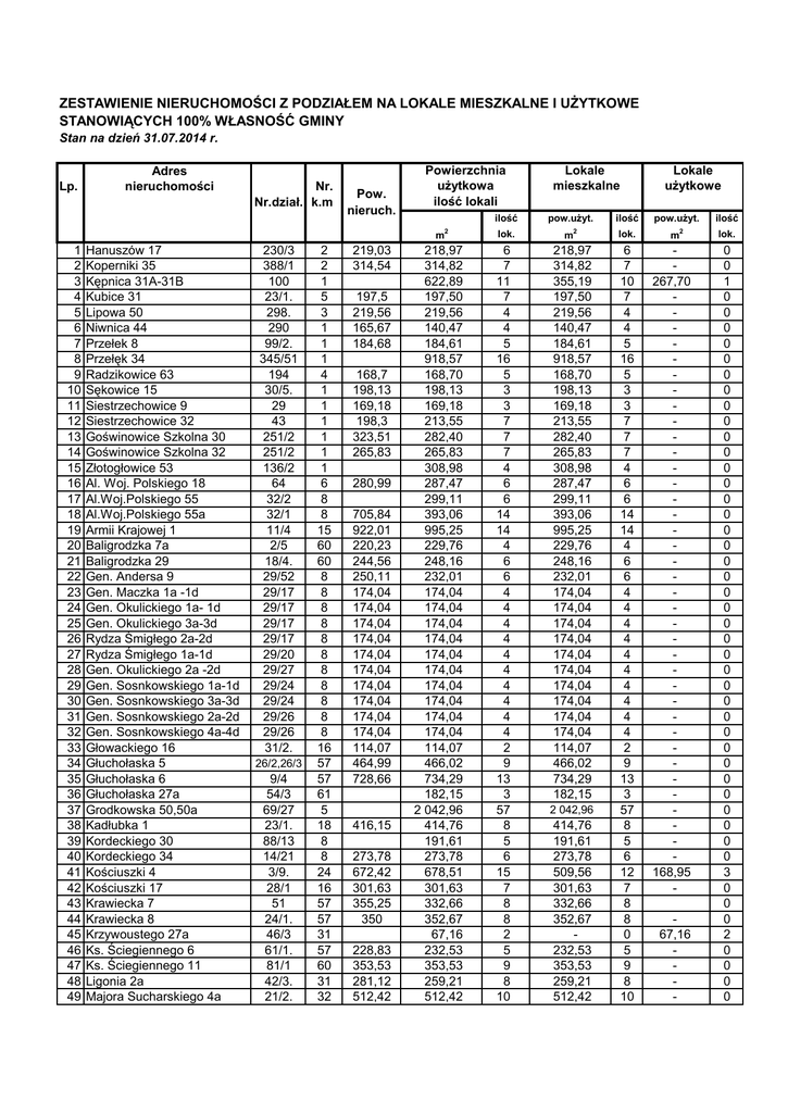 ZESTAWIENIE NIERUCHOMOŚCI Z PODZIAŁEM NA LOKALE MIESZKALNE I UŻYTKOWE STANOWIĄCYCH 100% WŁASNOŚĆ GMINY Stan na dzień 31.07.2014 r. Lp. Adres nieruchomości Nr. Nr.dział. k.m Pow. nieruch. Powierzchnia użytkowa ilość lokali ilość 2 1 2 3 4 5 6 7 8 9 10 11 12 13 14 15 16 17 18 19 20 21 22 23 24 25 26 27 28 29 30 31 32 33 34 35 36 37 38 39 40 41 42 43 44 45 46 47 48 49 Hanuszów 17 Koperniki 35 Kępnica 31A-31B Kubice 31 Lipowa 50 Niwnica 44 Przełek 8 Przełęk 34 Radzikowice 63 Sękowice 15 Siestrzechowice 9 Siestrzechowice 32 Goświnowice Szkolna 30 Goświnowice Szkolna 32 Złotogłowice 53 Al. Woj. Polskiego 18 Al.Woj.Polskiego 55 Al.Woj.Polskiego 55a Armii Krajowej 1 Baligrodzka 7a Baligrodzka 29 Gen. Andersa 9 Gen. Maczka 1a -1d Gen. Okulickiego 1a- 1d Gen. Okulickiego 3a-3d Rydza Śmigłego 2a-2d Rydza Śmigłego 1a-1d Gen. Okulickiego 2a -2d Gen. Sosnkowskiego 1a-1d Gen. Sosnkowskiego 3a-3d Gen. Sosnkowskiego 2a-2d Gen. Sosnkowskiego 4a-4d Głowackiego 16 Głuchołaska 5 Głuchołaska 6 Głuchołaska 27a Grodkowska 50,50a Kadłubka 1 Kordeckiego 30 Kordeckiego 34 Kościuszki 4 Kościuszki 17 Krawiecka 7 Krawiecka 8 Krzywoustego 27a Ks. Ściegiennego 6 Ks. Ściegiennego 11 Ligonia 2a Majora Sucharskiego 4a 230/3 388/1 100 23/1. 298. 290 99/2. 345/51 194 30/5. 29 43 251/2 251/2 136/2 64 32/2 32/1 11/4 2/5 18/4. 29/52 29/17 29/17 29/17 29/17 29/20 29/27 29/24 29/24 29/26 29/26 31/2. 26/2,26/3 9/4 54/3 69/27 23/1. 88/13 14/21 3/9. 28/1 51 24/1. 46/3 61/1. 81/1 42/3. 21/2. 2 2 1 5 3 1 1 1 4 1 1 1 1 1 1 6 8 8 15 60 60 8 8 8 8 8 8 8 8 8 8 8 16 57 57 61 5 18 8 8 24 16 57 57 31 57 60 31 32 219,03 314,54 197,5 219,56 165,67 184,68 168,7 198,13 169,18 198,3 323,51 265,83 280,99 705,84 922,01 220,23 244,56 250,11 174,04 174,04 174,04 174,04 174,04 174,04 174,04 174,04 174,04 174,04 114,07 464,99 728,66 416,15 273,78 672,42 301,63 355,25 350 228,83 353,53 281,12 512,42 m lok. 218,97 314,82 622,89 197,50 219,56 140,47 184,61 918,57 168,70 198,13 169,18 213,55 282,40 265,83 308,98 287,47 299,11 393,06 995,25 229,76 248,16 232,01 174,04 174,04 174,04 174,04 174,04 174,04 174,04 174,04 174,04 174,04 114,07 466,02 734,29 182,15 2 042,96 414,76 191,61 273,78 678,51 301,63 332,66 352,67 67,16 232,53 353,53 259,21 512,42 6 7 11 7 4 4 5 16 5 3 3 7 7 7 4 6 6 14 14 4 6 6 4 4 4 4 4 4 4 4 4 4 2 9 13 3 57 8 5 6 15 7 8 8 2 5 9 8 10 Lokale mieszkalne pow.użyt. 2 m 218,97 314,82 355,19 197,50 219,56 140,47 184,61 918,57 168,70 198,13 169,18 213,55 282,40 265,83 308,98 287,47 299,11 393,06 995,25 229,76 248,16 232,01 174,04 174,04 174,04 174,04 174,04 174,04 174,04 174,04 174,04 174,04 114,07 466,02 734,29 182,15 2 042,96 414,76 191,61 273,78 509,56 301,63 332,66 352,67 232,53 353,53 259,21 512,42 Lokale użytkowe ilość lok. 6 7 10 7 4 4 5 16 5 3 3 7 7 7 4 6 6 14 14 4 6 6 4 4 4 4 4 4 4 4 4 4 2 9 13 3 57 8 5 6 12 7 8 8 0 5 9 8 10 pow.użyt. 2 m 267,70 168,95 67,16 - ilość lok. 0 0 1 0 0 0 0 0 0 0 0 0 0 0 0 0 0 0 0 0 0 0 0 0 0 0 0 0 0 0 0 0 0 0 0 0 0 0 0 0 3 0 0 0 2 0 0 0 0 50 51 52 53 54 55 56 57 58 59 60 Mariacka 12a Marii Merkert 12a Podolska 2 Podolska 22 Pomorska 18 Sanocka 2 Słowiańska 29-29a Słowiańska 31 Strzelców Bytomskich 6 Unii Lubelskiej 5 Zamojskiego 1 RAZEM 30/31 79 2/16 8/7 12/1. 62 92 93/1 126/3 25/1. 62/5 32 207,86 17 179,57 42 41 217,6 53 280,8 61 189,03 17 427,64 17 1568,43 36-4 184,84 54 319,45 22/1 196,48 179,57 273,82 228,10 302,84 168,20 427,64 1 590,08 176,27 318,47 301,01 3 2 5 6 6 4 8 25 5 8 5 196,48 86,70 273,82 228,10 302,84 168,20 427,64 1 590,08 176,27 318,47 301,01 3 1 5 6 6 4 8 25 5 8 5 92,87 - 0 1 0 0 0 0 0 0 0 0 0 20 521,82 444 19 925,14 437 596,68 7