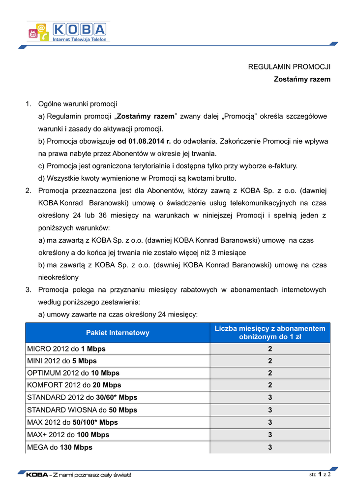 REGULAMIN PROMOCJI Zostańmy razem 1. Ogólne warunki promocji a) Regulamin promocji „Zostańmy razem” zwany dalej „Promocją” określa szczegółowe warunki i zasady do aktywacji promocji. b) Promocja obowiązuje od 01.08.2014 r. do odwołania. Zakończenie Promocji nie wpływa na prawa nabyte przez Abonentów w okresie jej trwania. c) Promocja jest ograniczona terytorialnie i dostępna tylko przy wyborze e-faktury. d) Wszystkie kwoty wymienione w Promocji są kwotami brutto. 2. Promocja przeznaczona jest dla Abonentów, którzy zawrą z KOBA Sp. z o.o. (dawniej KOBA Konrad Baranowski) umowę o świadczenie usług telekomunikacyjnych na czas określony 24 lub 36 miesięcy na warunkach w niniejszej Promocji i spełnią jeden z poniższych warunków: a) ma zawartą z KOBA Sp. z o.o. (dawniej KOBA Konrad Baranowski) umowę na czas określony a do końca jej trwania nie zostało więcej niż 3 miesiące b) ma zawartą z KOBA Sp. z o.o. (dawniej KOBA Konrad Baranowski) umowę na czas nieokreślony 3. Promocja polega na przyznaniu miesięcy rabatowych w abonamentach internetowych według poniższego zestawienia: a) umowy zawarte na czas określony 24 miesięcy: Pakiet Internetowy Liczba miesięcy z abonamentem obniżonym do 1 zł MICRO 2012 do 1 Mbps 2 MINI 2012 do 5 Mbps 2 OPTIMUM 2012 do 10 Mbps 2 KOMFORT 2012 do 20 Mbps 2 STANDARD 2012 do 30/60* Mbps 3 STANDARD WIOSNA do 50 Mbps 3 MAX 2012 do 50/100* Mbps 3 MAX+ 2012 do 100 Mbps 3 MEGA do 130 Mbps 3 str. 1 z 2 b) umowy zawarte na czas określony 36 miesięcy Pakiet Internetowy Liczba miesięcyz abonamentem obniżonym do 1 zł MICRO 2012 do 1 Mbps 4 MINI 2012 do 5 Mbps 4 OPTIMUM 2012 do 10 Mbps 4 KOMFORT 2012 do 20 Mbps 4 STANDARD 2012 do 30/60* Mbps 6 STANDARD WIOSNA do 50 Mbps 6 MAX 2012 do 50/100* Mbps 6 MAX+ 2012 do 100 Mbps 6 MEGA do 130 Mbps 6 4. W przypadku rozwiązania Umowy przez KOBA Sp. z o.o. (dawniej KOBA Konrad Baranowski) z winy Abonenta lub jej rozwiązania przez Abonenta przed upływem okresu, na jaki Umowa została zawarta lub Abonent zostanie obciążony karą umowną w wysokości określonej w umowie abonenckiej, związaną z przyznaną w ramach Promocji ulgą, pomniejszoną o proporcjonalną jej wartość za okres od dnia zawarcia umowy do dnia jej rozwiązania. Roszczenie nie przysługuje w przypadku rozwiązania przez konsumenta umowy przed rozpoczęciem świadczenia usług, chyba że przedmiotem ulgi jest telekomunikacyjne urządzenie końcowe. 5. Promocja nie łączy się z innymi promocjami, chyba że regulamin danej promocji stanowi inaczej. 6. Do świadczenia usług na zasadach Promocji zastosowanie mają postanowienia w „Regulaminie świadczenia usług telekomunikacyjnych” oraz „Cennika usług telekomunikacyjnych”, o ile niniejszy Regulamin Promocji nie stanowi inaczej. str. 2 z 2