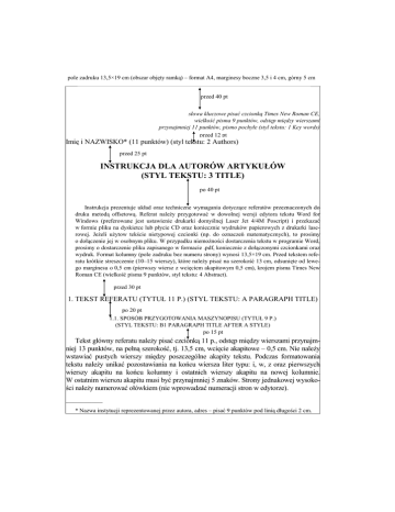 pole zadruku 13,5×19 cm (obszar objęty ramką) – format A4, marginesy boczne 3,5 i 4 cm, górny 5 cm przed 40 pt słowa kluczowe pisać czcionką Times New Roman CE, wielkość pisma 9 punktów, odstęp między wierszami przynajmniej 11 punktów, pismo pochyłe (styl tekstu: 1 Key words) przed 12 pt Imię i NAZWISKO* (11 punktów) (styl tekstu: 2 Authors) przed 25 pt INSTRUKCJA DLA AUTORÓW ARTYKUŁÓW (STYL TEKSTU: 3 TITLE) po 40 pt Instrukcja prezentuje układ oraz techniczne wymagania dotyczące referatów przeznaczonych do druku metodą offsetową. Referat należy przygotować w dowolnej wersji edytora tekstu Word for Windows (preferowane jest ustawienie drukarki domyślnej Laser Jet 4/4M Poscript) i przekazać w formie pliku na dyskietce lub płycie CD oraz koniecznie wydruków papierowych z drukarki laserowej. Jeżeli użytow tekście nietypowej czcionki (np. do oznaczeń matematycznych), to prosimy o dołączenie jej w osobnym pliku. W przypadku niemożności dostarczenia tekstu w programie Word, prosimy o dostarczenie pliku zapisanego w formacie .pdf, koniecznie z dołączonymi czcionkami oraz wydruk. Format kolumny (pole zadruku bez numeru strony) wynosi 13,5×19 cm. Przed tekstem referatu krótkie streszczenie (10–15 wierszy), które należy pisać na szerokość 13 cm, odsunięte od lewego marginesu o 0,5 cm (pierwszy wiersz z wcięciem akapitowym 0,5 cm), krojem pisma Times New Roman CE (wielkość pisma 9 punktów, styl tekstu: 4 Abstract). przed 30 pt 1. TEKST REFERATU (TYTUŁ 11 P.) (STYL TEKSTU: A PARAGRAPH TITLE) po 20 pt 1.1. SPOSÓB PRZYGOTOWANIA MASZYNOPISU (TYTUŁ 9 P.) (STYL TEKSTU: B1 PARAGRAPH TITLE AFTER A STYLE) po 15 pt Tekst główny referatu należy pisać czcionką 11 p., odstęp między wierszami przynajmniej 13 punktów, na pełną szerokość, tj. 13,5 cm, wcięcie akapitowe – 0,5 cm. Nie należy wstawiać pustych wierszy między poszczególne akapity tekstu. Podczas formatowania tekstu należy unikać pozostawiania na końcu wiersza liter typu: i, w, z oraz pierwszych wierszy akapitu na końcu kolumny i ostatnich wierszy akapitu na nowej kolumnie. W ostatnim wierszu akapitu musi być przynajmniej 5 znaków. Strony jednakowej wysokości należy numerować ołówkiem (nie wprowadzać numeracji stron w edytorze). __________ * Nazwa instytucji reprezentowanej przez autora, adres – pisać 9 punktów pod linią długości 2 cm. 2 2.1. WZORY MATEMATYCZNE I TABELE (9 PUNKTÓW) Wzory matematyczne składać pismem 11 p. na osi kolumny (wypośrodkowane), z numerem wzoru w okrągłym nawiasie dosuniętym do prawego brzegu kolumny (jak w poniższym przykładzie). Symbole zmiennych we wzorach i w tekście należy pisać pismem pochyłym (kursywa). Odstępy między wzorem i tekstem – 1 wiersz tekstu. Tabele (łącznie z tytułem) składać pismem 9 p., odstęp między wierszami przynajmniej 11 p. Tytuł tabeli w języku polskim i angielskim, środkowany. x= a1 − c + b 10 − d 2 (1) Inne wskazówki: – nawiasów okrągłych nie należy zastępować kreskami ukośnymi, – przedziały wartości pisze się bez odstępów, stosując półpauzę (Alt 0150), np. 3–45 MPa. 2. ILUSTRACJE 2.1. RYSUNKI I ICH ROZMIESZCZENIE Rysunki, wykresy i fotografie numeruje się kolejno 1, 2, ..., n. Podpisy pod rysunkami w języku polskim i angielskim na osi rysunku (środkowane). Odstępy między rysunkami i tekstem – jeden wiersz tekstu głównego. Małe rysunki można obłamać tekstem lub podpisem, zgodnie z zasadą, że ilustracja powinna być po zewnętrznej części kolumny (strony parzyste – lewa część, strony nieparzyste – prawa część). Rys. 1. Podpis do rysunku Fig. 1. For figure caption 3 Podpisy do rysunków składać pismem 9-punktowym, odstęp między wierszami przynajmniej 11 punktów. Rysunki i fotografie przygotowane w programach komputerowych lub wyskanowane umieścić w tekście referatu. Prosimy nie wprowadzać do rysunków kolorowych linii, które przy wydruku czarno-białym są zazwyczaj niereprodukowalne, jak również rastrów (także w tabelach). Fotografie i inne oryginały półtonowe można również dostarczyć osobno, niezależnie od ich umieszczenia w pliku word, jako osobne pliki graficzne w formatach: tiff lub psd bez zapisu z warstwami (pliki rastrowe) lub eps, cdr z czcionkami zamienionymi na krzywe (pliki wektorowe). Rysunki przygotowane w programie CorelDraw proszę zapisać w wersji nie wyższej niż CorelDraw 11. Plik tiff może by zapisany z kompresją lzw lub zip, natomiast plik jpg koniecznie bez kompresji (ze względu na straty jakości ilustracji). Wymagana rozdzielczość grafik rastrowych to 300 dpi przy docelowej wielkości pliku. LITERATURA (9 PUNKTÓW) W tekście głównym artykułu materiały źródłowe należy podawać w nawiasie kwadratowym, np. [3]. Opis bibliograficzny cytowanej literatury według wzoru, w kolejności alfabetycznej nazwisk autorów – wielkość 9 punktów, odstęp między wierszami przynajmniej 11 punktów. Należy podać: nazwisko autora, inicjał imienia, tytuł pracy (ewentualnie nr kolejnego wydania, nr tomu) lub artykułu, tytuł czasopisma, z którego pochodzi artykuł, miejsce wydania pracy, wydawnictwo, rok wydania, numer zeszytu (w przypadku czasopisma), numery stron. Przy cytowaniu literatury w j. rosyjskim można stosować zapis cyrylicą lub dokonać transliteracji [1] BRANDT A.M., Zastosowanie doświadczalnej mechaniki zniszczenia do kompozytów o matrycach cementowych. W: Mechanika kompozytów betonopodobnych, A.M. Brandt (red.), Wrocław, Ossolineum, 1983, 449–501. [2] NOWACKI W., Plasticity of polycrystal, Warszawa, PWN, 1987, 687–704. STRESZCZENIE (TU POWTÓRZENIE TYTUŁU ARTYKUŁU W JĘZYKU ANGIELSKIM, 9 PUNKTÓW) Krótkie streszczenie referatu w języku angielskim (8–12 wierszy). Streszczenie należy pisać krojem pisma Times New Roman CE, wielkość pisma 9 punktów, odstęp między wierszami przynajmniej 11 punktów, wcięcie akapitowe – 0,5 cm.