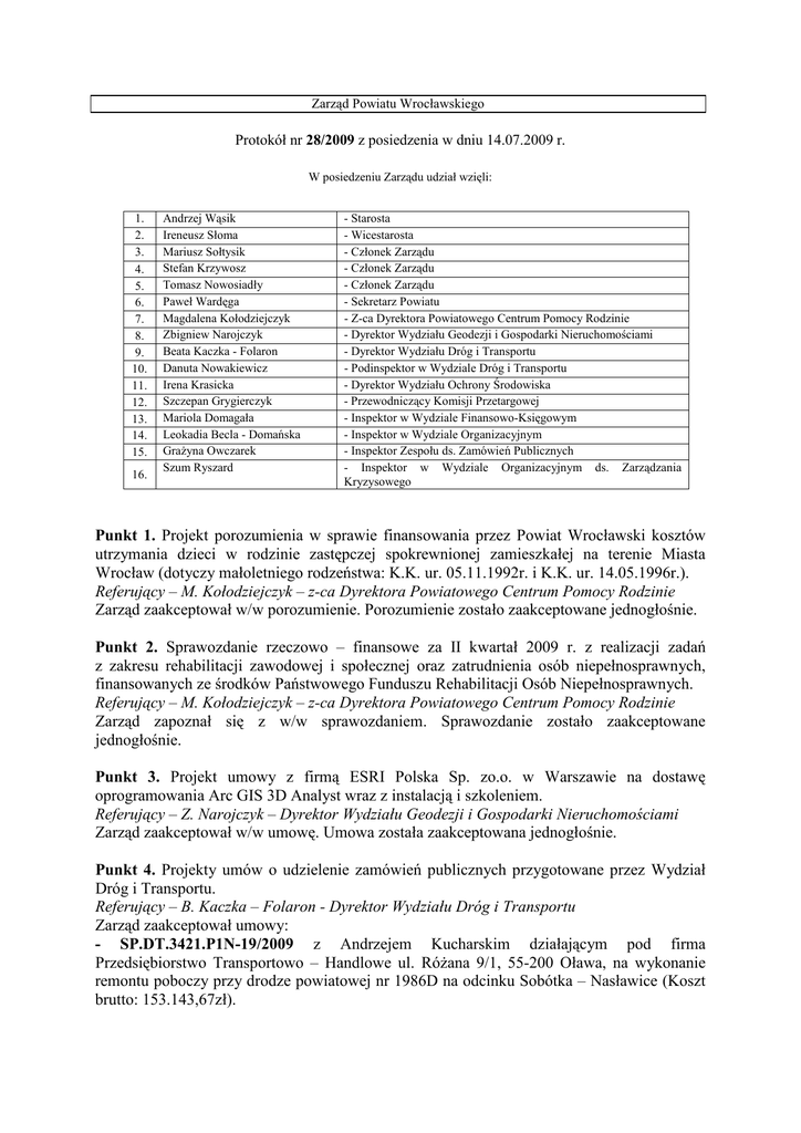 Zarząd Powiatu Wrocławskiego Protokół nr 28/2009 z posiedzenia w dniu 14.07.2009 r. W posiedzeniu Zarządu udział wzięli: 1. 2. 3. 4. 5. 6. 7. 8. 9. 10. 11. 12. 13. 14. 15. 16. Andrzej Wąsik Ireneusz Słoma Mariusz Sołtysik Stefan Krzywosz Tomasz Nowosiadły Paweł Wardęga Magdalena Kołodziejczyk Zbigniew Narojczyk Beata Kaczka - Folaron Danuta Nowakiewicz Irena Krasicka Szczepan Grygierczyk Mariola Domagała Leokadia Becla - Domańska GraŜyna Owczarek Szum Ryszard - Starosta - Wicestarosta - Członek Zarządu - Członek Zarządu - Członek Zarządu - Sekretarz Powiatu - Z-ca Dyrektora Powiatowego Centrum Pomocy Rodzinie - Dyrektor Wydziału Geodezji i Gospodarki Nieruchomościami - Dyrektor Wydziału Dróg i Transportu - Podinspektor w Wydziale Dróg i Transportu - Dyrektor Wydziału Ochrony Środowiska - Przewodniczący Komisji Przetargowej - Inspektor w Wydziale Finansowo-Księgowym - Inspektor w Wydziale Organizacyjnym - Inspektor Zespołu ds. Zamówień Publicznych - Inspektor w Wydziale Organizacyjnym ds. Zarządzania Kryzysowego Punkt 1. Projekt porozumienia w sprawie finansowania przez Powiat Wrocławski kosztów utrzymania dzieci w rodzinie zastępczej spokrewnionej zamieszkałej na terenie Miasta Wrocław (dotyczy małoletniego rodzeństwa: K.K. ur. 05.11.1992r. i K.K. ur. 14.05.1996r.). Referujący – M. Kołodziejczyk – z-ca Dyrektora Powiatowego Centrum Pomocy Rodzinie Zarząd zaakceptował w/w porozumienie. Porozumienie zostało zaakceptowane jednogłośnie. Punkt 2. Sprawozdanie rzeczowo – finansowe za II kwartał 2009 r. z realizacji zadań z zakresu rehabilitacji zawodowej i społecznej oraz zatrudnienia osób niepełnosprawnych, finansowanych ze środków Państwowego Funduszu Rehabilitacji Osób Niepełnosprawnych. Referujący – M. Kołodziejczyk – z-ca Dyrektora Powiatowego Centrum Pomocy Rodzinie Zarząd zapoznał się z w/w sprawozdaniem. Sprawozdanie zostało zaakceptowane jednogłośnie. Punkt 3. Projekt umowy z firmą ESRI Polska Sp. zo.o. w Warszawie na dostawę oprogramowania Arc GIS 3D Analyst wraz z instalacją i szkoleniem. Referujący – Z. Narojczyk – Dyrektor Wydziału Geodezji i Gospodarki Nieruchomościami Zarząd zaakceptował w/w umowę. Umowa została zaakceptowana jednogłośnie. Punkt 4. Projekty umów o udzielenie zamówień publicznych przygotowane przez Wydział Dróg i Transportu. Referujący – B. Kaczka – Folaron - Dyrektor Wydziału Dróg i Transportu Zarząd zaakceptował umowy: - SP.DT.3421.P1N-19/2009 z Andrzejem Kucharskim działającym pod firma Przedsiębiorstwo Transportowo – Handlowe ul. RóŜana 9/1, 55-200 Oława, na wykonanie remontu poboczy przy drodze powiatowej nr 1986D na odcinku Sobótka – Nasławice (Koszt brutto: 153.143,67zł). - SP.DT.3421.P1N-22/2009 z Firmą Restal Sp. z o. o. ul. śerkowicka 1A, 45-838 Opole na Dostawę znaków drogowych pionowych dla potrzeb obwodu drogowego w Sulimowie (Koszt brutto: 57.417,32zł). Umowy zostały zaakceptowane jednogłośnie. Punkt 5. Ostateczne wersje projektów porozumień w sprawie utrzymywania zieleni przydroŜnej w pasie dróg powiatowych na terenie Powiatu Wrocławskiego przygotowane przez Wydział Dróg i Transportu Referujący – B. Kaczka – Folaron – Dyrektor Wydziału Dróg i Transportu Zarząd zaakceptował porozumienia: - SP.DT.5548/08/09 z Zarządcą dróg gminnych – Burmistrzem Miasta i Gminy Kąty Wrocławskie z siedzibą w Kątach Wrocławskich, Rynek Ratusz 1, 55-080 Kąty Wrocławskie, w sprawie utrzymywania zieleni przydroŜnej w pasie dróg powiatowych na terenie gminy Kąty Wrocławskie (kwota dotacji: 27.360,00 zł) - SP.DT.5548/10/09 z Zarządcą dróg gminnych – Burmistrzem Miasta i Gminy Sobótka z siedzibą w Sobótce, ul. Rynek 1, 55-050 Sobótka, w sprawie utrzymywania zieleni przydroŜnej w pasie dróg powiatowych na terenie gminy Sobótka (kwota dotacji: 32.400,00 zł) - SP.DT.5548/11/09 z Zarządcą dróg gminnych – Wójtem Gminy Kobierzyce z siedzibą w Kobierzycach, al. Pałacowa 1, 55-040 Kobierzyce, w sprawie utrzymywania zieleni przydroŜnej w pasie dróg powiatowych na terenie gminy Kobierzyce (kwota dotacji: 28.080,00 zł) Porozumienia zostały zaakceptowane jednogłośnie. Punkt 6. Projekt uchwały Zarządu Powiatu Wrocławskiego w sprawie wydania opinii o pozbawieniu kategorii dróg powiatowych na terenie Powiatu Świdnickiego Referujący – B. Kaczka – Folaron – Dyrektor Wydziału Dróg i Transportu Zarząd podjął uchwałę nr 73/09. Uchwała została podjęta jednogłośnie. Punkt 7. Projekty postanowień Zarządu Powiatu w sprawie uzgodnienia projektu Decyzji o ustaleniu lokalizacji celu publicznego Referujący – B. Kaczka – Folaron – Dyrektor Wydziału Dróg i Transportu Zarząd zaakceptował postanowienia: - SP.DT.5541/1/032/09/14491/2009 - projekt decyzji o ustaleniu lokalizacji inwestycji celu publicznego dla inwestycji polegającej na budowie odcinka sieci wodociągowej, zlokalizowanej w drodze powiatowej klasy lokalnej 1953D, część dz. nr 214/2dr w obrębie Rzeplin - SP.DT.5541/1/033/09/14751/2009 - projekt decyzji o ustaleniu lokalizacji inwestycji celu publicznego dla inwestycji polegającej na budowie odcinka sieci wodociągowej do zasilenia 2 projektowanych budynków mieszkalnych, zlokalizowanej w drodze powiatowej klasy lokalnej 1954D, część dz. nr 500/4dr w obrębie Węgry oraz na części działki nr 501, AM-2, obręb Węgry, - SP.DT.5541/1/034/09/14752/2009 – projekt decyzji o ustaleniu lokalizacji inwestycji celu publicznego dla inwestycji polegającej na budowie odcinka kanalizacji deszczowej i przebudowie (zarurowaniu) rowu przydroŜnego, zlokalizowanej w drodze powiatowej klasy lokalnej 1955D, część dz. Nr 188/2dr w obrębie Karwiany- Komorowice oraz na części działki nr 223, obręb Karwiany- Komorowice Postanowienia zostały zaakceptowane jednogłośnie. Punkt 8. Projekty postanowień Zarządu Powiatu w sprawie uzgodnienia projektu Decyzji o warunkach zabu
