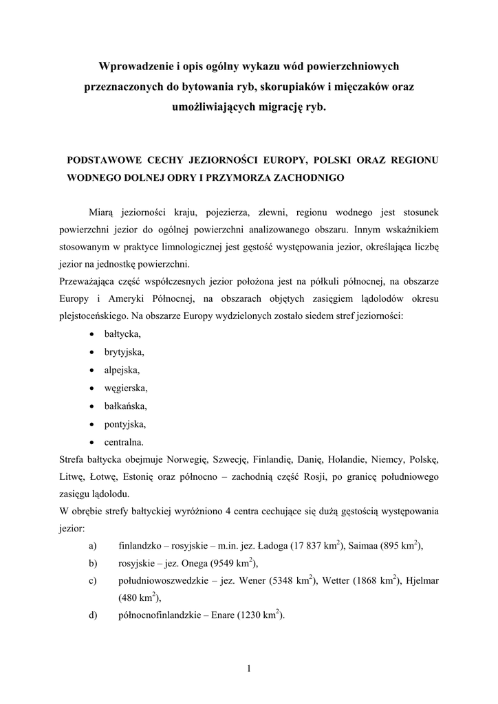 Wprowadzenie i opis ogólny wykazu wód powierzchniowych przeznaczonych do bytowania ryb, skorupiaków i mięczaków oraz umożliwiających migrację ryb. PODSTAWOWE CECHY JEZIORNOŚCI EUROPY, POLSKI ORAZ REGIONU WODNEGO DOLNEJ ODRY I PRZYMORZA ZACHODNIGO Miarą jeziorności kraju, pojezierza, zlewni, regionu wodnego jest stosunek powierzchni jezior do ogólnej powierzchni analizowanego obszaru. Innym wskaźnikiem stosowanym w praktyce limnologicznej jest gęstość występowania jezior, określająca liczbę jezior na jednostkę powierzchni. Przeważająca część współczesnych jezior położona jest na półkuli północnej, na obszarze Europy i Ameryki Północnej, na obszarach objętych zasięgiem lądolodów okresu plejstoceńskiego. Na obszarze Europy wydzielonych zostało siedem stref jeziorności: • bałtycka, • brytyjska, • alpejska, • węgierska, • bałkańska, • pontyjska, • centralna. Strefa bałtycka obejmuje Norwegię, Szwecję, Finlandię, Danię, Holandie, Niemcy, Polskę, Litwę, Łotwę, Estonię oraz północno – zachodnią część Rosji, po granicę południowego zasięgu lądolodu. W obrębie strefy bałtyckiej wyróżniono 4 centra cechujące się dużą gęstością występowania jezior: a) finlandzko – rosyjskie – m.in. jez. Ładoga (17 837 km2), Saimaa (895 km2), b) rosyjskie – jez. Onega (9549 km2), c) południowoszwedzkie – jez. Wener (5348 km2), Wetter (1868 km2), Hjelmar (480 km2), d) północnofinlandzkie – Enare (1230 km2). 1 Północna część Polski na tle obszaru Europy, zaliczana jest do strefy o średniej jeziorności , zarówno pod względem procentowego pokrycia jeziorami, jak i gęstości ich występowania (A. Choiński, 1995). Jeziora polskie posiadają dwie podstawowe cechy: • zdecydowanie przeważają jeziora polodowcowe, • posiadają z reguły nieduże powierzchnie (największe w Polsce jez. Śniardwy znajduje się na 100 miejscu w Europie). Analizując wskaźnik jeziorności zlewiska Morza Bałtyckiego, Polskę zalicza się do strefy o niewielkiej jeziorności. Jezior o powierzchni powyżej 1 ha naliczono zaledwie 7081, co stanowi 0,90% powierzchni kraju (A. Choiński, 1992). W Szwecji zinwentaryzowano ok. 100 000 jezior, o powierzchni prawie 40 000 km2 (8,5% pow. kraju); w Finlandii – 55 000 jezior (9,5% kraju), na terenie Rosji i republik Bałtyckich – 250 000 jezior. Jeziora polskie wyróżnia fakt, że kwalifikują się do zbiorników o znacznych głębokościach. Wśród jezior polodowcowych Niżu Europejskiego najgłębsze jest jez. Hańcza (108,5 m), przy czym ok. 70 jezior osiąga maksymalną głębokość ponad 40 m. Liczba jezior w Polsce nie została dotąd precyzyjnie określona. Przedmiotem inwentaryzacji (Katalog Jezior Polski, 1954) były jeziora o pow. powyżej 1 ha. Umowna granica jest dyskusyjna z uwagi na fakt, ze jeziora o powierzchni <1 ha są zbiornikami naturalnymi, a ich ilość w skali kraju szacowana jest na kilkaset tysięcy. Dla przykładu na Pojezierzu Mazurskim naliczono ok. 84 000 oczek wodnych. Na obszarze Polski przeważają jeziora małe (1-5 ha) stanowiąc 44% całkowitej ilości jezior. Podobny układ stwierdzono w Regionie Wodnym Dolnej Odry i Przymorza Zachodniego (vide Ryc. 8.) Jeziora te, jak i jeziora najmniejsze ( poniżej 1 ha), ulegają szybkiemu zanikowi. Porównanie liczby jezior z lat 90-tych oraz z okresu sprzed 1954 r. dowodzi, że znikło 2215 jez. O powierzchni powyżej 1 ha, o sumarycznej powierzchni 35 550 ha (11,22% ówczesnej powierzchni jezior) (A. Choiński, 1992). Proces zaniku jezior małych jest bardzo dynamicznym, stąd potrzeba ich inwentaryzacji i określenia roli w systemie krążenia i retencjonowania wód. W Polsce największy procentowy udział jezior w powierzchni terenu występuje w Krainie Wielkich Jezior Mazurskich. Drugim takim obszarem występowania jezior jest Pojezierze Pomorskie z maksimum koncentracji w rejonie Stargardu Szczecińskiego-Pyrzyc, a trzecim – Pojezierze Wielkopolsko-Kujawskie. Jeziora są znaczącym ogniwem krążenia i retencji wód w zlewniach bilansowych. Stąd istotne jest określenie ich liczby, powierzchni, objętości zgromadzonej wody, czy też 2 związków z poziomami wód podziemnych w ujęciu zlewniowym. Analiza E. Pawlak (1993) na bazie danych zawartych w Katalogu Jezior Polski A. Choińskiego (1992) wykazała, że najwięcej jezior znajduje się w zlewniach: • Brdy – 490 (6,9% jezior Polski), • Drawy – 413, • Drwęcy – 396, • Noteci do Gwdy – 252 Przestrzenne zróżnicowanie średniej wartości jeziorności w zlewniach rzecznych na obszarze Regionu Wodnego Dolnej Odry i Przymorza Zachodniego przedstawia się następująco (wg Podziału Hydrograficznego Polski. IMGW, 1980): • maksymalną wartość >5% posiada zlewnia jeziora Jamno, • w przedziale 1,5 – 2,5% mieści się zlewnia obszaru Przymorza pomiędzy Regą i Parsętą, • w przedziale 1 – 1,5% znajdują się zlewnie Myśli, Słubi, Kurzycy, Tywy, Iny, Regi, Dziwnej, • w przedziale 0,5 – 1,0% mieszczą się zlewnie Wieprzy, Parsęty, Przymorza pomiędzy Dziwną i Regą, Gowienicy, Gunicy, wyspa Wolin, • w przedziale 0,0 – 0,5% znajdują się zlewnie Ilanki i Pliszki Na podstawie przedstawionej analizy jeziorności Regionu Wodnego Dolnej Odry i Przymorza Zachodniego, można na jego obszarze wydzielić 3 strefy: 1. zlewni dolnej Odry i Zalewu Szczecińskiego oraz Regi, o wskaźniku jeziorności 1 – 1,5%, 2. zlewni Przymorza (Wieprza, Parsęta) o wskaźniku jeziorności 0,5 – 1% 3. zlewni Ilanki, Pliszki, Konotopu i Kanału Lubońskiego o wskaźniku jeziorności 0,0 – 0,5%. Antropogeniczne przemiany jezior W systemie zmian zachodzących w jeziorach w obecnym czasie, najbardziej odczuwalne są zanieczyszczenia wód przejawiające się ich eutrofizacją. Mamy tu do czynienia z dopływami substancji użyźniających wody, jak i substancji toksycznych. W warunkach polskich dopływ zanieczyszczeń do jezior datuje się
