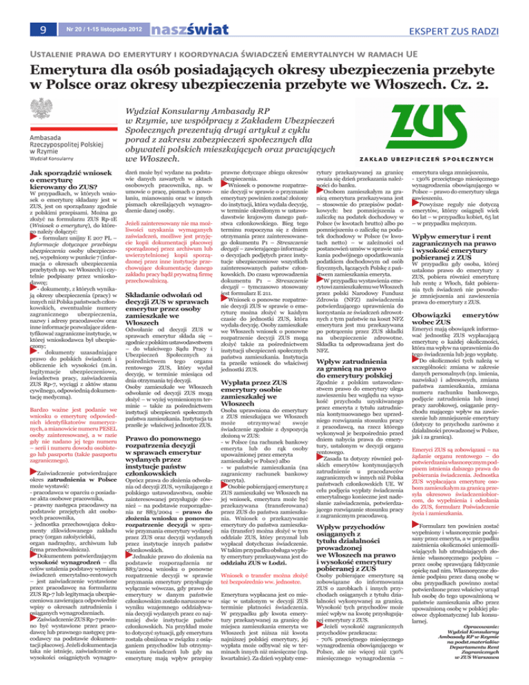 9 Nr 20 / 1-15 listopada 2012 naszświat EKSPERT ZUS RADZI Ustalenie prawa do emerytury i koordynacja świadczeń emerytalnych w ramach UE Emerytura dla osób posiadających okresy ubezpieczenia przebyte w Polsce oraz okresy ubezpieczenia przebyte we Włoszech. Cz. 2. Wydział Konsularny Ambasady RP w Rzymie, we współpracy z Zakładem Ubezpieczeń Społecznych prezentują drugi artykuł z cyklu porad z zakresu zabezpieczeń społecznych dla obywateli polskich mieszkających oraz pracujących we Włoszech. Jak sporządzić wniosek o emeryturę kierowany do ZUS? W przypadkach, w których wniosek o emeryturę składany jest w ZUS, jest on sporządzany zgodnie z polskimi przepisami. Można go złożyć na formularzu ZUS Rp-1E (Wniosek o emeryturę), do którego należy dołączyć: - formularz unijny E 207 PL – Informacje dotyczące przebiegu ubezpieczenia osoby ubezpieczonej, wypełniony w punkcie 7 (informacja o okresach ubezpieczenia przebytych np. we Włoszech) i czytelnie podpisany przez wnioskodawcę; - dokumenty, z których wynikają okresy ubezpieczenia (pracy) w innych niż Polska państwach członkowskich, ewentualnie numery zagranicznego ubezpieczenia, nazwy i adresy pracodawców oraz inne informacje pozwalające zidentyfikować zagraniczne instytucje, w której wnioskodawca był ubezpieczony; - dokumenty uzasadniające prawo do polskich świadczeń i obliczenie ich wysokości (m.in. legitymacje ubezpieczeniowe, świadectwa pracy, zaświadczenia ZUS Rp-7, wyciągi z aktów stanu cywilnego, odpowiednią dokumentację medyczną). Bardzo ważne jest podanie we wniosku o emeryturę odpowiednich identyfikatorów numerycznych, a mianowicie numeru PESEL osoby zainteresowanej, a w razie gdy nie nadano jej tego numeru – serii i numeru dowodu osobistego lub paszportu (także paszportu zagranicznego). Zaświadczenie potwierdzające okres zatrudnienia w Polsce może wystawić: - pracodawca w oparciu o posiadane akta osobowe pracownika, - prawny następca pracodawcy na podstawie przejętych akt osobowych pracownika, - jednostka przechowująca dokumenty zlikwidowanego zakładu pracy (organ założycielski, organ nadrzędny, archiwum lub firma przechowalnicza). Dokumentem potwierdzającym wysokość wynagrodzeń – dla celów ustalenia podstawy wymiaru świadczeń emerytalno-rentowych – jest zaświadczenie wystawione przez pracodawcę na formularzu ZUS Rp-7 lub legitymacja ubezpieczeniowa zawierająca odpowiednie wpisy o okresach zatrudnienia i osiąganych wynagrodzeniach. Zaświadczenie ZUS Rp-7 powinno być wystawione przez pracodawcę lub prawnego następcę pracodawcy na podstawie dokumentacji płacowej. Jeżeli dokumentacja taka nie istnieje, zaświadczenie o wysokości osiągniętych wynagro- dzeń może być wydane na podstawie danych zawartych w aktach osobowych pracownika, np. w umowie o pracę, pismach o powołaniu, mianowaniu oraz w innych pismach określających wynagrodzenie danej osoby. Jeżeli zainteresowany nie ma możliwości uzyskania wymaganych zaświadczeń, możliwe jest przyjęcie kopii dokumentacji płacowej sporządzonej przez archiwum lub uwierzytelnionej kopii sporządzonej przez inne instytucje przechowujące dokumentację danego zakładu pracy bądź prywatną firmę przechowalniczą. Składanie odwołań od decyzji ZUS w sprawach emerytur przez osoby zamieszkałe we Włoszech Odwołanie od decyzji ZUS w sprawach emerytur składa się – zgodnie z polskim ustawodawstwem – do właściwego Sądu Pracy i Ubezpieczeń Społecznych za pośrednictwem tego organu rentowego ZUS, który wydał decyzję, w terminie miesiąca od dnia otrzymania tej decyzji. Osoby zamieszkałe we Włoszech odwołanie od decyzji ZUS mogą złożyć – w wyżej wymienionym terminie – także za pośrednictwem instytucji ubezpieczeń społecznych państwa zamieszkania. Instytucja ta prześle je właściwej jednostce ZUS. Prawo do ponownego rozpatrzenia decyzji w sprawach emerytur wydanych przez instytucje państw członkowskich Oprócz prawa do złożenia odwołania od decyzji ZUS, wynikającego z polskiego ustawodawstwa, osobie zainteresowanej przysługuje również – na podstawie rozporządzenia nr 883/2004 – prawo do złożenia wniosku o ponowne rozpatrzenie decyzji w sprawie przyznania emerytury wydanej przez ZUS oraz decyzji wydanych przez instytucje innych państw członkowskich. Jednakże prawo do złożenia na podstawie rozporządzenia nr 883/2004 wniosku o ponowne rozpatrzenie decyzji w sprawie przyznania emerytury przysługuje wyłącznie wówczas, gdy prawo do emerytury w danym państwie członkowskim zostało naruszone w wyniku wzajemnego oddziaływania decyzji wydanych przez co najmniej dwie instytucje państw członkowskich. Na przykład może to dotyczyć sytuacji, gdy emerytura została obniżona w związku z osiąganiem przychodów lub otrzymywaniem świadczeń lub gdy na emeryturę mają wpływ przepisy prawne dotyczące zbiegu okresów ubezpieczenia. Wniosek o ponowne rozpatrzenie decyzji w sprawie o przyznanie emerytury powinien zostać złożony do instytucji, która wydała decyzję, w terminie określonym w ustawodawstwie krajowym danego państwa członkowskiego. Bieg tego terminu rozpoczyna się z dniem otrzymania przez zainteresowanego dokumentu P1 – Streszczenie decyzji – zawierającego informacje o decyzjach podjętych przez instytucje ubezpieczeniowe wszystkich zainteresowanych państw członkowskich. Do czasu wprowadzenia dokumentu P1 – Streszczenie decyzji – tymczasowo stosowany jest formularz E 211. Wniosek o ponowne rozpatrzenie decyzji ZUS w sprawie o emeryturę można złożyć w każdym czasie do jednostki ZUS, która wydała decyzję. Osoby zamieszkałe we Włoszech wniosek o ponowne rozpatrzenie decyzji ZUS mogą złożyć także za pośrednictwem instytucji ubezpieczeń społecznych państwa zamieszkania. Instytucja ta prześle wniosek do właściwej jednostki ZUS. rytury przekazywanej za granicę uważa się dzień przekazania należno