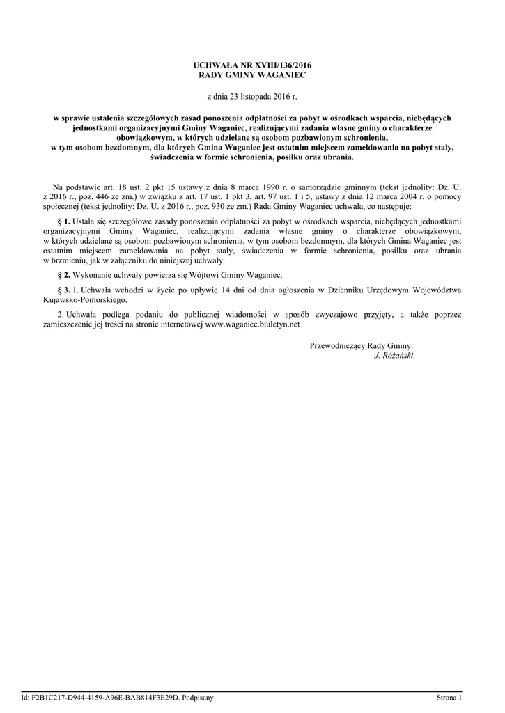 UCHWAŁA NR XVIII/136/2016 RADY GMINY WAGANIEC z dnia 23 listopada 2016 r. w sprawie ustalenia szczegółowych zasad ponoszenia odpłatności za pobyt w ośrodkach wsparcia, niebędących jednostkami organizacyjnymi Gminy Waganiec, realizującymi zadania własne gminy o charakterze obowiązkowym, w których udzielane są osobom pozbawionym schronienia, w tym osobom bezdomnym, dla których Gmina Waganiec jest ostatnim miejscem zameldowania na pobyt stały, świadczenia w formie schronienia, posiłku oraz ubrania. Na podstawie art. 18 ust. 2 pkt 15 ustawy z dnia 8 marca 1990 r. o samorządzie gminnym (tekst jednolity: Dz. U. z 2016 r., poz. 446 ze zm.) w związku z art. 17 ust. 1 pkt 3, art. 97 ust. 1 i 5, ustawy z dnia 12 marca 2004 r. o pomocy społecznej (tekst jednolity: Dz. U. z 2016 r., poz. 930 ze zm.) Rada Gminy Waganiec uchwala, co następuje: § 1. Ustala się szczegółowe zasady ponoszenia odpłatności za pobyt w ośrodkach wsparcia, niebędących jednostkami organizacyjnymi Gminy Waganiec, realizującymi zadania własne gminy o charakterze obowiązkowym, w których udzielane są osobom pozbawionym schronienia, w tym osobom bezdomnym, dla których Gmina Waganiec jest ostatnim miejscem zameldowania na pobyt stały, świadczenia w formie schronienia, posiłku oraz ubrania w brzmieniu, jak w załączniku do niniejszej uchwały. § 2. Wykonanie uchwały powierza się Wójtowi Gminy Waganiec. § 3. 1. Uchwała wchodzi w życie po upływie 14 dni od dnia ogłoszenia w Dzienniku Urzędowym Województwa Kujawsko-Pomorskiego. 2. Uchwała podlega podaniu do publicznej wiadomości w sposób zwyczajowo przyjęty, a także poprzez zamieszczenie jej treści na stronie internetowej www.waganiec.biuletyn.net Przewodniczący Rady Gminy: J. Różański Id: F2B1C217-D944-4159-A96E-BAB814F3E29D. Podpisany Strona 1 Załącznik do Uchwały Nr XVIII/136/2016 Rady Gminy Waganiec z dnia 23 listopada 2016 r. Szczegółowe zasady ponoszenia odpłatności za pobyt w ośrodkach wsparcia, niebędących jednostkami organizacyjnymi Gminy Waganiec realizującymi zadania własne gminy o charakterze obowiązkowym, w których udzielane są osobom pozbawionym schronienia, w tym osobom bezdomnym, dla których Gmina Waganiec jest ostatnim miejscem zameldowania na pobyt stały, świadczenia w formie schronienia, posiłku oraz ubrania. § 1. Użyte w niniejszym załączniku określenia oznaczają: 1) odpłatność - jest to kwota opłaty za pobyt jednej osoby w ośrodku wsparcia, uwzględniająca zakres przyznanych usług; 2) ośrodek wsparcia – są to: m. in. noclegownie, hostele, schroniska, domy dla bezdomnych, domy dla matek z małoletnimi dziećmi i kobiet w ciąży i inne miejsca wskazane w ustawie o pomocy społecznej; 3) kryterium dochodowe – jest to kryterium dochodowe osoby samotnie gospodarującej lub kryterium dochodowe na osobę w rodzinie ustalone zgodnie z art. 8 ust. 1 ustawy o pomocy społecznej; 4) pobyt – jest to faktyczny okres przebywania osoby w ośrodku wsparcia określany w decyzji administracyjnej; 5) GOPS – Gminny Ośrodek Pomocy Społecznej w Wagańcu. § 2. 1. Ośrodki wsparcia, niebędące jednostkami organizacyjnymi gminy Waganiec to podmioty o zasięgu lokalnym, realizujące zadania własne gminy o charakterze obowiązkowym w zakresie udzielania schronienia, wyżywienia, niezbędnego ubrania osobom tego pozbawionym, w tym bezdomnym, dla których ostatnim miejscem zameldowania na pobyt stały jest gmina Waganiec. 2. Udzielenie schronienia następuje poprzez przyznanie w ośrodku wsparcia tymczasowego miejsca noclegowego, na podstawie rodzinnego wywiadu środowiskowego i po dokonaniu oceny sytuacji życiowej danej osoby. 3. Decyzję o przyznaniu miejsca w ośrodku wsparcia, okresie pobytu i odpłatności za pobyt wydaje kierownik GOPS lub inny pracownik działający z upoważnienia Wójta Gminy Waganiec. 4. W nagłych przypadkach lub innych okolicznościach uniemożliwiających przeprowadzenie wywiadu środowiskowego przez pracowników socjalnych GOPS, zgodę na udzielenie schronienia podejmuje pracownik nadzorujący ośrodek wsparcia, po czym niezwłocznie zgłasza ten fakt pracownikowi socjalnemu GOPS. § 3. 1. Odpłatność za pobyt w ośrodku wsparcia ustala się w zależności od dochodu osoby samotnie gospodarującej lub dochodu na osobę w rodzinie. 2. Osoby, których dochód nie przekracza kryterium dochodowego osoby samotnie gospodarującej lub kryterium dochodowego na osobę w rodzinie są zwolnione z odpłatności za pobyt w ośrodku wsparcia na podstawie art. 97 ust. 1 ustawy o pomocy społecznej. 3. Osoby, których dochód przekracza kryterium dochodowe osoby samotnie gospodarującej lub kryterium dochodowe na osobę w rodzinie ponoszą odpłatność za pobyt w ośrodku wsparcia zgodnie z zasadami określonymi w § 4 ust. 1 i 2 niniejszego załącznika do uchwały. § 4. 1. Opłaty za pobyt w ośrodku wsparcia ustala się według następujących zasad: Dochód osoby samotnie gospodarujące/ na osobę w rodzinie wg kryterium dochodowego określonego w art. 8 ust. 1 ustawy o pomocy społecznej do 100% powyżej 100% do 150% powyżej 150% do 200% powyżej 200% do 250% powyżej 250% Id: F2B1C217-D944-4159-A96E-BAB814F3E29D. Podpisany Odpłatność ustalona w stosunku % do średniego kosztu utrzymania osoby w ośrodku wsparcia nieodpłatnie 70 80 90 100 Strona 1 2. Opłata za pobyt w ośrodku wsparcia może zostać podwyższona do pełnej odpłatności, w przypadku niedostarczenia przez świadczeniobiorcę pracownikowi socjalnemu GOPS niezbędnych dokumentów do ustalenia dochodu. 3. Opłata za pobyt w ośrodku wsparcia jaką wnosi osoba do niego kierowana nie może być wyższa od dochodu osoby kierowanej, jak również nie może przekraczać miesięcznego kosztu jej pobytu w ośrodku wsparcia. 4. Opłatę za pobyt w ośrodku wsparcia ustala się na miesiąc kalendarzowy, a jeżeli pobyt w ośrodku wsparcia nie obejmuje pełnego miesiąca kalendarzowego, proporcjonalnie do