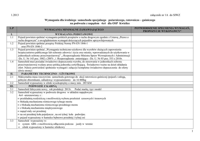 1.2013 załącznik nr 1A do SIWZ Wymagania dla średniego samochodu specjalnego pożarniczego, ratowniczo – gaśniczego na podwoziu z napędem 4x4 dla OSP Kwielice L.P I. 1.1 1.2 1.3 1.4 II. 2.1 2.2 III. 3.1 3.2 3.3 WYMAGANIA MINIMALNE ZAMAWIAJĄCEGO POTWIERDZENIE SPEŁNIENIA WYMAGAŃ, PROPOZYCJE WYKONAWCY* WYMAGANIA PODSTAWOWE Pojazd powinien spełniać wymagania polskich przepisów o ruchu drogowym zgodnie z Ustawą „Prawo o ruchu drogowym” z uwzględnieniem wymagań dotyczących pojazdów uprzywilejowanych Pojazd powinien spełniać przepisy Polskiej Normy PN-EN 1846-1 oraz PN-EN 1846-2 Pojazd powinien spełniać „Wymagania techniczno-użytkowe dla wyrobów służących zapewnieniu bezpieczeństwa publicznego lub ochronie zdrowia i życia oraz mienia, wprowadzanych do użytkowania w jednostkach ochrony przeciwpożarowej” „-Rozporządzenie Ministra Spraw Wewnętrznych i Administracji -Dz. U. Nr 143 poz. 1002 z 2007r , i Rozporządzenie zmieniające - Dz. U. Nr 85 poz. 553 z 2010r. Samochód musi posiadać świadectwo dopuszczenia wyrobu, do stosowania w jednostkach ochrony przeciwpożarowej wydany przez polską jednostkę certyfikującą. Świadectwo ważne na dzień składania ofert .Należy potwierdzić spełnienie wymagań i załączyć kompletne świadectwo dopuszczenia do oferty (dwie strony) PARAMETRY TECHNICZNO – UŻYTKOWE Maksymalna masa rzeczywista samochodu gotowego do akcji ratowniczo-gaśniczej (pojazd z załogą, pełnymi zbiornikami, zabudową i wyposażeniem)- do 16 000kg Samochód wyposażony w silnik wysokoprężny o mocy min. 285 KM PODWOZIE Z KABINĄ Samochód fabrycznie nowy, rok produkcji 2013r. Podać markę, typ i model Samochód wyposażony w podwozie drogowe w układzie napędowym: 4x4 –uterenowiony z : • przekładnią rozdzielczą z możliwością wyboru przełożeń szosowych i trenowych • blokadą mechanizmu różnicowego tylnego mostu • z blokadą mechanizmu różnicowego przedniego mostu • z blokadą mechanizmu międzyosiowego • napęd stały osi przedniej • na osi przedniej koła pojedyncze , na osi tylnej koła podwójne. • pojazd wyposażony w hamulce bębnowe przedniej i tylnej osi Samochód wyposażony w: • system ABS- z możliwością odłączenia podczas jazdy w terenie • silnik wyposażony w hamulec silnikowy 1 L.P 3.4 3.5 3.6 WYMAGANIA MINIMALNE ZAMAWIAJĄCEGO POTWIERDZENIE SPEŁNIENIA WYMAGAŃ, PROPOZYCJE WYKONAWCY* • światła do jazdy dziennej uruchamiane po przekręceniu kluczyka Samochód wyposażony w silnik o zapłonie samoczynnym , posiadający aktualne normy ochrony środowiska (czystości spalin) spełniający normę emisji spalin- min. Euro 5 Zawieszenie osi przedniej: • mechaniczne- resory paraboliczne lub pneumatyczne (podać jakie jest oferowane) • amortyzatory teleskopowe, • stabilizator przechyłów Zawieszenie osi tylnej: • mechaniczne- resory paraboliczne lub pneumatyczne (podać jakie jest oferowane) • amortyzatory teleskopowe • stabilizator przechyłów Kabina fabrycznie jednomodułowa czterodrzwiowa, zapewniająca dostęp do silnika, w układzie miejsc 1+1+4 (siedzenia przodem do kierunku jazdy), Kabina wyposażona w : • klimatyzację • indywidualne oświetlenie do czytania mapy dla pozycji dowódcy • niezależny układ ogrzewania, umożliwiający ogrzewanie kabiny przy wyłączonym silniku • reflektor pogorzeliskowy na zewnątrz kabiny z gniazdem elektrycznym z prawej strony • poręcz do trzymania w tylnej części kabiny • zewnętrzną osłonę przeciwsłoneczną z przodu dachu kabiny • elektrycznie sterowane szyby po stronie kierowcy i dowódcy • elektrycznie sterowane lusterka po stronie kierowcy i dowódcy • lusterka zewnętrzne, elektrycznie podgrzewane(główne i szerokokątne) • lusterko rampowe -krawężnikowe z prawej strony • lusterko rampowe -dojazdowe, przednie • wywietrznik dachowy • lampy przeciwmgielne z przodu pojazdu Kabina wyposażona dodatkowo w: • przetłoczenie zewnętrzne ściany tylnej kabiny w celu umiejscowienia uchwytów na aparaty powietrzne lub zastosowanie układu równoważnego ( uchwyty na aparaty nie powinny zmniejszać przestrzeni załogi i ograniczać powierzchni siedziska) • uchwyty na 4 aparaty oddechowe, umieszczone w oparciach tylnych siedzeń. • odblokowanie każdego aparatu indywidualnie 2 L.P WYMAGANIA MINIMALNE ZAMAWIAJĄCEGO POTWIERDZENIE SPEŁNIENIA WYMAGAŃ, PROPOZYCJE WYKONAWCY* • 3.7 3.8 3.9 dźwignia odblokowująca o konstrukcji uniemożliwiającej przypadkowe odblokowanie np. w czasie hamowania pojazdu • w przypadku gdy aparaty nie są przewożone, wstawienie oparć w miejscu mocowania aparatów • schowek pod siedzeniami w tylnej części kabiny Fotele wyposażone w bezwładnościowe pasy bezpieczeństwa. Siedzenia pokryte materiałem łatwozmywalnym, o zwiększonej odporności na ścieranie. Fotele wyposażone w zagłówki. Fotel dla kierowcy: • z pneumatyczną regulacją wysokości • z regulacją dostosowania do ciężaru ciała • z regulacją odległości całego fotela • z regulacją odległości samego siedziska • z regulacją pochylenia siedziska • z regulacją pochylenia oparcia • z funkcją tłumienia drgań Fotel dla pasażera(dowódcy): • z mechaniczną regulacją wysokości • z regulacją odległości całego fotela • z regulacją pochylenia siedziska • z regulacją pochylenia oparcia W kabinie kierowcy zamontowane następujące urządzenia: • -radiotelefon samochodowy o parametrach: częstotliwość VHF 136-174 MHz, moc 1÷25 W, odstęp międzykanałowy 12,5 kHz dostosowany do użytkowania w sieci MSWiA ,min 255 kanałów, wyświetlacz alfanumeryczny min 14 znaków. Obrotowy potencjometr siły głosu. • radio z odtwarzaczem CD • tachograf • podest do ładowarek radiostacji przenośnych i latarek z wyłącznikiem. Dodatkowe urządzenia zamontowane w kabinie: • sygnalizacja otwarcia żaluzji skrytek i podestów • sygnalizacja informująca o wysunięc
