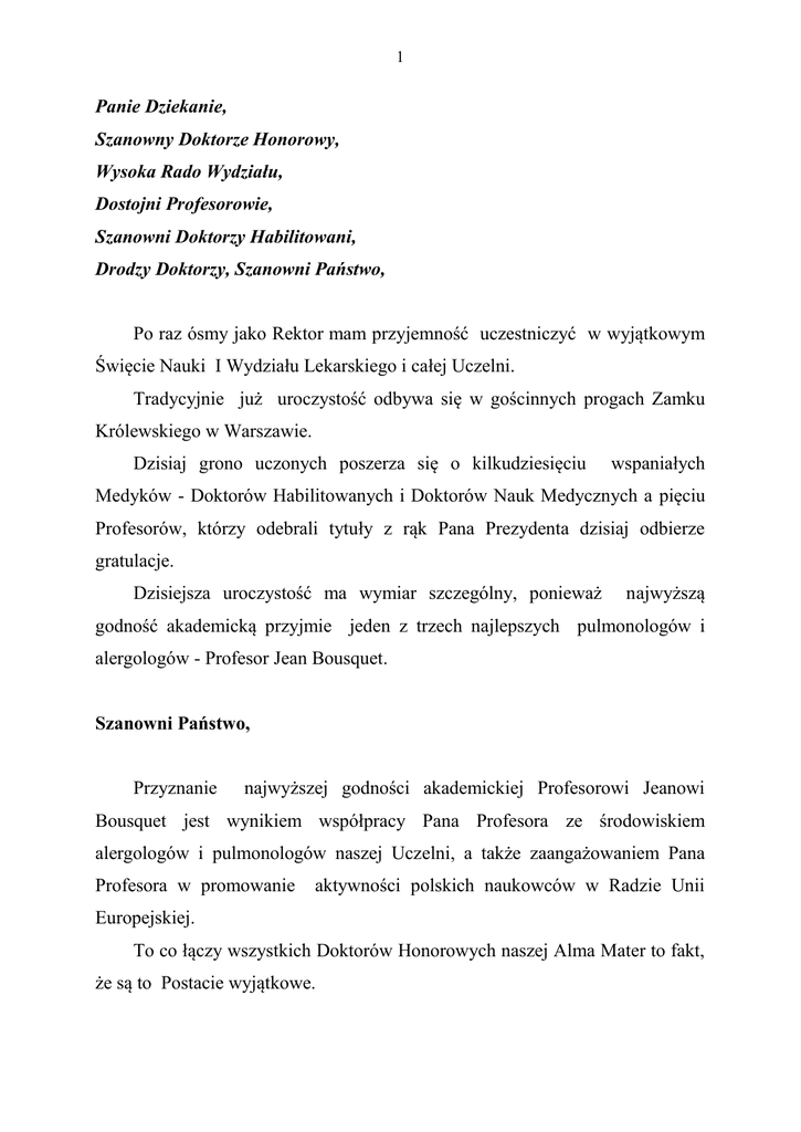 1 Panie Dziekanie, Szanowny Doktorze Honorowy, Wysoka Rado Wydziału, Dostojni Profesorowie, Szanowni Doktorzy Habilitowani, Drodzy Doktorzy, Szanowni Państwo, Po raz ósmy jako Rektor mam przyjemność uczestniczyć w wyjątkowym Święcie Nauki I Wydziału Lekarskiego i całej Uczelni. Tradycyjnie już uroczystość odbywa się w gościnnych progach Zamku Królewskiego w Warszawie. Dzisiaj grono uczonych poszerza się o kilkudziesięciu wspaniałych Medyków - Doktorów Habilitowanych i Doktorów Nauk Medycznych a pięciu Profesorów, którzy odebrali tytuły z rąk Pana Prezydenta dzisiaj odbierze gratulacje. Dzisiejsza uroczystość ma wymiar szczególny, ponieważ najwyższą godność akademicką przyjmie jeden z trzech najlepszych pulmonologów i alergologów - Profesor Jean Bousquet. Szanowni Państwo, Przyznanie najwyższej godności akademickiej Profesorowi Jeanowi Bousquet jest wynikiem współpracy Pana Profesora ze środowiskiem alergologów i pulmonologów naszej Uczelni, a także zaangażowaniem Pana Profesora w promowanie aktywności polskich naukowców w Radzie Unii Europejskiej. To co łączy wszystkich Doktorów Honorowych naszej Alma Mater to fakt, że są to Postacie wyjątkowe. 2 Największym osiągnięciem 69 Doktora Honorowego Warszawskiego Uniwersytetu Medycznego, Profesora Jeana Bousqueta, jest stworzenie obowiązujących do dzisiaj standardów diagnostyki i leczenia alergicznego nieżytu nosa. Swoją dotychczasową działalnością Profesor Bousquet rozsławiał imię naszego Uniwersytetu. Bardzo wspierał przygotowanie polskiej prezydencji w Unii Europejskiej w zakresie problematyki zdrowotnej. Pan Profesor pomagał w przygotowaniu międzynarodowej konferencji zorganizowanej w naszej Uczelni, podczas której powstały założenia do Stanowiska Rady Unii Europejskiej obejmujące problematykę chorób układu oddechowego u dzieci. Dzięki zaangażowaniu Pana Profesora, ten unikatowy akt został wdrożony w Unii Europejskiej i stanowi podstawę do dalszych działań w Radzie oraz w krajach członkowskich Unii Europejskiej w tym zakresie. Dear Professor Jean Bousquet, We would like to welcome you warmly to the academic community of the Medical University of Warsaw. It is a great honor for our university. From this day it is also your university. Thank you for being here with us. Szanowni Państwo, Chciałbym również szczególnie wyróżnić naszych nowych Profesorów: Panią prof. Bognę Ziarkiewicz-Wróblewską, Panią prof. Annę KosteręPruszczyk, Pana prof. Andrzeja Cieszanowskiego, Pana prof. Krzysztofa Morawskiego oraz Pana prof. Mariusza Frączka. Serdeczne podziękowania za wszystkie osiągnięcia naszych naukowców kieruję do Członków Wysokiej Rady Wydziału, do Promotorów, Opiekunów, 3 Recenzentów oraz do Rodzin i Bliskich. To również Państwa sukces i powód do dumy. Szanowni Nowi Profesorowie, Doktorzy Habilitowani, Doktorzy, Państwa dokonania naukowe cieszą tym bardziej, że w naszym Uniwersytecie rozwój nauki jest jednym z priorytetów. Nasza Uczelnia od lat zajmuje czołowe miejsca we wszystkich rankingach szkół wyższych. Tę pozycję zawdzięczamy Państwa wyjątkowej pracy. W tym szczególnym dniu chciałbym przywołać nazwy najlepszych jednostek naukowych I Wydziału Lekarskiego według ankiety naukowej naszej Uczelni za rok 2015. W pierwszej dwudziestce rankingu znalazło się osiem jednostek I Wydziału Lekarskiego. Najlepszy jest Zakład Genetyki Medycznej kierowany przez Pana prof. Rafała Płoskiego, który jest również najlepszą jednostką w Uczelni. Kolejne miejsca zajmują: Zakład Diagnostyki Laboratoryjnej i Immunologii Klinicznej Wieku Rozwojowego - Pani prof. Urszuli Demkow i Zakład Medycyny Ratunkowej - Pana dr. Zenona Truszewskiego. Wierzę, że będziecie Państwo kontynuować swoje aktywności, prowadzić badania naukowe, publikować w najlepszych czasopismach. Że dzięki Państwa determinacji w zdobywaniu wiedzy, wytrwałości i motywacji do ciągłego rozwoju będziemy utrzymywać tak wysokie lokaty. Szanowni Państwo, Władze Uczelni starają się zapewnić jak najlepsze warunki do rozwoju naukowego. W czasie dwóch kadencji stworzyliśmy bazę do prowadzenia 4 badań naukowych, a także instrumenty wsparcia naukowego umożliwiające, jak najbardziej efektywne pozyskiwanie funduszy na naukę. Powstały nowe inwestycje - Centrum Badań Przedklinicznych oraz nowoczesny Szpital Pediatryczny, w których warunki do rozwoju znalazły jednostki Państwa Wydziału. Kapitalny remont i modernizacja Katedry i Zakładu Patomorfologii stworzyły nową jakość zarówno do pracy, prowadzenia działalności naukowej, jak i dydaktyki. Za 3 lata na terenie kampusu przy ulicy Banacha powstanie Uniwersyteckie Centrum Stomatologii. Jestem przekonany, że dzięki tym działaniom oraz podejmowanym przez Państwa aktywnościom, Warszawski Uniwersytet Medyczny ma szansę znaleźć się w czołówce europejskich ośrodków akademickich. Szanowni Państwo, Dzisiejsza uroczystość symbolicznie zamyka w Uczelni rok akademicki 2015/2016. Był to czas wypełniony pracą i realizacją wielu projektów służących przyszłości naszej Uczelni. Dziękuję wszystkim za kolejny wspólny rok pracy dla studentów, pacjentów, rozwoju nauki i dla naszej Alma Mater. Raz jeszcze gratuluję nowym Doktorom Honorowym naszej Uczelni i nowo promowanym naukowcom. Życzę Państwu wszystkiego dobrego na dalsze lata życia naukowego i osobistego. Marek Krawczyk Rektor Warszawskiego Uniwersytetu Medycznego