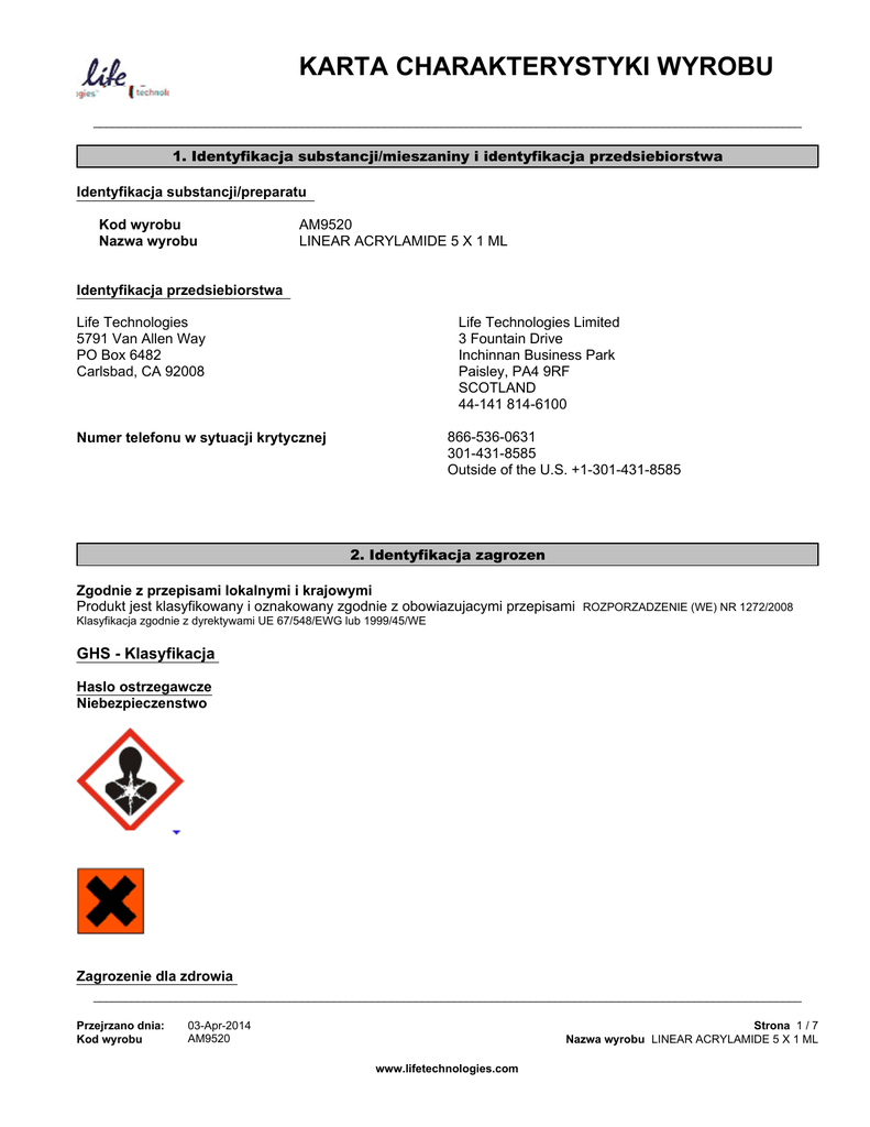 KARTA CHARAKTERYSTYKI WYROBU ________________________________________________________________________________________________________________ 1. Identyfikacja substancji/mieszaniny i identyfikacja przedsiebiorstwa Identyfikacja substancji/preparatu Kod wyrobu Nazwa wyrobu AM9520 LINEAR ACRYLAMIDE 5 X 1 ML Identyfikacja przedsiebiorstwa Life Technologies 5791 Van Allen Way PO Box 6482 Carlsbad, CA 92008 Life Technologies Limited 3 Fountain Drive Inchinnan Business Park Paisley, PA4 9RF SCOTLAND 44-141 814-6100 866-536-0631 301-431-8585 Outside of the U.S. +1-301-431-8585 Numer telefonu w sytuacji krytycznej 2. Identyfikacja zagrozen Zgodnie z przepisami lokalnymi i krajowymi Produkt jest klasyfikowany i oznakowany zgodnie z obowiazujacymi przepisami ROZPORZADZENIE (WE) NR 1272/2008 Klasyfikacja zgodnie z dyrektywami UE 67/548/EWG lub 1999/45/WE GHS - Klasyfikacja Haslo ostrzegawcze Niebezpieczenstwo Zagrozenie dla zdrowia ________________________________________________________________________________________________________________ Przejrzano dnia: Kod wyrobu 03-Apr-2014 AM9520 Strona 1 / 7 Nazwa wyrobu LINEAR ACRYLAMIDE 5 X 1 ML www.lifetechnologies.com Uczulenie ukladu oddechowego Dzialanie uczulajace na skóre Kategoria 1 Kategoria 1 Zagrozenia fizyczne nie stwarza zagrozenia Zwroty wskazujace rodzaj zagrozenia H317 - Moze powodowac reakcje alergiczna skóry H334 - Moze powodowac objawy alergii lub astmy lub trudnosci w oddychaniu w nastepstwie wdychania Zwroty wskazujace srodki ostroznosci P261 - Unikac wdychania pylu/dymu/gazu/mgly/par/rozpylonej cieczy P272 - Zanieczyszczonej odziezy ochronnej nie wynosic poza miejsce pracy P280 - Stosowac rekawice ochronne/odziez ochronna/ochrone oczu/ochrone twarzy P333 + P313 - W przypadku wystapienia podraznienia skóry lub wysypki: Zasiegnac porady/zglosic sie pod opieke lekarza P363 - Wyprac zanieczyszczona odziez przed ponownym uzyciem P285 - W przypadku niedostatecznej wentylacji stosowac indywidualne srodki ochrony dróg oddechowych P304 + P341 - W PRZYPADKU DOSTANIA SIE DO DRÓG ODDECHOWYCH: W przypadku trudnosci z oddychaniem, wyprowadzic lub wyniesc poszkodowanego na swieze powietrze i zapewnic warunki do odpoczynku w pozycji umozliwiajacej swobodne oddychanie Unia Europejska Unia Europejska Klasyfikacja Unii Europejskiej R -zdanie(a) R43 - Moze powodowac uczulenie w przypadku kontaktu ze skóra R42 - Moze powodowac uczulenie w przypadku narazenia droga oddechowa S -zdanie(a) S45 - In case of accident or if you feel unwell, seek medical advice immediately (show the label where possible) S36/37 - Nosic odpowiednia odziez ochronna i odpowiednie rekawice ochronne. Potencjalne skutki zdrowotne Skóra Wdychanie Efekty szczególne dzialanie rakotwórcze Dzialanie mutagenne Szkodliwe dzialanie na rozrodczosc Dzialanie uczulajace Skutki dla narazonych organów W kontakcie ze skóra moze powodowac uczulenie. Moze powodowac podraznienie skóry u osób podatnych. Moze byc szkodliwy droga inhalacji. nie dotyczy nie dotyczy nie dotyczy May cause an allergic skin reaction. Nie ma zadnych w normalnych warunkach uzytkowania ________________________________________________________________________________________________________________ Przejrzano dnia: Kod wyrobu 03-Apr-2014 AM9520 Strona 2 / 7 Nazwa wyrobu LINEAR ACRYLAMIDE 5 X 1 ML www.lifetechnologies.com 3. Sklad/informacja o skladnikach Nazwa Chemiczna Nr CAS 7727-54-0 Ammonium persulfate Nr EINECS 231-786-5 Procent wagowy 0.1-1 Contact with acids or bleach liberates toxic gases. DO NOT ADD acids or bleach to any liquid wastes containing this product. Zalecamy obslugi wszystkich chemikaliów z ostroznoscia. 4. SRODKI PIERWSZEJ POMOCY Natychmiast splukac duza iloscia wody, nie krócej niz 15 minut Zdjac i uprac skazona odziez przed ponownym uzyciem Wymagana jest natychmiastowa opieka medyczna Natychmiast przeplukac duza iloscia wody, takze pod powiekami przynajmniej 15 minut Wymagana jest natychmiastowa opieka medyczna Natychmiast wezwac lekarza Nieprzytomnej osobie nigdy nie podawac nic doustnie Nie wywolywac wymiotów bez konsultacji z lekarzem Przeniesc na swieze powietrze W przypadku braku oddychania zastosowac sztuczne oddychanie Natychmiast wezwac lekarza Leczenie objawowe. Kontakt przez skóre Kontakt z oczami Polkniecie Wdychanie Uwagi dla lekarza 5. POSTEPOWANIE W PRZYPADKU POZARU Stosowne srodki gasnicze Specjalne wyposazenie ochronne dla strazaków pyl wodny dwutlenek wegla (CO2) piana Suche proszki gasnicze Zalozyc sprzet do oddychania z obiegiem zamknietym i odziez ochronna. 6. POSTEPOWANIE W PRZYPADKU NIEZAMIERZONEGO UWOLNIENIA DO SRODOWISKA Indywidualne srodki ostroznosci Uzyc srodków ochrony osobistej Wchlonac w obojetny material sorpcyjny. Metody oczyszczania Srodki ostroznosci w zakresie ochrony srodowiska Zapobiegac dalszemu wyciekowi lub rozlaniu jezeli to bezpieczne Zapobiec przedostaniu sie produktu do kanalizacji W celu uzyskania dodatkowych informacji sprawdz punkt 12 7. POSTEPOWANIE Z SUBSTANCJAMI I MIESZANINAMI ORAZ ICH MAGAZYNOWANIE Unikac kontaktu ze skóra, oczami i ubraniem. Stosowac srodki ochrony osobistej. Postepowanie z substancja/preparatem Magazynowanie Przechowywac w suchym, chlodnym i dobrze wentylowanym miejscu Przechowywac we wlasciwie oznakowanych pojemnikach 8. Kontrola narazenia/srodki ochrony indywidualnej Limity natezen ________________________________________________________________________________________________________________ Przejrzano dnia: Kod wyrobu 03-Apr-2014 AM9520 Strona 3 / 7 Nazwa wyrobu LINEAR ACRYLAMIDE 5 X 1 ML www.lifetechnologies.com Nazwa Chemiczna Ammonium persulfate 7727-54-0 EU OEL (TWA) Zaden EU OEL (STEL) Zaden EU Skin Notation Zaden Nazwa Chemiczna Ammonium persulfate 7727-54-0 Austria Zaden Belgium (TWA) 0.1 mg/m3 Denmark (TWA) Zaden Finland OEL (TWA) Zaden Nazwa Chemiczna Ammonium persulfate 7727-54-0 France OEL (VME) Zaden Germany OEL (TWA) Zaden Ireland (TWA) 0.1 mg/m3 Italy OEL (TWA) Zaden Nazwa Chemiczna Sweden - Occupati