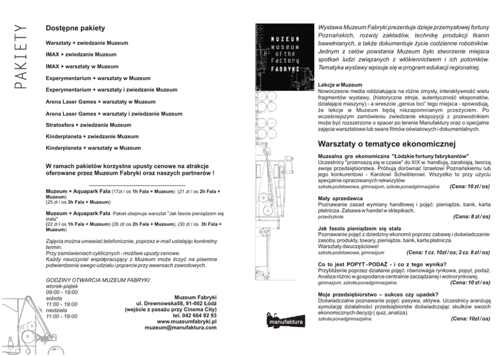 Wystawa Muzeum Fabryki prezentuje dzieje przemysłowej fortuny Poznańskich, rozwój zakładów, technikę produkcji tkanin bawełnianych, a także dokumentuje życie codzienne robotników. Jednym z celów powstania Muzeum było stworzenie miejsca spotkań ludzi związanych z włókiennictwem i ich potomków. Tematyka wystawy wpisuje się w program edukacji regionalnej. Dostępne pakiety Warsztaty + zwiedzanie Muzeum IMAX + zwiedzanie Muzeum IMAX + warsztaty w Muzeum Experymentarium + warsztaty w Muzeum Lekcje w Muzeum Nowoczesne media oddziałujące na różne zmysły, interaktywność wielu fragmentów wystawy, (historyczne stroje, autentyczność eksponatów, działające maszyny) - a wreszcie „genius loci” tego miejsca - spowodują, że lekcje w Muzeum będą niezapomnianym przeżyciem. Po wcześniejszym zamówieniu zwiedzanie ekspozycji z przewodnikiem może być rozszerzone o spacer po terenie Manufaktury oraz o specjalne zajęcia warsztatowe lub seans filmów oświatowych i dokumentalnych. Experymentarium + warsztaty i zwiedzanie Muzeum Arena Laser Games + warsztaty w Muzeum Arena Laser Games + warsztaty i zwiedzanie Muzeum Stratosfera + zwiedzanie Muzeum Kinderplaneta + zwiedzanie Muzeum Warsztaty o tematyce ekonomicznej Kinderplaneta + warsztaty w Muzeum Muzealna gra ekonomiczna "Łódzkie fortuny fabrykantów" Uczestnicy "przenoszą się w czasie" do XIX w. handlują, zarabiają, tworzą swoje przedsiębiorstwa. Próbują dorównać Izraelowi Poznańskiemu lub jego konkurentowi - Karolowi Scheiblerowi. Wszystko to przy użyciu specjalnie opracowanych rekwizytów. szkoła podstawowa, gimnazjum, szkoła ponadgimnazjalna (Cena: 10 zł / os) W ramach pakietów korzystne upusty cenowe na atrakcje oferowane przez Muzeum Fabryki oraz naszych partnerów ! -----------------------------------------------------Muzeum + Aquapark Fala (17zł / os 1h Fala + Muzeum) (21 zł / os 2h Fala + Muzeum) (25 zł / os 3h Fala + Muzeum) Mały sprzedawca Poznawanie zasad wymiany handlowej i pojęć: pieniądze, bank, karta płatnicza. Zabawa w handel w sklepikach. przedszkole (Cena: 8 zł / os) Muzeum + Aquapark Fala Pakiet obejmuje warsztat "Jak fasola pieniądzem się stała" (22 zł / os 1h Fala + Muzeum) (26 zł/ os 2h Fala + Muzeum), (30 zł / os 3h Fala + Muzeum) Jak fasola pieniądzem się stała Poznawanie pojęć z dziedziny ekonomii poprzez zabawę i doświadczanie: zasoby, produkty, towary, pieniądze, bank, karta płatnicza. Warsztaty dwuczęściowe! szkoła podstawowa, gimnazjum (Cena: 1 cz. 10zł / os; 2 cz. 8 zł / os) Zajęcia można umawiać telefonicznie, poprzez e-mail ustalając konkretny termin. Przy zamówieniach cyklicznych - możliwe upusty cenowe. Każdy nauczyciel współpracujący z Muzeum może liczyć na pisemne potwierdzenie swego udziału i poparcie przy awansach zawodowych. GODZINY OTWARCIA MUZEUM FABRYKI wtorek-piątek 09:00 - 19:00 Muzeum Fabryki sobota ul. Drewnowska58, 91-002 Łódź 11:00 - 19:00 (wejście z pasażu przy Cinema City) niedziela tel. 042 664 92 93 11:00 - 19:00 www.muzeumfabryki.pl [email protected] Co to jest POPYT - PODAŻ - i co z tego wynika? Przybliżenie poprzez działanie pojęć: równowaga rynkowa, popyt, podaż. Analiza różnic w gospodarce centralnie zarządzanej i wolnorynkowej. gimnazjum, szkoła ponadgimnazjalna. (Cena: 10 zł / os) manufaktura Moje przedsiębiorstwo – sukces czy upadek? Doświadczalne poznawanie pojęć: pasywa, aktywa. Uczestnicy aranżują symulację działalności przedsiębiorstw doświadczając skutków swoich ekonomicznych decyzji ( quiz, analiza). szkoła ponadgimnazjalna. (Cena: 10zł / os) W co się ubrać? Różnorodność ubiorów - w zależności od stosowanych surowców, regionów świata i czasu. "Bądź elegancki" - zabawa w dobór odpowiedniego stroju do okoliczności w jakich zostają użyte. (7 zł / os) W dawnej fabryce - teatr cieni Slajdy z dawnych hal fabrycznych, domów mieszkalnych, przestrzeni miejskich lub wykonanych przez dzieci stanowią scenografię do odtwarzania scenek z życia pracowników fabryki w stylistyce „teatru cieni”. Scenki odtwarzane są z zastosowaniem gotowych figur oraz wykonanych przez dzieci. (7 zł / os) "Jedzie pociąg z bawełną..." Aktywne poznawanie ekspozycji polegające na zabawie z kostką i pionkami wyznaczającymi rytm zwiedzania najciekawszych zakątków Muzeum Fabryki. Angażująca dzieci forma zajęć, przystosowana do najmłodszych, wykorzystuje min. znany motyw zabawy w pociąg. (8 zł / os) Budujemy wielką fabrykę Na dużej przestrzeni dzieci tworzą makietę fabryki - konkursy i zabawy, rysunki na dużych formatach. (7 zł / os) Jak powstaje tkanina? Poznawanie procesu wytwarzania tkaniny (surowiec, przędza, tkanina) przy pomocy muzealnych rekwizytów połączone z próbą tkania na krośnie ręcznym. (8 zł / os) W co się ubrać? Krótki zarys historii ubioru ze wskazaniem na zależności stosowanych surowców i regionów świata. Projektowanie ubioru z rożnych materiałów np. dla kosmity, na dzień wagarowicza. (8 zł / os) Miasto w mieście Królestwo Poznańskiego - zwiedzanie terenu Manufaktury, poznawanie przeznaczenia budynków, rejestrowanie zmian w obszarze dawnej fabryki, porównywanie map z różnych okresów i konfrontacja ze stanem obecnym. Próba stworzenia własnej fabryki. (7 zł / os) Tkanina i co dalej? (dla szkoły podstawowej) Proces powstawania tkaniny, sposoby jej wykończania, przeznaczenie. Wykonanie projektów: ubioru, druku na tkaninę. Wykonanie matrycy dla jednego koloru i za jej pomocą - druku. (8 zł / os) Kuferek Poznańskiego Poznawanie historii fabryki poprzez wykonywanie zadań z wykorzystaniem pomocy zawartych w kuferkach. Działanie samodzielne w grupach obejmujące teren Muzeum i Manufaktury. Różnorodność zadań, ciekawa intryga wciąga w świat tajemnic dawnej fabryki. (8 zł / os) Tkanina i co dalej? (dla klas gimnazjalnych) Proces powstawania tkaniny, sposoby jej wykończania. Próba wykonania pr