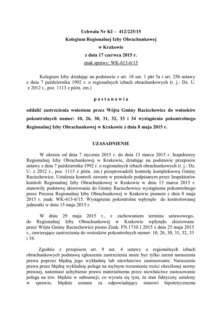 Uchwała Nr KI – 412/225/15 Kolegium Regionalnej Izby Obrachunkowej w Krakowie z dnia 17 czerwca 2015 r. znak sprawy: WK-613-6/15 Kolegium Izby działając na podstawie z art. 18 ust. 1 pkt 5a i art. 25b ustawy z dnia 7 października 1992 r. o regionalnych izbach obrachunkowych (t. j.: Dz. U. z 2012 r., poz. 1113 z późn. zm.) postanawia oddalić zastrzeżenia wniesione przez Wójta Gminy Raciechowice do wniosków pokontrolnych numer: 10, 26, 30, 31, 32, 33 i 34 wystąpienia pokontrolnego Regionalnej Izby Obrachunkowej w Krakowie z dnia 8 maja 2015 r. UZASADNIENIE W okresie od dnia 7 stycznia 2015 r. do dnia 13 marca 2015 r. Inspektorzy Regionalnej Izby Obrachunkowej w Krakowie, działając na podstawie przepisów ustawy z dnia 7 października 1992 r. o regionalnych izbach obrachunkowych (t. j.: Dz. U. z 2012 r., poz. 1113 z późn. zm.) przeprowadzili kontrolę kompleksową Gminy Raciechowice. Ustalenia kontroli zawarte w protokole podpisanym przez Inspektorów kontroli Regionalnej Izby Obrachunkowej w Krakowie w dniu 13 marca 2015 r. stanowiły podstawę skierowania do Gminy Raciechowice wystąpienia pokontrolnego przez Prezesa Regionalnej Izby Obrachunkowej w Krakowie pismem z dnia 8 maja 2015 r. znak: WK-613-6/15. Wystąpienie pokontrolne wpłynęło do kontrolowanej jednostki w dniu 15 maja 2015 r. W dniu 29 maja 2015 r., z zachowaniem terminu ustawowego, do Regionalnej Izby Obrachunkowej w Krakowie wpłynęło skierowane przez Wójta Gminy Raciechowice pismo Znak: FN.1710.1.2015 z dnia 25 maja 2015 r., zawierające zastrzeżenia do wniosków pokontrolnych numer: 10, 26, 30, 31, 32, 33 i 34. Zgodnie z przepisem art. 9 ust. 4 ustawy o regionalnych izbach obrachunkowych podstawą zgłoszenia zastrzeżenia może być tylko zarzut naruszenia prawa poprzez błędną jego wykładnię lub niewłaściwe zastosowanie. Naruszenie prawa przez błędną wykładnię polega na mylnym rozumieniu treści określonej normy prawnej, natomiast uchybienie prawu materialnemu przez niewłaściwe zastosowanie polega na tzw. błędzie w subsumcji, co wyraża się tym, że stan faktyczny ustalony w sprawie, błędnie uznano za odpowiadający stanowi hipotetycznemu przewidzianemu w normie prawnej, albo że ustalonego stanu faktycznego błędnie nie "podciągnięto" pod hipotezę określonej normy prawnej (J. P. Tarno, Prawo o postępowaniu przed sądami administracyjnymi. Komentarz, Warszawa 2004, s. 245246 oraz T. Woś, H. Knysiak - Molczyk, M. Romańska, Postępowanie sądowoadministracyjne, Warszawa 2004, s. 328-329). Kolegium Izby rozpatrując zastrzeżenia Wójta Gminy Raciechowice, po przeanalizowaniu treści wystąpienia pokontrolnego Prezesa Regionalnej Izby Obrachunkowej w Krakowie do Wójta Gminy Raciechowice z dnia 8 maja 2015 r. wraz z odpowiednimi ustaleniami kontroli udokumentowanymi w protokole kontroli kompleksowej oraz załącznikami, stwierdziło co następuje: 1. Wniosek pokontrolny nr 10 Wniosek pokontrolny nr 10 brzmiał: „Przestrzeganie przepisów określonych w Rozporządzeniu Ministra Finansów z dnia 16 stycznia 2014 r. w sprawie sprawozdawczości budżetowej (Dz. U. z 2014 r., poz. 119, z późn. zm.), poprzez wykazywanie w sprawozdaniach wszystkich wydatków.”. Powyższy wniosek został sformułowany w związku ze stwierdzoną w wyniku kontroli nieprawidłowością przedstawioną w „opisie nieprawidłowości do wniosku pokontrolnego nr 10”, polegającą na naruszeniu postanowień rozporządzenia Ministra Finansów w sprawie sprawozdawczości budżetowej, poprzez: a) zaniżenie o łączną kwotę 763.769,42 zł, w sprawozdaniu Rb 28S miesięczne/roczne sprawozdanie z wykonania planu wydatków budżetowych jst, sporządzonym za okres od początku roku do dnia 31 stycznia 2013 r. wysokości wydatków wykonanych, poniesionych w styczniu 2013 r. z rachunku wydatków: Urzędu Gminy, bieżącego GZEAS i Środowiskowego Domu Samopomocy, czym naruszono postanowienia § 9 ust. 1 Rozporządzenia Ministra Finansów w sprawie sprawozdawczości budżetowej z dnia 3 lutego 2010 r., b) zaniżenie o kwotę 282.232,77 zł, w sprawozdaniu Rb 28S miesięczne/roczne sprawozdanie z wykonania planu wydatków budżetowych jst, sporządzonym za okres od początku roku do dnia 30 września 2014 r. wysokości wydatków wykonanych, poniesionych we wrześniu 2014 r. z rachunku wydatków Urzędu Gminy, czym naruszono postanowienia § 9 ust 1 Rozporządzenia Ministra Finansów w sprawie sprawozdawczości budżetowej z dnia 16 stycznia 2014 r. W zastrzeżeniach do wniosku pokontrolnego nr 10, Wójt Gminy Raciechowice wskazał, że cyt.: „Kwoty wymienione w opisie nieprawidłowości do wniosku dotyczyły restrukturyzacji zadłużenia Gminy zgodnie z umową nr 281/2013 z dnia 18 stycznia 2013 r. i nie stanowiły wydatku gminy, bowiem w całości przeznaczone były na spłatę wymagalnych zobowiązań gminy, które to zostały wyraźnie wskazane i opisane w załączniku nr l do umowy w sprawie refinansowania zobowiązań. Z treści umowy wynika, że kwoty te nie mogły być spożytkowane na żaden inny cel, niż spłata wierzytelności, których lista ze wskazaniem na poszczególne kwoty zobowiązań była integralną częścią umowy o restrukturyzację zadłużenia i przejęcia długu. W związku z tym kwoty te nie stanowiły wydatku gminy i nie mogły być wykazane w sprawozdaniu Rb 28S. Wydatek ten był wydatkiem spółki przejmującej dług, zgodnie z postanowieniami umowy, z którymi to spółka nabyła dług i zobowiązała gminę do dokonania w imieniu spółki przelewów na rachunki bankowe wymienione w zał. nr 1. Wskutek przejęcia długu gmina została zwolniona z wydatków, które przejęła spółka i wstąpiła w prawa wierzyciela. Skoro zmienił się termin zapłaty wierzytelności na rzecz spółki, wydatkiem gminy będzie dopiero spłata długu na rzecz spółki”. Wójt Gminy Raciechowice, w zastrzeżeniach do wniosku pokontrolnego nr 10 nie podniósł argumentacji wskazującej na do