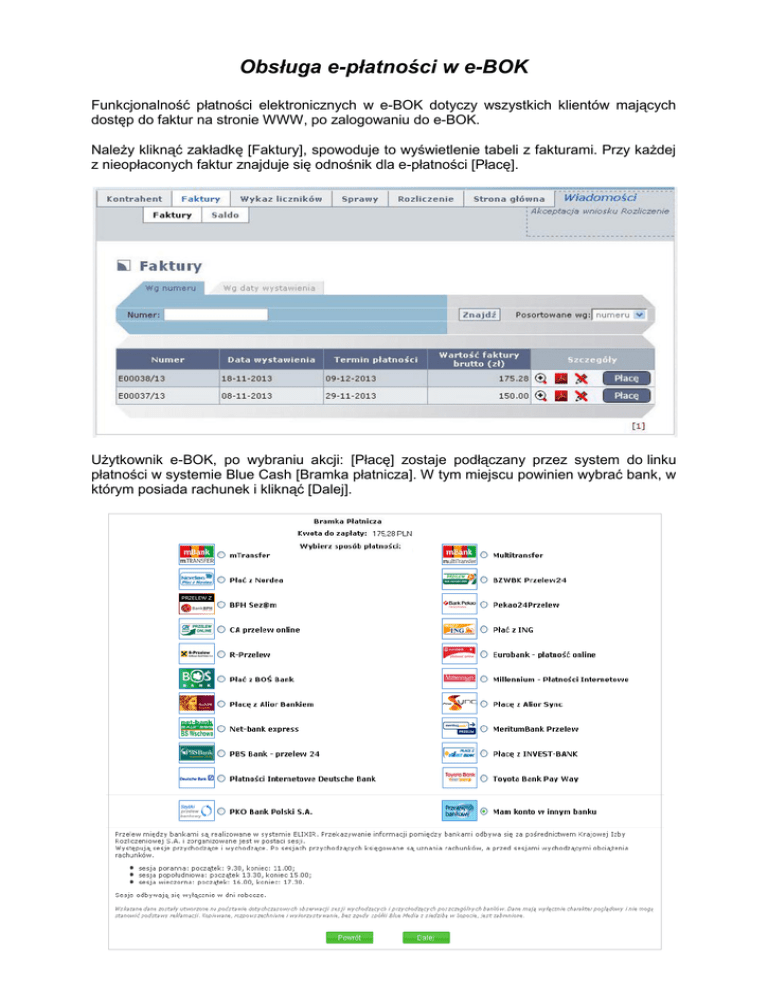 Obsługa e-płatności w e-BOK Funkcjonalność płatności elektronicznych w e-BOK dotyczy wszystkich klientów mających dostęp do faktur na stronie WWW, po zalogowaniu do e-BOK. Należy kliknąć zakładkę [Faktury], spowoduje to wyświetlenie tabeli z fakturami. Przy każdej z nieopłaconych faktur znajduje się odnośnik dla e-płatności [Płacę]. Użytkownik e-BOK, po wybraniu akcji: [Płacę] zostaje podłączany przez system do linku płatności w systemie Blue Cash [Bramka płatnicza]. W tym miejscu powinien wybrać bank, w którym posiada rachunek i kliknąć [Dalej]. W kolejnym kroku, system przenosi użytkownika do bankowości internetowej. W tym momencie wyświetli się wypełniony formularz przelewu, który trzeba potwierdzić kodem autoryzacji. Spowoduje to opłacenie faktury. Po zakończeniu transakcji użytkownik otrzymuje na ekranie komunikat. Na wykazie faktur płatnika po stronie WWW, prezentowany jest wynik zrealizowanej e-płatności. Następuje zablokowanie ponownego wysłania e-płatności w przypadku poprawnie zakończonej operacji (dla opłaconej faktury klawisz [Płacę] znika). Zablokowanie e-płatności następuje również, gdy w widoku salda płatnika widnieje wpis zawierający płatność na pełną kwotę faktury. Może się zdarzyć, że użytkownik już wcześniej dokonywał prób opłaty za fakturę. W takim przypadku przed pojawieniem się bramki płatniczej pojawi się komunikat. Wpłata zostanie zaksięgowana na koncie klienta w przeciągu 2 dni roboczych.