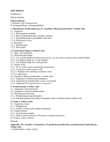 SPIS TREŚCI Przedmowa Wykaz skrótów Wprowadzenie I. Wolność woli i konieczność II. Kompatybilizm i inkompatybilizm 1. Filozoficzne źródła doktryny św. Anzelma o Bożej przedwiedzy i wolnej woli 1.1. Augustyn 1.1.1. Rozwiązanie modalne 1.1.2. Boża przedwiedza jako gwarant wolności 1.1.3. Przypadek Boga a przypadek człowieka 1.1.4. Wieczność a czas 1.2. Boecjusz 1.2.1. Konieczność 1.2.2. Wieczność 2. Przedwiedza Boga a wolność woli 2.1. Bóg - byt doskonały 2.2. (Przed)wiedza Boga 2.2.1. Czy wiedza Boga jest przyczyną rzeczy, czy też rzeczy są przyczyną wiedzy Boga? 2.2.2. Czy Bóg poznaje to, co nie istnieje? 2.2.3. Czy Bóg poznaje zło, czyli grzech? 2.3. Wolna wola 2.3.1. Po co wolna wola rozumnemu stworzeniu? 2.3.2. Czym jest wolny wybór woli? 2.3.2.1. Podział woli i definicja wolności woli 2.3.2.2. Affectiones 2.4. Zgodność Bożej przedwiedzy z wolną wolą 2.4.1. Argument I: konieczność następcza 2.4.2. Argument II: przedwiedza a czas i wieczność 2.4.3. Argument III: argumentum ex concesso 3. Predestynacja a wolna wola 3.1. Augustyn o przeznaczeniu 3.2. Eriugena w sprawie predestynacji 3.3. Rozwiązanie Anzelma 3.3.1. Predestynacja a przedwiedza 3.3.2. Jak Bóg predestynuje fakty przygodne, które zachodzą dzięki wolnej woli 4. Łaska a wolny wybór 4.1. Augustyn o łasce 4.1.1. Pelagianizm 4.1.2. Łaska a wolna wola według Augustyna 4.2. Natura a łaska 4.2.1. Grzech pierworodny 4.2.2. Wolny wybór (liberum arbitrium) a wolność (libertas) 4.3. Łaska, wola, wolność Wnioski Appendix. Św. Anzelm z Canterbury. O zgodności przedwiedzy, predestynacji i łaski Bożej z wolną wolą 1. Przedwiedza i wolny wybór 2. Predestynacja i wolny wybór 3. Łaska i wolny wybór Bibliografia Indeks osób Summary