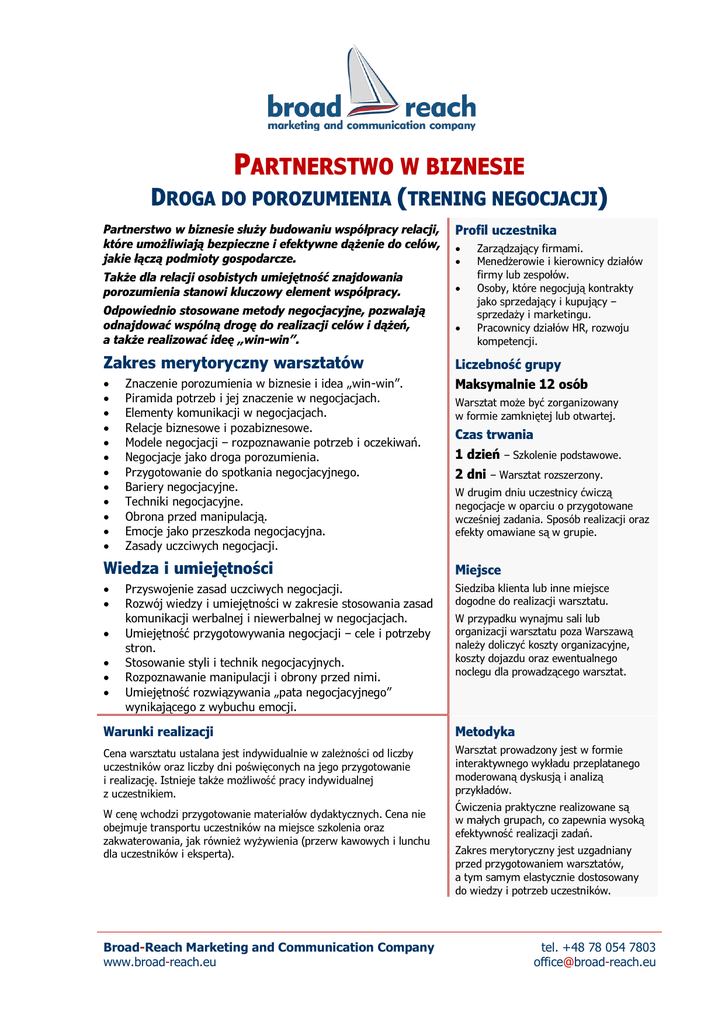 PARTNERSTWO W BIZNESIE DROGA DO POROZUMIENIA (TRENING NEGOCJACJI) Partnerstwo w biznesie służy budowaniu współpracy relacji, które umożliwiają bezpieczne i efektywne dążenie do celów, jakie łączą podmioty gospodarcze. Profil uczestnika Zarządzający firmami. Menedżerowie i kierownicy działów firmy lub zespołów. Osoby, które negocjują kontrakty jako sprzedający i kupujący – sprzedaży i marketingu. Pracownicy działów HR, rozwoju kompetencji. Także dla relacji osobistych umiejętność znajdowania porozumienia stanowi kluczowy element współpracy. Odpowiednio stosowane metody negocjacyjne, pozwalają odnajdować wspólną drogę do realizacji celów i dążeń, a także realizować ideę „win-win”. Zakres merytoryczny warsztatów Liczebność grupy Maksymalnie 12 osób Znaczenie porozumienia w biznesie i idea „win-win”. Piramida potrzeb i jej znaczenie w negocjacjach. Elementy komunikacji w negocjacjach. Relacje biznesowe i pozabiznesowe. Modele negocjacji – rozpoznawanie potrzeb i oczekiwań. Negocjacje jako droga porozumienia. Przygotowanie do spotkania negocjacyjnego. Bariery negocjacyjne. Techniki negocjacyjne. Obrona przed manipulacją. Emocje jako przeszkoda negocjacyjna. Zasady uczciwych negocjacji. Warsztat może być zorganizowany w formie zamkniętej lub otwartej. Czas trwania 1 dzień – Szkolenie podstawowe. 2 dni – Warsztat rozszerzony. W drugim dniu uczestnicy ćwiczą negocjacje w oparciu o przygotowane wcześniej zadania. Sposób realizacji oraz efekty omawiane są w grupie. Wiedza i umiejętności Miejsce Siedziba klienta lub inne miejsce dogodne do realizacji warsztatu. Przyswojenie zasad uczciwych negocjacji. Rozwój wiedzy i umiejętności w zakresie stosowania zasad komunikacji werbalnej i niewerbalnej w negocjacjach. Umiejętność przygotowywania negocjacji – cele i potrzeby stron. Stosowanie styli i technik negocjacyjnych. Rozpoznawanie manipulacji i obrony przed nimi. Umiejętność rozwiązywania „pata negocjacyjnego” wynikającego z wybuchu emocji. W przypadku wynajmu sali lub organizacji warsztatu poza Warszawą należy doliczyć koszty organizacyjne, koszty dojazdu oraz ewentualnego noclegu dla prowadzącego warsztat. Warunki realizacji Metodyka Cena warsztatu ustalana jest indywidualnie w zależności od liczby uczestników oraz liczby dni poświęconych na jego przygotowanie i realizację. Istnieje także możliwość pracy indywidualnej z uczestnikiem. Warsztat prowadzony jest w formie interaktywnego wykładu przeplatanego moderowaną dyskusją i analizą przykładów. W cenę wchodzi przygotowanie materiałów dydaktycznych. Cena nie obejmuje transportu uczestników na miejsce szkolenia oraz zakwaterowania, jak również wyżywienia (przerw kawowych i lunchu dla uczestników i eksperta). Broad-Reach Marketing and Communication Company www.broad-reach.eu Ćwiczenia praktyczne realizowane są w małych grupach, co zapewnia wysoką efektywność realizacji zadań. Zakres merytoryczny jest uzgadniany przed przygotowaniem warsztatów, a tym samym elastycznie dostosowany do wiedzy i potrzeb uczestników. tel. +48 78 054 7803 [email protected]