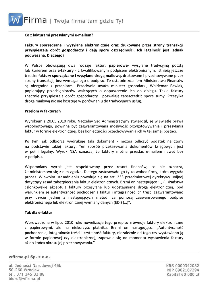 Co z fakturami przesyłanymi e-mailem? Faktury sporządzane i wysyłane elektronicznie oraz drukowane przez strony transakcji przyspieszają obrót gospodarczy i dają spore oszczędności. Ich legalność jest jednak podważana. Dlaczego? W Polsce obowiązują dwa rodzaje faktur: papierowe- wysyłane tradycyjną pocztą lub kurierem oraz e-faktury - z kwalifikowanym podpisem elektronicznym. Istnieją jeszcze trzecie: faktury sporządzane i wysyłane drogą mailową, drukowane i przechowywane przez strony transakcji, bez wymaganego e-podpisu. Te ostatnie zdaniem Ministerstwa Finansów są niezgodne z przepisami. Przeciwnie uważa minister gospodarki, Waldemar Pawlak, popierający przedsiębiorców walczących o dopuszczenie ich do obiegu. Takie faktury znacznie przyspieszają obrót gospodarczy i pozwalają zaoszczędzić spore sumy. Przesyłka drogą mailową nic nie kosztuje w porównaniu do tradycyjnych usług. Przełom w fakturach Wyrokiem z 20.05.2010 roku, Naczelny Sąd Administracyjny stwierdził, że w świetle prawa wspólnotowego, powinna być zagwarantowana możliwość przygotowywania i przesyłania faktur w formie elektronicznej, bez konieczności przechowywania ich w tej samej postaci. Po tym, jak odbiorca wydrukuje taki dokument - można odliczyć podatek naliczony na podstawie takiej faktury. Ten sposób przekazywania dokumentów księgowych jest w pełni legalny. Wyrok NSA oznacza, że faktury można przesłać e-mailem nawet bez e-podpisu. Wspomniany wyrok jest respektowany przez resort finansów, co nie oznacza, że ministerstwo się z nim zgadza. Dlatego zastosowało go tylko wobec firmy, która wygrała proces. W swoim uzasadnieniu powołuje się na art. 233 przedmiotowej dyrektywy unijnej dotyczący zasad zabezpieczania faktur elektronicznych. Brzmi on następująco : „ (…)Państwa członkowskie akceptują faktury przesyłane lub udostępniane drogą elektroniczną, pod warunkiem że autentyczność pochodzenia faktur i integralność ich treści zagwarantowano przy użyciu jednej z następujących metod: za pomocą zaawansowanego podpisu elektronicznego lub elektronicznej wymiany danych (EDI) (…)”. Tak dla e-faktur Wprowadzona w lipcu 2010 roku nowelizacja tego przepisu zrównuje faktury elektroniczne z papierowymi, ale na niekorzyść płatnika. Brzmi on następująco: „Autentyczność pochodzenia, integralność treści i czytelność faktury, niezależnie od tego czy wystawiono ją w formie papierowej czy elektronicznej, zapewnia się od momentu wystawienia faktury aż do końca okresu jej przechowywania.” Nowa regulacja nakazuje przedsiębiorcom określenie sposobu zapewnienia owej autentyczności pochodzenia, integralności treści i czytelności. Oznacza to, że firmy będą musiały stworzyć odpowiednie procedury, które będą mogły podlegać kontroli urzędów. Ich spełnienie potwierdzi odpowiedni, płatny audyt. Wnioski przez internet Wprowadzenie systemu elektronicznego zastosowano również w przypadku zwrotu podatku VAT. Dnia 1 stycznia 2010 roku weszła w życie dyrektywa unijna, dzięki której podatnicy mogą uzyskać zwrot VAT za wydatki poniesione z tytułu działalności gospodarczej w państwie UE, w którym nie posiadają swojej siedziby. Wprowadzony system elektroniczny umożliwia podatnikowi złożenie wniosku o zwrot podatku poprzez portal internetowy zaprojektowany przez państwo członkowskie, w którym ma on swoją siedzibę. Jego celem jest uproszczenie procesu i zmniejszenie obciążeń administracyjnych. Niestety, proces uruchomienia takich witryn znacznie się wydłużył i został przesunięty z 1 stycznia 2010 roku na marzec 2011 r. Nowa dyrektywa w sprawie podatku VAT pozwala wybrać trzeci sposób sporządzania i przesyłania faktur drogą elektroniczną. Czy znajdzie zastosowanie w krajowych przepisach? -----------------------------------------------------------------------------------------------------------------------Wfirma.pl jest serwisem internetowym, oferującym m.in. usługi fakturowania i księgowości on-line. Platforma skierowana głównie do mikro i małych przedsiębiorców. Firma działa na rynku od 2005 roku. Zyskała w tym czasie uznanie 10 tysięcy zarejestrowanych użytkowników. Kontakt dla mediów: Agnieszka Zwierzyńska Specjalista ds. PR i marketingu Tel. +48 509 057 454 [email protected] wFirma.pl - nowoczesna platforma zarządzania firmą Zarządzanie firmą przez internet staje się coraz bardziej popularne. W jednym miejscu mamy dostęp do księgowości, fakturowania, CRM, kadr i analiz. Takie narzędzia oferuje przedsiębiorcom serwis wFirma.pl. Internet znajduje zastosowanie w każdej dziedzinie życia, z powodzeniem sprawdza się również w biznesie. Potencjał sieci i nowoczesnych rozwiązań informatycznych może zostać wykorzystany w zarządzaniu firmą. Wychodząc naprzeciw potrzebom mikro i małych przedsiębiorców stworzyliśmy serwis wFirma.pl. Platforma łączy w sobie zestaw narzędzi do zarządzania własnym biznesem. Wśród nich: księgowość, fakturowanie, CRM, kadry i analizy. Księgowość – wszędzie i w każdej chwili Serwis wFirma.pl, dzięki zastosowaniu schematów księgowych, pozwala na samodzielne prowadzenie uproszczonej księgowości on-line firmy. Po wprowadzeniu danych, automatycznie generowane są wszystkie dostępne w obrocie gospodarczym deklaracje i faktury w kilku językach i walutach dostępnych w tabeli NBP. Platforma umożliwia m.in. rejestr zakupu i sprzedaży VAT, ewidencję środków trwałych, ewidencję wyposażenia i pojazdów wraz z rozliczeniem kosztów oraz prowadzenie podatkowej księgi przychodów i rozchodów. Co ważne, system na bieżąco aktualizuje wszystkie wskaźniki, aby były zgodne ze zmieniającymi się przepisami. Wystarczy połączenie internetowe, by wszędzie i o każdej porze mieć dostęp do istotnych dokumentów firmowych. Oszczędność przede wszystkim Bez wątpienia zaletą prowadzenia księgowości internetowej są