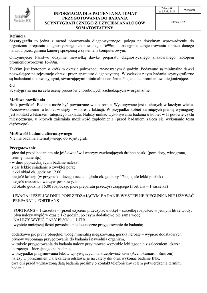 INFORMACJA DLA PACJENTA NA TEMAT PRZYGOTOWANIA DO BADANIA SCYNTYGRAFICZNEGO Z UŻYCIEM ANALOGÓW SOMATOSTATYNY Załącznik nr 2.7 do P-24 Wersja 01 Strona 1 z 2 Definicja Scyntygrafia to jedna z metod obrazowania diagnostycznego; polega na dożylnym wprowadzeniu do organizmu preparatu diagnostycznego znakowanego Tc99m, a następnie zarejestrowaniu obrazu danego narządu przez gamma kamerę sprzężoną z systemem komputerowym. Otrzymujecie Państwo dożylnie niewielką dawkę preparatu diagnostycznego znakowanego izotopem promieniotwórczym Tc-99m. Tc-99m jest izotopem o krótkim okresie półrozpadu wynoszącym 6 godzin. Podawane są minimalne dawki pozwalające na rejestrację obrazu przez aparaturę diagnostyczną. W związku z tym badania scyntygraficzne są badaniami nieinwazyjnymi, stwarzającymi minimalne narażenie Pacjenta na promieniowanie jonizujące. Cel Scyntygrafia ma na celu ocenę procesów chorobowych zachodzących w organizmie. Możliwe powikłania Brak powikłań. Badanie może być powtarzane wielokrotnie. Wykonywane jest u chorych w każdym wieku. Przeciwwskazane u kobiet w ciąży i w okresie laktacji. W przypadku kobiet karmiących piersią wymagany jest kontakt z lekarzem tutejszego zakładu. Należy unikać wykonywania badania u kobiet w II połowie cyklu miesięcznego, u których zaistniała możliwość zapłodnienia (przed badaniem zaleca się wykonanie testu ciążowego). Możliwość badania alternatywnego Nie ma badania alternatywnego do scyntygrafii. Przygotowanie - pięć dni przed badaniem nie jeść owoców i warzyw zawierających drobne pestki (pomidory, winogrona, siemię lniane itp.) - w dniu poprzedzającym badanie należy: zjeść lekkie śniadanie o zwykłej porze lekki obiad ok. godziny 12.00 nie jeść kolacji (w przypadku dużego uczucia głodu ok. godziny 17-tej zjeść lekki posiłek) nie jeść owoców i warzyw pestkowych od około godziny 15.00 rozpocząć picie preparatu przeczyszczającego (Fortrans – 1 saszetka) UWAGA! JEŻELI W DNIU POPRZEDZAJĄCYM BADANIE WYSTĘPUJE BIEGUNKA NIE UŻYWAĆ PREPARATU FORTRANS FORTRANS – 1 saszetka – (przed użyciem przeczytać ulotkę) – saszetkę rozpuścić w jednym litrze wody; płyn należy wypić w czasie 1-2 godzin; po czym dodatkowo pić samą wodę NALEŻY WYPIĆ CAŁY PŁYN – 1 LITR wypicie mniejszej ilości powoduje niedostateczne przygotowanie do badania; dodatkowo pić płyny obojętne: wodę mineralną niegazowaną, gorzką herbatę – wypicie dodatkowych płynów wspomaga przygotowanie do badania i nawadnia organizm, w trakcie przygotowania do badania należy przyjmować wszystkie leki zgodnie z zaleceniem lekarza leczącego – kierującego na badanie, w przypadku przyjmowania leków wpływających na krzepliwość krwi (Acenokumarol, Sintrom) należy w porozumieniu z lekarzem odstawić je na cztery dni oraz wykonać badanie INR, dwa dni przed wyznaczoną datą badania prosimy o kontakt telefoniczny celem potwierdzenia terminu badania INFORMACJA DLA PACJENTA NA TEMAT PRZYGOTOWANIA DO BADANIA SCYNTYGRAFICZNEGO Z UŻYCIEM ANALOGÓW SOMATOSTATYNY Załącznik nr 2.7 do P-24 Wersja 01 Strona 2 z 2 W dniu badania należy pić wodę mineralną niegazowaną nie wolno jeść do czasu badania nie palić papierosów Na badanie proszę zabrać z sobą skierowanie i wyniki badań oraz wypisy ze szpitala, a także wyrazić pisemną świadomą zgodę na przeprowadzenie badania. Zalecenia po badaniu Do badania używane są preparaty promieniotwórcze. Wymagane jest zachowanie pewnych zasad bezpieczeństwa. Pacjenci po badaniu scyntygraficznym przez okres 24 godzin powinni unikać bliskiego kontaktu z kobietami ciężarnymi, małymi dziećmi a także ograniczyć przebywanie w dużych skupiskach ludzkich. Po podaniu znacznika izotopowego zaleca się: 1. Pacjentom nie powinny towarzyszyć małe dzieci i kobiety w ciąży 2. Picie dużej ilości płynów (znacznik wydala się z moczem – należy dwukrotnie spłukiwać toaletę po każdym użyciu) Badania scyntygraficzne nie są niebezpieczne dla zdrowia – znacznik rozkłada się po dwóch dobach.
