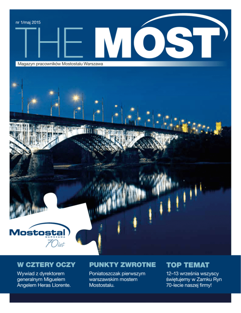 THE MOST nr 1/maj 2015 Magazyn pracowników Mostostalu Warszawa W CZTERY OCZY PUNKTY ZWROTNE TOP TEMAT Wywiad z dyrektorem generalnym Miguelem Angelem Heras Llorente. Poniatoszczak pierwszym warszawskim mostem Mostostalu. 12–13 września wszyscy świętujemy w Zamku Ryn 70-lecie naszej firmy! W NUMERZE OD REDAKCJI TO JUŻ 70 LAT! „TYLKO RAZEM MOŻEMY ZBUDOWAĆ CAŁOŚĆ IDEALNĄ” D OD REDAKCJI PUNKTY ZWROTNE PROSTO Z MOSTU 3 To już 70 lat! „Tylko razem możemy 9 Odbudowa Poniatoszczaka 16 J esteśmy częścią jednej układanki 11 Rozbudowa Elektrowni WSPÓLNYMI SIŁAMI zbudować całość idealną” FLESZ 4 Na 70-lecie z tytułem Created in Poland Superbrands 4 Jeśli świętować, to tylko razem z klientami! 5 Z mostami za pan brat, czyli warszawski spacer szlakiem „naszych” realizacji W CZTERY OCZY 6 Mam duże szczęście do ludzi naszą pierwszą realizacją Opole – historyczne przedsięwzięcie O TYM SIĘ MÓWI 12 Kamienie milowe inwestycji w Opolu 18 T wórzcie z nami najlepszy magazyn PUENTA 20 D la obcokrajowców – skrót najważniejszych informacji w numerze po angielsku TOP TEMAT 14 Moc atrakcji, czyli spotkanie integracyjne tuż-tuż 15 Konkurs z mocą! WYDAWCA: Mostostal Warszawa SA, Dział Komunikacji: ul. Konstruktorska 11A, 02-673 Warszawa www.mostostal.waw.pl, 22 250 76 22, 22 250 76 23, redakcja: [email protected] Projekt redakcyjny i graficzny oraz realizacja: Mediapolis, www.mediapolis.com.pl 2 okładnie 28 maja przypadają 70. urodziny naszej firmy. Dziarska z niej jubilatka, która na przestrzeni siedmiu dekad i zawirowań w branży budowlanej niezmiennie kojarzona jest z wysoką jakością usług. Cieszy się zaufaniem i uznaniem na polskim rynku. Potwierdza to przyznany jej niedawno tytuł Created in Poland Superbrands, czyli prestiżowe wyróżnienie nadawane najsilniejszym markom świata. Oby tak dalej! Przez te wszystkie lata firma była uczestnikiem przełomowych zmian, które zachodziły w Polsce. Począwszy od pierwszej realizacji, czyli odbudowy po II wojnie światowej mostu im. księcia Józefa Poniatowskiego w Warszawie, przez transformacje ustrojowe, do współczesnych realizacji, które często są kamieniami milowymi w rozwoju polskich miast i regionów – mowa, rzecz jasna, o budowie bloków energetycznych nr 5 i 6 w Elektrowni Opole. Jednak o jej największych sukcesach zawsze stanowili ludzie. Od początku była kuźnią talentów, wpływała na rozwój polskiej myśli inżynierskiej. Jako firma z taką tradycją czuje się odpowiedzialna za wprowadzanie nowoczesnych rozwiązań na polski rynek, dlatego ciągle stawia na ludzi – bo to jej największy kapitał. Pytana z kolei o receptę na długowieczność odpowiada: „Jesteśmy częścią jednej układanki. Tylko razem możemy zbudować całość idealną!”. Jubilatce gratulujemy i życzymy sukcesów na kolejne 70 lat. Chcąc uczcić jej wiek, startujemy z obchodami jej urodzin. Świętować będziemy długo, bo do 28 maja 2016 r. – siedemdziesiątka wszak zobowiązuje! Logo rocznicowe towarzyszy nam już od jakiegoś czasu, systematycznie pojawiają się też tablice z rocznicową 70. na budowach w całej Polsce − mamy nadzieję, że będzie ich coraz więcej (budów i tablic oczywiście!). A co przed nami? We wrześniu ruszymy na podbój średniowiecznego Zamku Ryn, gdzie tradycja przeplata się z nowoczesnością, a Mostostalowa ekipa w sportowej rywalizacji przegoni „złe duchy przeszłości”. Na łamach „The MOST”, który będzie ukazywał się raz na kwartał, w rocznicowej rubryce mostostalowcy z długim stażem opowiedzą wszystkim, którzy w naszej ekipie są od niedawna, jak to onegdaj bywało. W tym numerze przeczytacie m.in. o „Tygrysach Europy” i o tym, jak znalazły się w sekretariacie Zarządu. A skoro już o Zarządzie mowa: polecamy Wam wywiad z dyrektorem generalnym Miguelem Angelem Heras Llorente. Bez obaw, to lektura ciekawa, bo wiceprezes mówi o sobie! Emocji nie zabrakło też w Warszawie, gdzie zabraliśmy Was na wyjątkowy spacer szlakiem „naszych” mostów! A jeżeli nie mieliście jeszcze okazji zobaczyć wybudowanej przez Oddział Południowy Kraków Areny, a tym bardziej być na koncercie zespołu Faith No More, nic straconego – na szczęściarzy czekają zaproszenia w stylu VIP! Tak oto oddajemy w Wasze ręce dosłownie i w przenośni pierwsze rocznicowe wydanie magazynu „The MOST”. Mamy nadzieję, 3 że będziecie go tworzyć razem z nami. Więcej o tym i o nowym magazynie na stronach 18–19. Zachęcamy do lektury! ■ THE MOST | MAJ 2015 | 3 FLESZ FLESZ NA 70-LECIE Z TYTUŁEM CREATED IN POLAND SUPERBRANDS JEŚLI ŚWIĘTOWAĆ, TO TYLKO RAZEM Z KLIENTAMI! B usiness Superbrands i Created in Poland Superbrands to wyróżnienia nadawane przez niezależną międzynarodową organizację The Superbrands Ltd. Głównym jej celem jest promocja sukcesów odnoszonych przez najsilniejsze i najbardziej rozpoznawalne marki konsumenckie i biznesowe. Rada Marek Business Superbrands, złożona z przedstawicieli polskiego biznesu, rynku kapitałowego, mediów gospodarczych, a także ekspertów od wizerunku marek biznesowych, uznała, że na specjalne wyróżnienie zasługują marki, które powstały w Polsce i wypracowały ponadprzeciętny wizerunek w swojej kategorii pozwalający im skutecznie konkurować z markami pochodzenia zagranicznego. Tak powstała kategoria Created in Poland Superbrands. W segmencie budownictwo tytuł zdobył Mostostal Warszawa SA. Wyróżnienie Created in Poland Superbrands 2014/2015 zostało przyznane naszej firmie w wyniku badania konsumenckiego, które objęło ponad 2,4 tys. marek. Respondenci byli pytani o znajomość marki i skłonność do polecenia jej innym. Marki z najwyższymi wynikami w każdej kategorii otrzymały tytuł Created in Poland Superbrands 2014/2015. ■ 4 Z MOSTAMI ZA PAN BRAT, CZYLI WARSZAWSKI SPACER SZLAKIEM „NASZYCH” REALIZACJI W szystkie mosty w Warszawie są nasze” – pisa