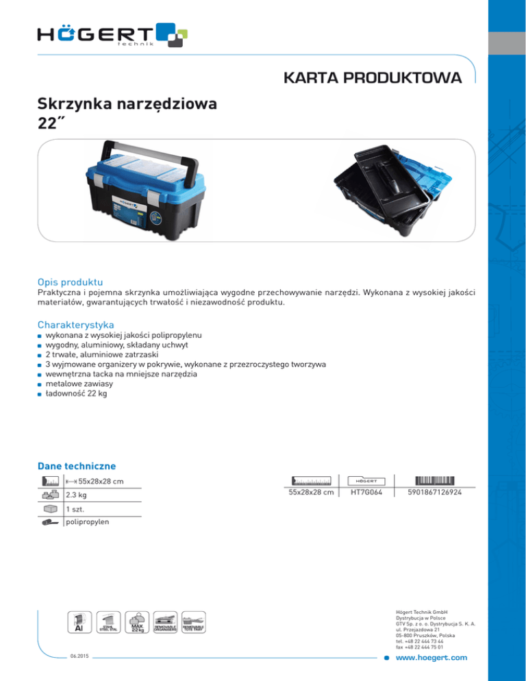 KARTA PRODUKTOWA Skrzynka narzędziowa Opis produktu Praktyczna i pojemna skrzynka umożliwiająca wygodne przechowywanie narzędzi. Wykonana z wysokiej jakości materiałów, gwarantujących trwałość i niezawodność produktu. Charakterystyka wykonana z wysokiej jakości polipropylenu wygodny, aluminiowy, składany uchwyt 2 trwałe, aluminiowe zatrzaski 3 wyjmowane organizery w pokrywie, wykonane z przezroczystego tworzywa wewnętrzna tacka na mniejsze narzędzia metalowe zawiasy ładowność 22 kg Dane techniczne 55x28x28 cm 2.3 kg 55x28x28 cm HT7G064 5901867126924 1 szt. polipropylen Högert Technik GmbH Dystrybucja w Polsce GTV Sp. z o. o. Dystrybucja S. K. A. ul. Przejazdowa 21 05-800 Pruszków, Polska tel. +48 22 444 73 44 fax +48 22 444 75 01 06.2015 www.hoegert.com