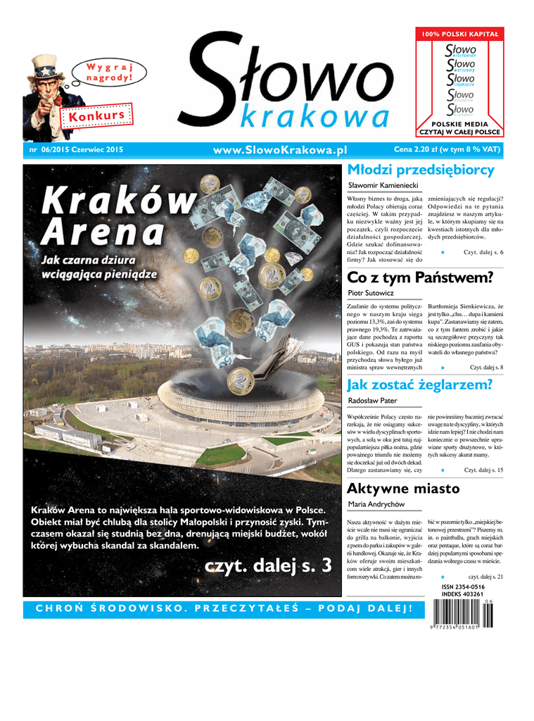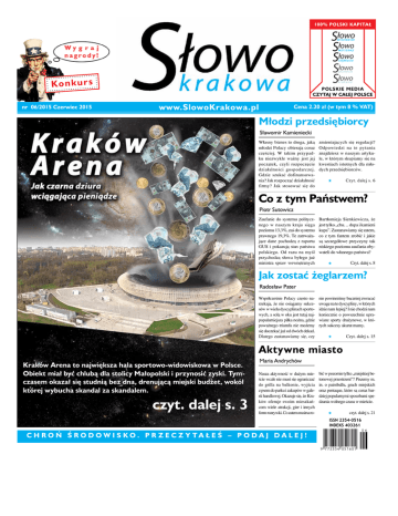 Słowo numeru str 1 100% polski kapitał Konkurs nr 06/2015 Czerwiec 2015 Polskie media Czytaj w całej Polsce www.SlowoKrakowa.pl Cena 2.20 zł (w tym 8 % VAT) Młodzi przedsiębiorcy Sławomir Kamieniecki Własny biznes to droga, jaką młodzi Polacy obierają coraz częściej. W takim przypadku niezwykle ważny jest jej początek, czyli rozpoczęcie działalności gospodarczej. Gdzie szukać dofinansowania? Jak rozpocząć działalność firmy? Jak stosować się do zmieniających się regulacji? Odpowiedzi na te pytania znajdziesz w naszym artykule, w którym skupiamy się na kwestiach istotnych dla młodych przedsiębiorców. Czyt. dalej s. 6 Co z tym Państwem? Piotr Sutowicz Zaufanie do systemu politycznego w naszym kraju sięga poziomu 13,3%, zaś do systemu prawnego 19,3%. Te zatrważające dane pochodzą z raportu GUS i pokazują stan państwa polskiego. Od razu na myśl przychodzą słowa byłego już ministra spraw wewnętrznych Bartłomieja Sienkiewicza, że jest tylko „chu… dupa i kamieni kupa”. Zastanawiamy się zatem, co z tym fantem zrobić i jakie są szczegółowe przyczyny tak niskiego poziomu zaufania obywateli do własnego państwa? Czyt. dalej s. 8 Jak zostać żeglarzem? Radosław Pater Współcześnie Polacy często narzekają, że nie osiągamy sukcesów w wielu dyscyplinach sportowych, a solą w oku jest tutaj najpopularniejsza piłka nożna, gdzie poważnego triumfu nie możemy się doczekać już od dwóch dekad. Dlatego zastanawiamy się, czy nie powinniśmy baczniej zwracać uwagę na te dyscypliny, w których idzie nam lepiej? I nie chodzi nam koniecznie o powszechnie uprawiane sporty drużynowe, w których sukcesy akurat mamy. Czyt. dalej s. 15 Aktywne miasto Kraków Arena to największa hala sportowo-widowiskowa w Polsce. Obiekt miał być chlubą dla stolicy Małopolski i przynosić zyski. Tymczasem okazał się studnią bez dna, drenującą miejski budżet, wokół której wybucha skandal za skandalem. czyt. dalej s. 3 Maria Andrychów Nasza aktywność w dużym mieście wcale nie musi się ograniczać do grilla na balkonie, wyjścia z psem do parku i zakupów w galerii handlowej. Okazuje się, że Kraków oferuje swoim mieszkańcom wiele atrakcji, gier i innych form rozrywki. Co zatem można ro- bić w pozornie tylko „miejskiej betonowej przestrzeni”? Piszemy m. in. o paintballu, grach miejskich oraz pentaque, które są coraz bardziej popularnymi sposobami spędzania wolnego czasu w mieście. czyt. dalej s. 21 ISSN 2354-0516 INDEKS 403261 C H R O Ń Ś R O D OW I S KO. P R Z E C Z Y TA Ł E Ś – P O DA J DA L E J ! Słowo Krakowa Gazeta lokalna czwartek, 24 marca 2011 Wstępniak Spis treści str 2 Czerwiec Arena finansowych kłopotów Temat numeru Sławomir Kamieniecki – Arena finansowych kłopotów – s. 2-3 Sławomir Kamieniecki Co się działo W Krakowie – s. 4 W Polsce – s. 5 W Gospodarce – s.5 Kraków Arena, największa hala sportowo-widowiskowa tego typu w Polsce, to dla wielu chluba stolicy Małopolski i gwarancja organizacji wielkich imprez na światowym poziomie. Rzeczywistość okazuje się jednak zdecydowanie inna, bo do koncertów wielkich gwiazd trzeba dopłacać z pieniędzy podatników, a budżet miasta jest drenowany również z powodu licznych niedoróbek, które stale trzeba poprawiać. Jakby tego było mało, odpowiedzialny za budowę obiektu Mostostal Warszawa domaga się 32 milionów złotych od zarządcy hali. Właśnie fiaskiem zakończyła się próba ugody w tej kwestii. Prawo Michał Burtny – Nadanie klauzuli wykonalności… - s. 6 Marta Pietrzak – Zasady, których trzeba przestrzegać – s. 7 Publicystyka Piotr Sutowicz – Co z tym państwem? – s. 8 Twój Relax Sara Rok – Aktywność odpoczynkiem – s. 9 Agnieszka Dąbrowa – Wiosenne wędkowanie – s. 16 Twój Dom Maria Andrychów – Źródło życia – s. 11 Radosław Pater – Jakie meble? – s. 14 Kraków Arena, która powstała w dzielnicy Czyżyny, kosztowała 371 milionów złotych. Jest największym tego typu obiektem w Polsce, mogąc pomieścić na trybunach 15 tys. osób. Ze względu na jej funkcjonalność, przystosowana jest do takich sportów jak siatkówka, piłka ręczna, hokej na lodzie, lekkoatletyka, halowa piłka Styl Życia Marta Pietrzak – Akcesoria czworonogów – s. 17 Sara Rok – Dla naszych pociech – s. 20 Sport Maria Andrychów – Paintball, gry miejskie i pentaque… - s. 21 Wyborcza wiosna zapleczu dywizji mistrzowskiej. Zaletę areny jest bardzo dobre skomunikowanie z centrum miasta, bo obiekt od Rynku dzielą zaledwie 4 kilometry. Wydawałoby się, że Kraków Arena to wymarzona inwestycja dla stolicy Małopolski, z której mieszkańcy mogą być wyłącznie dumni. Prawda jest jednak zdecyREKLAMA Będzie się działo Maj/czerwiec 2015 - s. 14 - 15 nożna, koszykówka, tenis ziemny czy sporty walki. Organizować w niej można również koncerty, a wtedy jej łączna pojemność wynosi nawet 20 tys. (wliczając w to miejsca stojąca na płycie głównej obiektu). Dotychczas w krakowskiej arenie odbyły się już mecze mistrzostw świata w siatkówce, czy zmagań hokeistów na Mikołaj Kamiński Wokół nas porosły kwieciem, ciepły (zazwyczaj), pachnący, najpiękniejszy maj! Przez okiennice przebijają się już intensywnie słoneczne promienie – ciesząc niezmiernie redakcyjną brać. Taką właśnie wiosenną impresją witam się z Państwem serdecznie, kładąc w ręce Szanownych Czytelników nowe Słowo Krakowa – nasze oczko w głowie! Mamy nadzieję, że jego lektura będzie Państwa po równi intrygować, bawić i informować… a zresztą – zapraszam w dalsze części Miesięcznika, gdzie o jego zawartości przekonają się Państwo sami. Ja jeszcze nie wiem – ale Państwo już wiecie. Tego wstępniaka mam zaszczyt redagować w piątek – dzień po drugiej debacie prezydenckiej między Bronisławem Komorowskim a Andrzejem Dudą. Debacie bardziej porywającej, niż ta wcześniejsza, w 