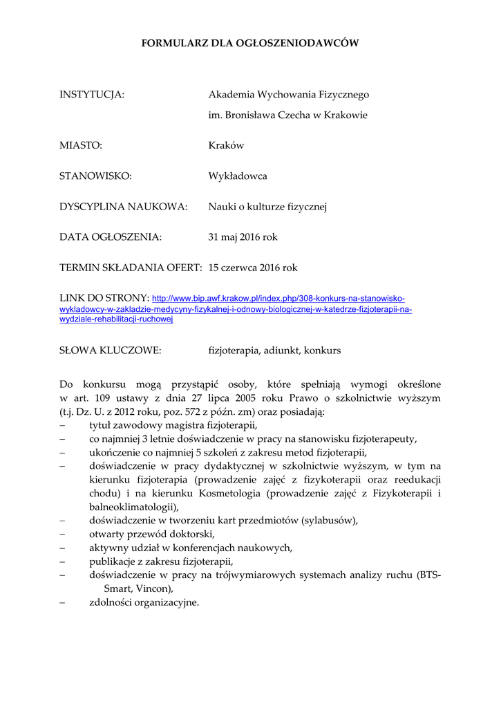 FORMULARZ DLA OGŁOSZENIODAWCÓW INSTYTUCJA: Akademia Wychowania Fizycznego im. Bronisława Czecha w Krakowie MIASTO: Kraków STANOWISKO: Wykładowca DYSCYPLINA NAUKOWA: Nauki o kulturze fizycznej DATA OGŁOSZENIA: 31 maj 2016 rok TERMIN SKŁADANIA OFERT: 15 czerwca 2016 rok LINK DO STRONY: http://www.bip.awf.krakow.pl/index.php/308-konkurs-na-stanowiskowykladowcy-w-zakladzie-medycyny-fizykalnej-i-odnowy-biologicznej-w-katedrze-fizjoterapii-nawydziale-rehabilitacji-ruchowej SŁOWA KLUCZOWE: fizjoterapia, adiunkt, konkurs Do konkursu mogą przystąpić osoby, które spełniają wymogi określone w art. 109 ustawy z dnia 27 lipca 2005 roku Prawo o szkolnictwie wyższym (t.j. Dz. U. z 2012 roku, poz. 572 z późn. zm) oraz posiadają: tytuł zawodowy magistra fizjoterapii, co najmniej 3 letnie doświadczenie w pracy na stanowisku fizjoterapeuty, ukończenie co najmniej 5 szkoleń z zakresu metod fizjoterapii, doświadczenie w pracy dydaktycznej w szkolnictwie wyższym, w tym na kierunku fizjoterapia (prowadzenie zajęć z fizykoterapii oraz reedukacji chodu) i na kierunku Kosmetologia (prowadzenie zajęć z Fizykoterapii i balneoklimatologii), doświadczenie w tworzeniu kart przedmiotów (sylabusów), otwarty przewód doktorski, aktywny udział w konferencjach naukowych, publikacje z zakresu fizjoterapii, doświadczenie w pracy na trójwymiarowych systemach analizy ruchu (BTSSmart, Vincon), zdolności organizacyjne. Kandydaci przystępujący do konkursu powinni złożyć w Dziale Kadr AWF, Al. Jana Pawła II 78, 31-571 Kraków, tel. 12 683 12 47, następujące dokumenty: pisemne oświadczenie o przystąpieniu do konkursu1; życiorys; kwestionariusz osobowy; odpis dyplomu ukończenia studiów wyższych ; oświadczenie stwierdzające, że AWF w Krakowie będzie podstawowym miejscem pracy w przypadku wygrania konkursu; inne dokumenty potwierdzające posiadane kwalifikacje. Termin składania zgłoszeń upływa z dniem 15 czerwca 2016 roku (decyduje data wpływu do AWF). Termin rozstrzygnięcia konkursu: do dnia 30 czerwca 2016 roku. DZIEKAN Wydziału Rehabilitacji Ruchowej Prof. dr hab. Anna Marchewka 1 Na podaniu należy dopisać: „Wyrażam zgodę na przetwarzanie moich danych osobowych zawartych w mojej ofercie pracy dla potrzeb niezbędnych do realizacji procesu rekrutacji” (zgodnie z ustawą z dnia 29 sierpnia 1997 roku o ochronie danych osobowych (tj. Dz.U z 2014 roku, poz. 1182 z późn. zm.)).