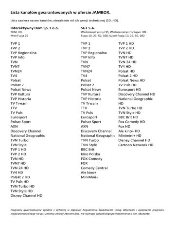 Lista kanałów gwarantowanych w ofercie JAMBOX. Lista zawiera nazwy kanałów, niezależnie od ich wersji technicznej (SD, HD). Interaktywny Dom Sp. z o.o. SGT S.A. MINI HD, Mini Fuzja 25 Wielotematyczny HD, Wielotematyczny Super HD Fuzja 10, 25, 50, 100; Super Fuzja 10, 25, 50, 100 TVP 1 TVP 2 TVP Regionalna TVP Info TVN TVN7 TVN24 TV4 Polsat Polsat 2 Polsat News TVP Kultura TVP Historia TV Trwam TTV TV Puls Eurosport Polsat Sport AXN Discovery Channel National Geographic TVN Turbo TVN Style TVP 1 HD TVP 2 HD TVN HD TVN7 HD TVN 24 HD TV4 HD Polsat 2 HD TV Puls HD TVN Turbo HD TVN Style HD Disney Channel HD TVP 1 TVP 2 TVP Regionalna TVP Info TVN TVN7 TVN24 TV4 Polsat Polsat 2 Polsat News TVP Kultura TVP Historia TV Trwam TTV TV Puls Eurosport Polsat Sport AXN Discovery Channel National Geographic TVN Turbo TVN Style BBC Brit Kino Polska FOX Comedy FOX Comedy Central Ale kino+ MiniMini+ TVP 1 HD TVP 2 HD TVN HD TVN7 HD TVN 24 HD TV4 HD Polsat HD Polsat 2 HD Polsat News HD TV Puls HD Eurosport HD Discovery Channel HD National Geographic HD TVN Turbo HD TVN Style HD BBC Brit HD Fox Comedy HD Fox HD Ale kino+ HD Minimini+ HD Disney Channel HD Cartoon Network HD Programy gwarantowane zgodnie z definicją w Ogólnym Regulaminie Świadczenia Usług. Włączenie i wyłączenie programu niegwarantowanego nie jest zmianą Umowy Abonenckiej i nie wymaga uprzedniego powiadomienia o tym Abonenta. Interaktywny Dom Sp. z o.o. SGT S.A. MINI HD, Mini Fuzja 25 Wielotematyczny HD, Wielotematyczny Super HD Fuzja 10, 25, 50, 100; Super Fuzja 10, 25, 50, 100 Programy gwarantowane zgodnie z definicją w Ogólnym Regulaminie Świadczenia Usług. Włączenie i wyłączenie programu niegwarantowanego nie jest zmianą Umowy Abonenckiej i nie wymaga uprzedniego powiadomienia o tym Abonenta.