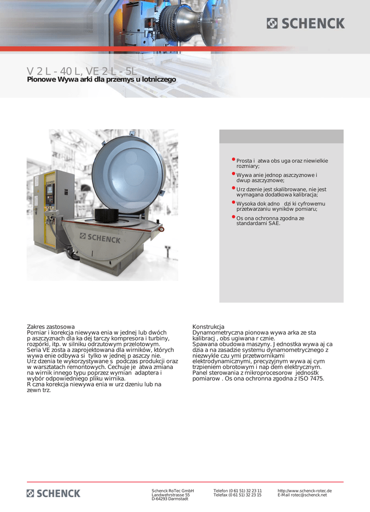 V 2 L - 40 L, VE 2 L - 5L Pionowe Wywa arki dla przemys u lotniczego • Prosta i atwa obs uga oraz niewielkie rozmiary; • Wywa anie jednop aszczyznowe i dwup aszczyznowe; • Urz dzenie jest skalibrowane, nie jest wymagana dodatkowa kalibracja; • Wysoka dok adno dzi ki cyfrowemu przetwarzaniu wyników pomiaru; • Os ona ochronna zgodna ze standardami SAE. Zakres zastosowa Pomiar i korekcja niewywa enia w jednej lub dwóch p aszczyznach dla ka dej tarczy kompresora i turbiny, rozpórki, itp. w silniku odrzutowym przelotowym. Seria VE zosta a zaprojektowana dla wirników, których wywa enie odbywa si tylko w jednej p aszczy nie. Urz dzenia te wykorzystywane s podczas produkcji oraz w warsztatach remontowych. Cechuje je atwa zmiana na wirnik innego typu poprzez wymian adaptera i wybór odpowiedniego pliku wirnika. R czna korekcja niewywa enia w urz dzeniu lub na zewn trz. Konstrukcja Dynamometryczna pionowa wywa arka ze sta kalibracj , obs ugiwana r cznie. Spawana obudowa maszyny. Jednostka wywa aj ca dzia a na zasadzie systemu dynamometrycznego z niezwykle czu ymi przetwornikami elektrodynamicznymi, precyzyjnym wywa aj cym trzpieniem obrotowym i nap dem elektrycznym. Panel sterowania z mikroprocesorow jednostk pomiarow . Os ona ochronna zgodna z ISO 7475. Schenck RoTec GmbH Landwehrstrasse 55 D-64293 Darmstadt Telefon (0 61 51) 32 23 11 Telefax (0 61 51) 32 23 15 http://www.schenck-rotec.de E-Mail [email protected] V 2 L - 40 L, VE 2 L - 5L Pionowe Wywa arki dla przemys u lotniczego Vertical, force-measuring balancing machines series V are specially designed for balancing compressor and turbine discs, seals, spacers, etc. for jet engines in one or two correction planes.The accuracy and large operating range of Schenck RoTec machines permits many balancing tasks to be covered by one machine, reducing the handling costs and increasing efficiency. For jet engine rotors that are balanced in only one plane the VE series is the cost-effective solution.The vibration system here also operates according to dynamometer principles and permits permanent calibration of the measuring unit and high balancing accuracy. 1 Balancing machine2 Protective hood3 Control cabinet and measuring device Plan view (non-binding example) Schenck RoTec GmbH Landwehrstrasse 55 D-64293 Darmstadt Telefon (0 61 51) 32 23 11 Telefax (0 61 51) 32 23 15 http://www.schenck-rotec.de E-Mail [email protected] V 2 L - 40 L, VE 2 L - 5L Pionowe Wywa arki dla przemys u lotniczego Technical data at a glance VE1L VE2L VE3L VE4L VE40L VE5L V1L V2L V3L V4L V40L Measuring unit CAB 925 CAB 925 CAB 925 CAB 925 CAB 925 CAB 925 CAB 925 CAB 925 CAB 925 CAB 925 CAB 925 Protective shroud C600 acc. to ISO 7475 • • • • • • • • • • • Balancing in one plane • • • • • • • • • • • Balancing in two planes Rotor description Weight [kg] 0.3 - 10 0.5 - 25 2 - 60 5 - 150 10 - 300 15 - 500 0.3 - 10 0.5 - 25 2 - 60 Diameter, max. [mm; inch] 406; 16 610; 24 990; 39 Height [mm; inch] 254; 10 254; 10 254; 10 508; 20 508; 20 610; 24 254; 10 254; 10 254; 10 508; 20 508; 20 1448; 57 1178; 70 2082; 82 406; 16 610; 24 990; 39 5 - 150 10 - 300 1448; 57 1178; 70 Machine Width A [mm] 2300 2300 2600 3400 4700 4900 2300 2300 2600 3400 4700 Depth B [mm] 2800 2800 3100 5000 5400 5900 2800 2800 3100 5000 5400 Height C [mm] 1700 1800 2100 2800 3200 3600 1700 1800 2100 2800 3200 Balancing speed, max. [min -1] 2000 1500 1200 950 950 950 2000 1500 1200 950 950 Balancing accuracy [mikroinch] 30 30 30 50 50 50 30 30 30 50 50 Test rotor [lbs] 8 25 25 80 250 250 8 25 25 80 250 Air pressure [kPa] - - - 600 600 600 - - - 600 600 Drive power [kW] 1.1 1.1 2.2 7.5 7.5 22 1.1 1.1 2.2 7.5 7.5 Order No. R0470100.01 R0470200.01 R0470300.01 R0470400.01 R0470500.01 R0470600.01 R0470700.01 R0470800.01 R0470900.01 R0471000.01 R0471100.01 Order No. - - - R0470401.01 R0470501.01 R0470601.01 - - - R0471001.01 R0471101.01 Drive locking equipment Order No. R0470102.01 R0470202.01 R0470302.01 R0470402.01 R0470502.01 R0470602.01 R0470702.01 R0470802.01 R0470902.01 R0471002.01 R0471102.01 SAE test rotor ARP4162 Order No. R0470103.01 R0470203.01 R0470303.01 R0470403.01 R0470503.01 R0470603.01 R0470703.01 R0470803.01 R0470903.01 R0471003.01 R0471103.01 11 kW drive Order No. - - - - R0470504.01 - - - - - R0471104.01 Report printout equipment Order No. R0470105.01 R0470205.01 R0470305.01 R0470405.01 R0470505.01 R0470605.01 R0470705.01 R0470805.01 R0470905.01 R0471005.01 R0471105.01 2) Alternatively also 1100 min-1 3) Conformance to SAE ARP 4050 / 5323 with corresponding SAE test rotor 4) 1 lb = 0.456 kg 5) Tasks with an open shroud. Non-binding, dependent on the respective equipment delivery Schenck RoTec GmbH Landwehrstrasse 55 D-64293 Darmstadt Telefon (0 61 51) 32 23 11 Telefax (0 61 51) 32 23 15 http://www.schenck-rotec.de E-Mail [email protected]