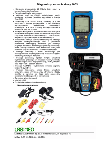 Diagnoskop samochodowy 1005 • Szybkość próbkowania 25 MSa/s (przy pracy w jednym lub dwóch kanałach) • Pamięć przebiegów wzorcowych • Multimetr graficzny (GMM) wyświetlający wyniki pomiarów i wykresy (przebiegi sygnałów), z funkcją True RMS • Unikatowy tryb "Glitch Snare" dostępny w trybie oscyloskopu testów podzespołów, a umożliwiający wychwytywanie, wyświetlanie nietypowych przebiegów, a w razie potrzeby ich rejestrowanie w momencie, gdy się pojawią • Wstępna konfiguracja warunków testu umożliwiająca użytkownikowi szybkie i łatwe sprawdzenie większości czujników, elementów wykonawczych, zapłonowych, wtrysku i innych podzespołów samochodowych • Wbudowana funkcja pomocy ekranowej dla każdego wstępnie skonfigurowanego testu z procedurą pomiarową zawierającą informacje jak dołączyć przyrząd do układu, referencyjny przebieg wzorcowy, teorię zasady działania oraz wskazówki praktyczne pomocne przy lokalizowaniu i usuwaniu uszkodzeń • Interfejs sterowany z menu ekranowego jest skonfigurowany automatycznie dla większości testów nieskonfigurowanych wstępnie • Funkcja Secondary Ignition Single umożliwia wyświetlanie przebiegu w obwodzie wtórnym układu zapłonowego wraz z napięciem iskry, liczbą obrotów oraz napięciem i czasem zapłonu • Funkcja PARADE - wyświetlanie wykresu zapłonu kolejnych cylindrów • Funkcja testowania silnika Diesla umożliwia ustawienie czasu wtrysku pompy wtryskowej i liczby obrotów z użyciem do tego celu akcesoriów opcjonalnych (dostępnych w przyszłości) • Dynamiczny test kompresji • Interfejs USB • Podświetlany ekran ciekłokrystaliczny DANE TECHNICZNE [Oscyloskop cyfrowy] Odchylanie poziome Szybkość próbkowania Długość rekordu Odświeżanie ekranu Dokładność Zakres podstawy czasu Odchylanie pionowe Szerokość pasma Rozdzielczość Liczba kanałów Typ sygnału wejściowego Impedancja wejściowa Maksymalne napięcie wejściowe Zakres czułości Dokładność Wyzwalanie: Źródło wyzwalania Czułość (kanał A) Czułość (wyzwalanie zewn.) Tryby wyzwalania: Typ sygnału Zbocze wyzwalania Inne Wychwytywanie zakłóceń Tryb akwizycji Pamięć konfiguracyjna Pamięć referencyjna Kursory Konfigurowanie przyrządu Ogólne Wyświetlacz Maksymalne wskazanie multimetru Zakres temperatur pracy Zakres temperatur składowania Interfejs komputerowy (PC) Zasilanie Ładowanie Czas pracy akumulatora Wymiary Bezpieczeństwo Wyposażenie standardowe : 25 MSa/s : 1000 punktów : w czasie rzeczywistym, przewijanie : ±(0,1% + 1 piksel) : od 1 μs do 50 s w sekwencji skoków 1-2-5 (w trybie oscyloskopu) od 5 s do 24 h w sekwencji skoków 1-2-5 (w trybie multimetru graficznego) : od d.c. do 5 MHz (-3dB) : 8 bitów :2 : a.c., d.c., masa : 1 MΩ || 70 pF :300 V : od 50 mV do 100 V w sekwencji skoków 1-2-5 : ±3% : kanał A, kanał B, wyzwalanie zewnętrzne : < 1,0 dz w zakresie do 5 MHz : 0,2 Vp-p : jednorazowe, normalne, automatyczne : a.c., d.c. : narastające i opadające : tryb SCOPE (tylko w teście podzespołów) : tryb SCOPE (oscyloskop) : 8 przebiegów i zestawów nastaw : 51 przebiegów i zestawów nastaw : napięcie, czas : język, kontrast, siatka skali : 280 x 240 pikseli (obszar aktywny) z podświetleniem EL (możliwość wyłączenia) : 5000 : od 0°C do 40°C : od -20°C do 60°C : USB wersja 1.1 : pakiet akumulatorów NiMH : z zewnętrznego zasilacza sieciowego : 4 h przy wyłączonym podświetleniu : 230 x 120 x 50 [mm] : II kategoria przepięciowa 300 V zgodnie z normą IEC 1010-1 : Zasilacz sieciowy / ładowarka 1 szt., przewody pomiarowe, ekranowane 2 szt. (czerwony i żółty), przewody masy 2 szt. (czarne), chwytaki krokodylowe 3 szt. (czerwony, żółty i czarny), sondy igłowe nasadzane 3 szt. (czerwona, żółta i czarna), przejściówka na 2 mm 3 szt. (czerwona, żółta i czarna), sonda pojemnościowa (do obserwowania wysokiego napięcia) 1 szt., sonda indukcyjna (do pomiaru prędkości obrotowej) 1 szt., neseser miękki 1 szt., płyta CD z oprogramowaniem komunikacyjnym (zrzut ekranu), przewód USB Wszelkie prawa zastrzeżone © 2012, Labimed Electronics Sp. z o.o. 2 [Multimetr graficzny] Pomiar liczby obrotów Tryb 4 cylindry 2 cylindry Podzakres 120 - 20000 obr./min 60 - 10000 obr./min Dokładność 2 obr./min Pomiar częstotliwości Funkcja Podzakres Rozdzielczość Dokładność Częstotliwość 10 Hz 0,001 Hz 100 Hz 0,01 Hz 1 kHz 0,1 Hz ±(0,1% + 3 cyfry) 10 kHz 1 Hz 100 kHz 10 Hz 1 MHz 100 Hz 5 MHz 1 kHz Współczynnik wypełnienia 2,0% - 98% 0,1% Szerokość impulsu > 2 μs Kąt zwarcia styków prz. 3,6° - 356,4° 0,1° 1,2° / kobr/min + 2 cyfry Szerokość impulsu 2 μs - 450 ms (szerokość impulsu > 2 μs) Pomiar napięcia stałego Funkcja 500 mV 5V 50 V 600 V Rozdzielczość 0,1 mV 0,001 V 0,01 V 0,1 V Dokładność ±(0,3% + 5 cyfr) Impedancja wejściowa > 10 MΩ Pomiar napięcia przemiennego Funkcja Podzakres 500 mV 5V 50 V 600 V 0,1 mV 0,001 V 0,01 V 0,1 V Podzakres 40 Hz - 400 Hz 400 Hz - 10 kHz ±(0,5% + 5 cyfr) ±(2,5% + 5 cyfr) Impedancja wejściowa > 10 MΩ Pomiar napięcia przemiennego z nałożoną składową stałą (AC+DC) Podzakres Funkcja Podzakres 40 Hz - 400 Hz 400 Hz - 10 kHz DC 500 mV 0,1 mV DC 5 V 0,001 V ±(0,8% + 5 cyfr) ±(3,0% + 5 cyfr) DC 50 V 0,01 V DC 600 V 0,1 V Impedancja wejściowa > 10 MΩ Rezystancja Funkcja 500 Ω 5 kΩ 50 kΩ 500 kΩ 5 kΩ 30 MΩ Test ciągłości Napięcie pomiarowe 1,2 V Rozdzielczość 0,1 Ω 0,001 kΩ 0,01 kΩ 0,1 kΩ 0,001 MΩ 0,01 MΩ Dokładność ±(0,75% + 5 cyfr) ±(0,75% + 10cyfr) Próg ok. 70 Ω Czas odpowiedzi 1 ms ±(0,5% + 5 cyfr) Wszelkie prawa zastrzeżone © 2012, Labimed Electronics Sp. z o.o. 3 Test diody Zakres 2,0 V Napięcie przy nieobciążonym wejściu 3,0 V Dokładność ±(2,0% + 5 cyfr) Pomiar temperatury Zakres od -50°C do 1300°C od -58°F do 2372°F Rozdzielczość 0,1°C 0,1°F Dokładność ±3°C ±5,4°F Pomiar prądu stałego (za pomocą przystawki cęgowe