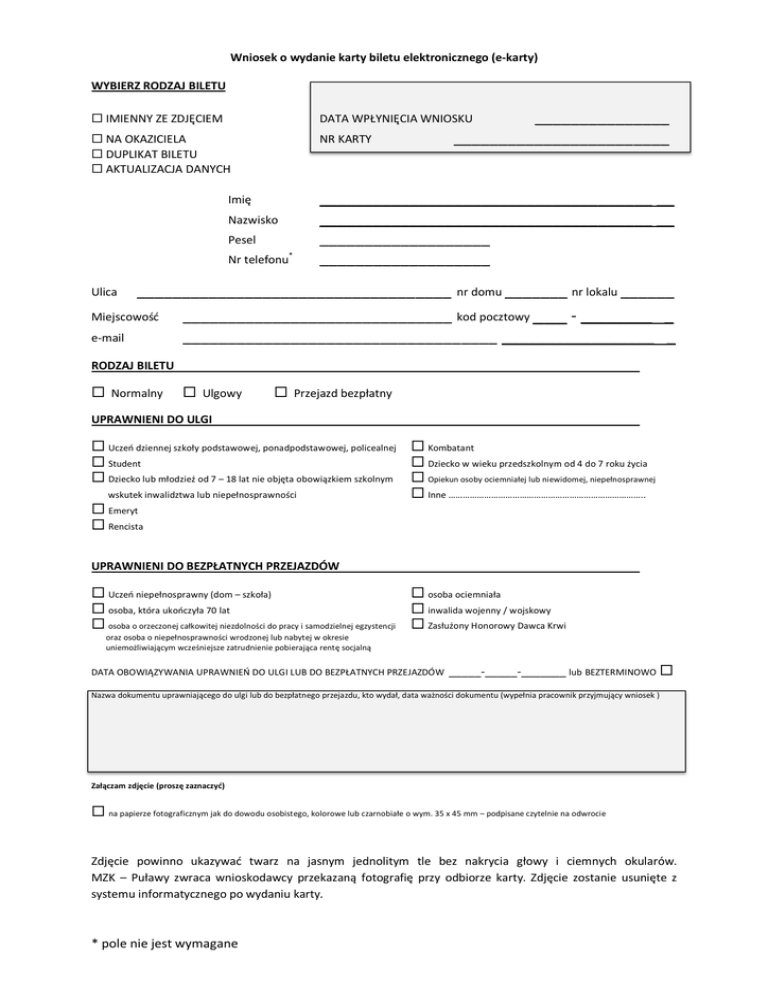 Wniosek o wydanie karty biletu elektronicznego (e-karty) WYBIERZ RODZAJ BILETU _______________ ________________________ IMIENNY ZE ZDJĘCIEM DATA WPŁYNIĘCIA WNIOSKU NA OKAZICIELA DUPLIKAT BILETU AKTUALIZACJA DANYCH NR KARTY Imię Nazwisko Pesel Nr telefonu* _____________________________________ __ _____________________________________ __ ___________________ ___________________ ___________________________________ nr domu _______ nr lokalu ______ Miejscowość ______________________________ kod pocztowy ___ - ________ _ e-mail ___________________________________ _________________ _ Ulica RODZAJ BILETU Normalny Ulgowy Przejazd bezpłatny UPRAWNIENI DO ULGI Uczeń dziennej szkoły podstawowej, ponadpodstawowej, policealnej Kombatant Student Dziecko w wieku przedszkolnym od 4 do 7 roku życia Dziecko lub młodzież od 7 – 18 lat nie objęta obowiązkiem szkolnym Opiekun osoby ociemniałej lub niewidomej, niepełnosprawnej wskutek inwalidztwa lub niepełnosprawności Inne ……………………………………………………………………….. Emeryt Rencista UPRAWNIENI DO BEZPŁATNYCH PRZEJAZDÓW Uczeń niepełnosprawny (dom – szkoła) osoba ociemniała osoba, która ukończyła 70 lat inwalida wojenny / wojskowy osoba o orzeczonej całkowitej niezdolności do pracy i samodzielnej egzystencji Zasłużony Honorowy Dawca Krwi oraz osoba o niepełnosprawności wrodzonej lub nabytej w okresie uniemożliwiającym wcześniejsze zatrudnienie pobierająca rentę socjalną DATA OBOWIĄZYWANIA UPRAWNIEŃ DO ULGI LUB DO BEZPŁATNYCH PRZEJAZDÓW _____-_____-_______ lub BEZTERMINOWO Nazwa dokumentu uprawniającego do ulgi lub do bezpłatnego przejazdu, kto wydał, data ważności dokumentu (wypełnia pracownik przyjmujący wniosek ) Załączam zdjęcie (proszę zaznaczyć) na papierze fotograficznym jak do dowodu osobistego, kolorowe lub czarnobiałe o wym. 35 x 45 mm – podpisane czytelnie na odwrocie Zdjęcie powinno ukazywać twarz na jasnym jednolitym tle bez nakrycia głowy i ciemnych okularów. MZK – Puławy zwraca wnioskodawcy przekazaną fotografię przy odbiorze karty. Zdjęcie zostanie usunięte z systemu informatycznego po wydaniu karty. * pole nie jest wymagane Miejsce odbioru karty Biuro Obsługi Klienta, ul. Dęblińska 2, Puławy Powód wydania duplikatu karty karta nieczytelna karta uszkodzona mechanicznie utrata karty (zgubienie / kradzież – zakreślić odpowiednie) inne ……………………………………………………………………………………………………………………………………………………………….. Data ______ - ______ - _________ 1. 2. 3. 4. 5. 6. Podpis wnioskodawcy lub opiekuna prawnego Oświadczam, że podane przeze mnie we wniosku dane osobowe są pełne i prawdziwe, a przekazane w celu zamieszczenia na karcie zdjęcie nie narusza przepisów prawa oraz dóbr osobistych osób trzecich. Oświadczam, że zapoznałam / zapoznałem się z regulaminem Biletu Elektronicznego (e-karty) i akceptuję jego postanowienia. Przyjmuję do wiadomości, że administratorem danych osobowych, które podałam / podałem we „Wniosku o wydanie karty biletu elektronicznego” jest Miejski Zakład Komunikacji – Puławy sp. z o.o. w Puławach, siedziba: 24-100 Puławy, ul. Dęblińska 2. Dane dotyczące imienia, nazwiska i adresu zamieszkania właściciela spersonalizowanej karty, informacje o uprawnieniach do ulg lub bezpłatnych przejazdów, numer karty, daty i godziny sprzedaży oraz numery linii, w której dokonano kasowań karty będą przetwarzane przez Miejski Zakład Komunikacji – Puławy sp. z o.o. w Puławach w celach wykonania usługi, reklamacyjnych, statystycznych, i windykacyjnych oraz w celach wynikających z przepisów prawa przewozowego, cywilnego, finansowego i budżetowego. Oświadczam, że zostałam / zostałem poinformowana / poinformowany o przysługującym mi prawie wglądu do treści dotyczących mnie danych oraz prawie do ich poprawiania i uzupełniania. Oświadczam, że dane osobowe podałam / podałem dobrowolnie administratorowi danych w celu zawarcia i wykonania umowy dotyczącej korzystania przeze mnie z Karty Biletu Elektronicznego. Przyjmuję do wiadomości, że dotyczące mnie dane osobowe, które podałam / podałem we „Wniosku o wydanie karty biletu elektronicznego”, nie będą udostępnione przez administratora danych osobowych odbiorcom danych w rozumieniu art. 7 pkt 6 ustawy z dnia 29 sierpnia 1997 r. o ochronie danych osobowych (Dz. U. 2002 r. Nr 101. poz. 926 ze zm.) Zapoznałam / em się i akceptuję powyższe Data ______ - ______ - _________ Podpis wnioskodawcy lub opiekuna prawnego Wyrażam zgodę na wykorzystywanie przez Miejski Zakład Komunikacji – Puławy sp. z o.o. w Puławach, siedziba: 24-100 Puławy, ul. Dęblińska 2 podanych przeze mnie dobrowolnie adresu e-mail oraz numeru telefonu w celu przekazywania mi informacji związanych z działalnością tego Przedsiębiorstwa oraz funkcjonowaniem komunikacji miejskiej w Puławach. Jestem świadoma / świadomy, że przedmiotowa zgoda może być odwołana przeze mnie w każdym czasie. Data ______ - ______ - _________ Podpis wnioskodawcy lub opiekuna prawnego Wypełnia pracownik przyjmujący wniosek Data ______ - ______ - _________ Podpis pracownika KWITUJĘ ODBIÓR KARTY NR _______________________________, DANE NA KARCIE SĄ ZGODNE Z PODANYMI WE WNIOSKU Data ______ - ______ - _________ * pole nie jest wymagane Podpis wnioskodawcy lub opiekuna prawnego