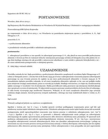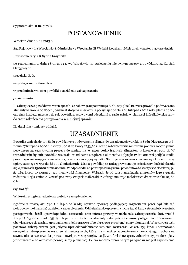 Sygnatura akt III RC 787/12 POSTANOWIENIE Wrocław, dnia 18-01-2013 r. Sąd Rejonowy dla Wrocławia-Śródmieścia we Wrocławiu III Wydział Rodzinny i Nieletnich w następującym składzie: PrzewodniczącySSR Sylwia Krajewska po rozpoznaniu w dniu 18-01-2013 r. we Wrocławiu na posiedzeniu niejawnym sprawy z powództwa A. O., Sąd Okręgowy w P. przeciwko Z. O. - o podwyższenie alimentów w przedmiocie wniosku powódki o udzielenie zabezpieczenia postanawia: I. zabezpieczyć powództwo w ten sposób, że zobowiązać pozwanego Z. O., aby płacił na rzecz powódki podwyższone alimenty w kwocie po 800 zł /osiemset złotych/ miesięcznie poczynając od dnia 26 listopada 2013 roku płatne do 10ego dnia każdego miesiąca do rąk powódki z ustawowymi odsetkami w razie zwłoki w płatności którejkolwiek z rat – do czasu zakończenia postępowania w niniejszej sprawie; II. dalej idący wniosek oddalić. UZASADNIENIE Powódka wniosła do tut. Sądu powództwo o podwyższenie alimentów zasądzonych wyrokiem Sądu Okręgowego w P. z dnia 27 listopada 2000 r. z kwoty 600 zł do kwoty 2533,50 zł oraz o zabezpieczenie roszczenia poprzez zobowiązanie pozwanego na czas trwania procesu do zapłaty na jej rzecz podwyższonych alimentów w kwocie 2533,50 zł. W uzasadnieniu żądania powódka wskazała, że od czasu zasądzenia alimentów upłynęło 12 lat, ona zaś podjęła studia poza miejscem swojego zamieszkania, przez co wzrosły jej wydatki. Studiuje wieczorowo, co wiąże się z koniecznością opłaty czesnego w wysokości 700 zł miesięcznie. Matka powódki jest radcą prawnym i jej miesięczny dochód plasuje się w granicach 15 0000 zł miesięcznie. W odpowiedzi na pozew pozwany uznał powództwo do kwoty 800 zł wskazując, że taka kwota wyczerpuje jego możliwości finansowe. Wskazał, że od czasu zasądzenia alimentów jego sytuacja rodzinna uległa zmianie. Zawarł ponowny związek małżeński, z którego ma troje małoletnich dzieci w wieku 10, 8 i 6 lat. Sąd zważył: Wniosek zasługiwał jedynie na częściowe uwzględnienie. Zgodnie z treścią art. 730 § 1 k.p.c. w każdej sprawie cywilnej podlegającej rozpoznaniu przez sąd lub sąd polubowny można żądać udzielenia zabezpieczenia. Udzielenia zabezpieczenia może żądać każda strona lub uczestnik postępowania, jeżeli uprawdopodobni roszczenie oraz interes prawny w udzieleniu zabezpieczenia. (art. 7301 § 1 k.p.c.). Zgodnie z art. 753 § 1 k.p.c. w sprawach o alimenty zabezpieczenie może polegać na zobowiązaniu obowiązanego do zapłaty uprawnionemu jednorazowo albo okresowo określonej sumy pieniężnej. W sprawach tych podstawą zabezpieczenia jest jedynie uprawdopodobnienie istnienia roszczenia. W art. 753 k.p.c. unormowano szczególne zabezpieczenie roszczeń alimentacyjnych, które ma charakter zabezpieczenia nowacyjnego i polega na stworzeniu na czas trwania procesu nowej prowizorycznej sytuacji, w której obowiązany zobowiązany jest do zapłaty jednorazowo albo okresowo pewnej sumy pieniężnej. Celem zabezpieczenia w tym przypadku nie jest zapewnienie egzekucyjnego wykonania przyszłego wyroku, lecz natychmiastowe dostarczanie uprawnionemu środków utrzymania. W tym zakresie zabezpieczenie prowadzi do (prowizorycznego) zaspokojenia uprawnionego. Uprawdopodobnienie roszczenia w postępowaniu zabezpieczającym, należy rozumieć w ten sposób, że uprawniony powinien przedstawić i należycie uzasadnić twierdzenia, które stanowią podstawę dochodzonego roszczenia. Uprawdopodobnienie odnosi się zarówno do okoliczności faktycznych, na których opiera się roszczenie i które powinny być przedstawione, a ich istnienie prawdopodobne w świetle dowodów oferowanych przez uprawnionego, jak i do podstawy prawnej roszczenia, która powinna być również prawdopodobna w tym znaczeniu, że dochodzone roszczenie znajduje podstawę normatywną. Podstawą roszczenia w niniejszej sprawie jest art. 138 k.r.o., który przewiduje, że w razie zmiany stosunków można żądać zmiany orzeczenia lub umowy dotyczącej obowiązku alimentacyjnego. W dalszej kolejności należy jednak oprzeć się na przepisach będących w ogóle podstawą obowiązku alimentacyjnego, a więc art. 128 k.r.o, art. 129 § 1 k.r.o., w szczególności zaś art. 135 k.r.o., który przewiduje, że zakres świadczeń alimentacyjnych zależy od usprawiedliwionych potrzeb uprawnionego oraz zarobkowych i majątkowych możliwości zobowiązanego. Zostało także uprawdopodobnione, że zaszła zmiana okoliczności po wydaniu poprzedniego orzeczenia w przedmiocie alimentów – od tego czasu upłynęło bowiem 12 lat. Należy jednak podkreślić, że przez uprawdopodobnienie roszczenia w sprawie o podwyższenie alimentów rozumie się przekonanie Sądu orzekającego, nie tylko co do zmiany stosunków, ale co do tego, że zmiana ta powinna mieć wpływ na zakres obowiązku alimentacyjnego - w odniesieniu do art. 135 § 1 k.r.o. A więc, że z uwagi na zmianę okoliczności, tak zmienił się zakres usprawiedliwionych potrzeb uprawnionego lub możliwości zarobkowych i majątkowych zobowiązanego, że niezbędne jest wyznaczenie nowego zakresu zobowiązania alimentacyjnego. Jak wspomniano wyżej, w sprawach o alimenty uzasadnieniem zabezpieczenia powództwa, jest natychmiastowa potrzeba zapewnienia uprawnionemu środków niezbędnych do zaspokojenia usprawiedliwionych podstawowych potrzeb. W tym kontekście powództwo o podwyższenie alimentów, nie jest typową sprawą o alimenty w rozumieniu przepisu art. 753 k.p.c. Mimo, że w dalszym ciągu przy rozstrzyganiu w przedmiocie zabezpieczenia, Sąd bierze pod uwagę tylko uprawdopodobnienie roszczenia, niezbędne jest ponadto dokonanie swoistej oceny celowości udzielenia zabezpieczenia, cofając się niejako do ogólnych dyrektyw i istoty instytucji zabezpieczenia. W niniejszej sprawie nie zostało uprawdopodobnione, że usprawiedliwione potrzeby powódki i obecna sytuacja pozwanego wymag