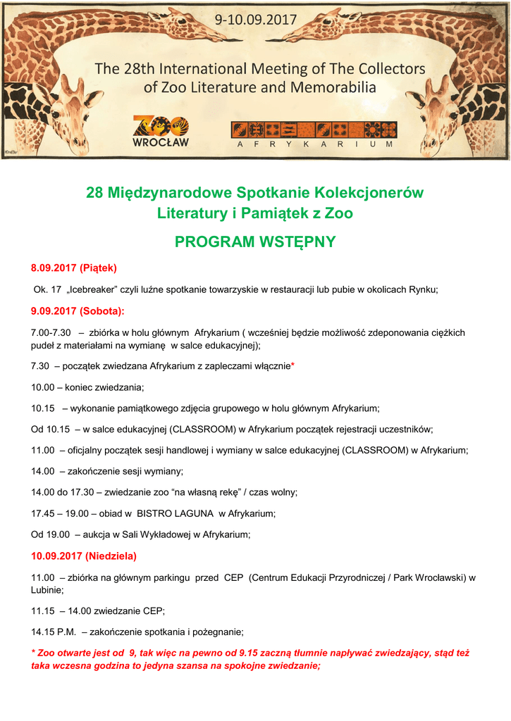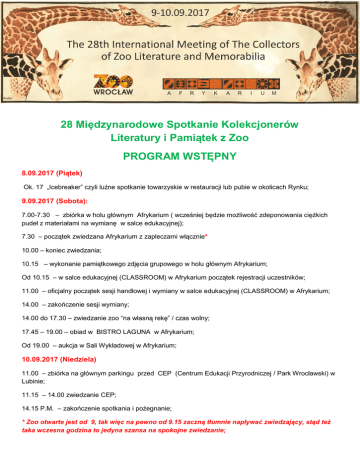 28 Międzynarodowe Spotkanie Kolekcjonerów Literatury i Pamiątek z Zoo PROGRAM WSTĘPNY 8.09.2017 (Piątek) Ok. 17 „Icebreaker” czyli luźne spotkanie towarzyskie w restauracji lub pubie w okolicach Rynku; 9.09.2017 (Sobota): 7.00-7.30 – zbiórka w holu głównym Afrykarium ( wcześniej będzie możliwość zdeponowania ciężkich pudeł z materiałami na wymianę w salce edukacyjnej); 7.30 – początek zwiedzana Afrykarium z zapleczami włącznie* 10.00 – koniec zwiedzania; 10.15 – wykonanie pamiątkowego zdjęcia grupowego w holu głównym Afrykarium; Od 10.15 – w salce edukacyjnej (CLASSROOM) w Afrykarium początek rejestracji uczestników; 11.00 – oficjalny początek sesji handlowej i wymiany w salce edukacyjnej (CLASSROOM) w Afrykarium; 14.00 – zakończenie sesji wymiany; 14.00 do 17.30 – zwiedzanie zoo “na własną rekę” / czas wolny; 17.45 – 19.00 – obiad w BISTRO LAGUNA w Afrykarium; Od 19.00 – aukcja w Sali Wykładowej w Afrykarium; 10.09.2017 (Niedziela) 11.00 – zbiórka na głównym parkingu przed CEP (Centrum Edukacji Przyrodniczej / Park Wrocławski) w Lubinie; 11.15 – 14.00 zwiedzanie CEP; 14.15 P.M. – zakończenie spotkania i pożegnanie; * Zoo otwarte jest od 9, tak więc na pewno od 9.15 zaczną tłumnie napływać zwiedzający, stąd też taka wczesna godzina to jedyna szansa na spokojne zwiedzanie; Uwagi dodatkowe: - wstępny koszt uczestnictwa to około 25,00 € od osoby (w zeszłym roku w Zoo Zurich opłata ta wynosiła 55.00 Euro!!!) i nie będzie różnicy w kosztach dla głównego uczestnika i osoby towarzyszącej, ponieważ opłata to głównie cena obiadu oraz niewielka suma za profesjonalne wydrukowanie pamiątkowego zdjęcia w zakładzie fotograficznym; - płatność gotówką przy rejestracji, zasadniczo w Euro. Rozważana jest możłiwość kosztów uczestnictwa dla kolekcjonerów z Polski na poziomie 100,00 zł. (bez względu na kurs dnia Euro do złotego); wszyscy uczestnicy będą mieli darmowy wstęp do Zoo Wrocław prawdopodobnie od piątku do poniedziałku włącznie; - wstęp do CEP Lubin jest bezpłatny; - nie będzie żadnego druku zgłoszenia. Proszę po prostu wysłać mejla na mój adres podając podstawowe dane (imię,nazwisko, miejscowość, może być coś o wieku i zainteresowaniach) oraz informację czy uczestnik będzie potrzebował samodzielny stół, czy do spółki z kimś innym, czy w ogóle nie; - nie ma i nie będzie żadnego ostatecznego terminu zgłoszeń. Jedna czy nawet kilka osób nie zrobi różnicy nawet przyjeżdżając w ostatniej chwili. Jedyny problem to ewentualnie kłopoty ze wspomnianym stołem na materiały do wymiany; - co to jest aukcja? Aukcja to licytacja różnych pamiątek i literatury zoo, które zostały wczesniej na ten cel przekazane przez uczestników. Mogą się trafić ciekawe rzeczy. Może Zoo Wrocław coś przekaże z archiwalnych dubli. Zebrane pieniądze zostaną zapewne przekazane w tym wypdaku na działalność Fundacji DODO; - jeśli macie jakieś pytania proszę pisać na poniższy adres; Leszek Solski [email protected]