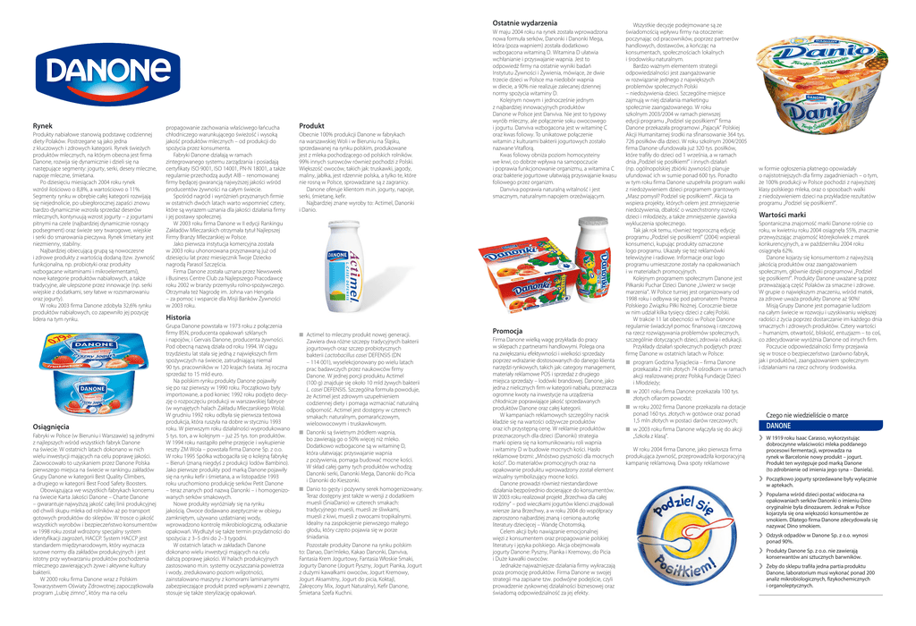 Ostatnie wydarzenia Rynek Produkty nabiałowe stanowią podstawę codziennej diety Polaków. Postrzegane są jako jedna z kluczowych i zdrowych kategorii. Rynek świeżych produktów mlecznych, na którym obecna jest firma Danone, rozwija się dynamicznie i dzieli się na następujące segmenty: jogurty, serki, desery mleczne, napoje mleczne, śmietana. Po dziesięciu miesiącach 2004 roku rynek wzrósł ilościowo o 8,8%, a wartościowo o 11%. Segmenty rynku w obrębie całej kategorii rozwijają się niejednolicie, po ubiegłorocznej zapaści znowu bardzo dynamicznie wzrosła sprzedaż deserów mlecznych, kontynuują wzrost jogurty – z jogurtami pitnymi na czele (najbardziej dynamicznie rosnący podsegment) oraz świeże sery twarogowe, wiejskie i serki do smarowania pieczywa. Rynek śmietany jest niezmienny, stabilny. Najbardziej obiecującą grupą są nowoczesne i zdrowe produkty z wartością dodaną (tzw. żywność funkcjonalna, np. probiotyki oraz produkty wzbogacane witaminami i mikroelementami), nowe kategorie produktów nabiałowych, a także tradycyjne, ale ulepszone przez innowacje (np. serki wiejskie z dodatkami, sery łatwe w rozsmarowaniu oraz jogurty). W roku 2003 firma Danone zdobyła 32,6% rynku produktów nabiałowych, co zapewniło jej pozycję lidera na tym rynku. Osiągnięcia Fabryki w Polsce (w Bieruniu i Warszawie) są jednymi z najlepszych wśród wszystkich fabryk Danone na świecie. W ostatnich latach dokonano w nich wielu inwestycji mających na celu poprawę jakości. Zaowocowało to uzyskaniem przez Danone Polska pierwszego miejsca na świecie w rankingu zakładów Grupy Danone w kategorii Best Quality Climbers, a drugiego w kategorii Best Food Safety Boosters. Obowiązująca we wszystkich fabrykach koncernu na świecie Karta Jakości Danone – Charte Danone – gwarantuje najwyższą jakość całej linii produkcyjnej od chwili skupu mleka od rolników aż po transport gotowych produktów do sklepów. W trosce o jakość wszystkich wyrobów i bezpieczeństwo konsumentów w 1998 roku został wdrożony specjalny system identyfikacji zagrożeń, HACCP. System HACCP jest standardem międzynarodowym, który wyznacza surowe normy dla zakładów produkcyjnych i jest istotny przy wytwarzaniu produktów pochodzenia mlecznego zawierających żywe i aktywne kultury bakterii. W 2000 roku firma Danone wraz z Polskim Towarzystwem Oświaty Zdrowotnej zapoczątkowała program „Lubię zimno”, który ma na celu propagowanie zachowania właściwego łańcucha chłodniczego warunkującego świeżość i wysoką jakość produktów mlecznych – od produkcji do spożycia przez konsumenta. Fabryki Danone działają w ramach zintegrowanego systemu zarządzania i posiadają certyfikaty ISO 9001, ISO 14001, PN-N 18001, a także regularnie przechodzą audyt AIB – renomowanej firmy będącej gwarancją najwyższej jakości wśród producentów żywności na całym świecie. Spośród nagród i wyróżnień przyznanych firmie w ostatnich dwóch latach warto wspomnieć cztery, które są wyrazem uznania dla jakości działania firmy i jej postawy społecznej. W 2003 roku firma Danone w II edycji Rankingu Zakładów Mleczarskich otrzymała tytuł Najlepszej Firmy Branży Mleczarskiej w Polsce. Jako pierwsza instytucja komercyjna została w 2003 roku uhonorowana przyznawaną już od dziesięciu lat przez miesięcznik Twoje Dziecko nagrodą Parasol Szczęścia. Firma Danone została uznana przez Newsweek i Business Centre Club za Najlepszego Pracodawcę roku 2002 w branży przemysłu rolno-spożywczego. Otrzymała też Nagrodę im. Johna van Hengela – za pomoc i wsparcie dla Misji Banków Żywności w 2003 roku. Produkt Obecnie 100% produkcji Danone w fabrykach na warszawskiej Woli i w Bieruniu na Śląsku, sprzedawanej na rynku polskim, produkowane jest z mleka pochodzącego od polskich rolników. 99% innych surowców również pochodzi z Polski. Większość owoców, takich jak: truskawki, jagody, maliny, jabłka, jest rdzennie polska, a tylko te, które nie rosną w Polsce, sprowadzane są z zagranicy. Danone oferuje klientom m.in. jogurty, napoje, serki, śmietanę, kefir. Najbardziej znane wyroby to: Actimel, Danonki i Danio. W maju 2004 roku na rynek została wprowadzona nowa formuła serków, Danonki i Danonki Mega, która (poza wapniem) została dodatkowo wzbogacona witaminą D. Witamina D ułatwia wchłanianie i przyswajanie wapnia. Jest to odpowiedź firmy na ostatnie wyniki badań Instytutu Żywności i Żywienia, mówiące, że dwie trzecie dzieci w Polsce ma niedobór wapnia w diecie, a 90% nie realizuje zalecanej dziennej normy spożycia witaminy D. Kolejnym nowym i jednocześnie jednym z najbardziej innowacyjnych produktów Danone w Polsce jest Danviva. Nie jest to typowy wyrób mleczny, ale połączenie soku owocowego i jogurtu. Danviva wzbogacona jest w witaminę C oraz kwas foliowy. To unikatowe połączenie witamin z kulturami bakterii jogurtowych zostało nazwane Vitaflorą. Kwas foliowy obniża poziom homocysteiny we krwi, co dobrze wpływa na samopoczucie i poprawia funkcjonowanie organizmu, a witamina C oraz bakterie jogurtowe ułatwiają przyswajanie kwasu foliowego przez organizm. Danviva poprawia naturalną witalność i jest smacznym, naturalnym napojem orzeźwiającym. Historia Grupa Danone powstała w 1973 roku z połączenia firmy BSN, producenta opakowań szklanych i napojów, i Gervais Danone, producenta żywności. Pod obecną nazwą działa od roku 1994. W ciągu trzydziestu lat stała się jedną z największych firm spożywczych na świecie, zatrudniającą niemal 90 tys. pracowników w 120 krajach świata. Jej roczna sprzedaż to 15 mld euro. Na polskim rynku produkty Danone pojawiły się po raz pierwszy w 1990 roku. Początkowo były importowane, a pod koniec 1992 roku podjęto decyzję o rozpoczęciu produkcji w warszawskiej fabryce (w wynajętych halach Zakładu Mleczarskiego Wola). W grudniu 1992 roku odbyła się pierwsza testowa pr