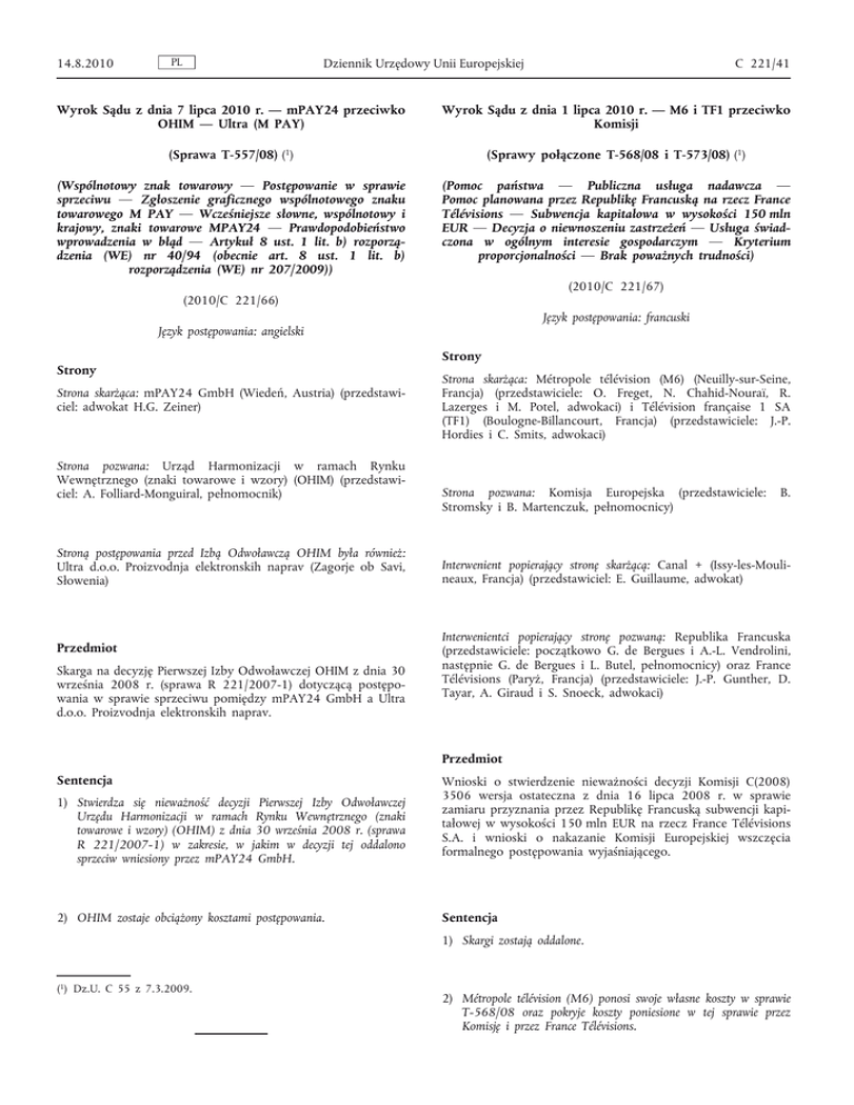14.8.2010 PL Dziennik Urzędowy Unii Europejskiej C 221/41 Wyrok Sądu z dnia 7 lipca 2010 r. — mPAY24 przeciwko OHIM — Ultra (M PAY) Wyrok Sądu z dnia 1 lipca 2010 r. — M6 i TF1 przeciwko Komisji (Sprawa T-557/08) (1) (Sprawy połączone T-568/08 i T-573/08) (1) (Wspólnotowy znak towarowy — Postępowanie w sprawie sprzeciwu — Zgłoszenie graficznego wspólnotowego znaku towarowego M PAY — Wcześniejsze słowne, wspólnotowy i krajowy, znaki towarowe MPAY24 — Prawdopodobieństwo wprowadzenia w błąd — Artykuł 8 ust. 1 lit. b) rozporzą dzenia (WE) nr 40/94 (obecnie art. 8 ust. 1 lit. b) rozporządzenia (WE) nr 207/2009)) (Pomoc państwa — Publiczna usługa nadawcza — Pomoc planowana przez Republikę Francuską na rzecz France Télévisions — Subwencja kapitałowa w wysokości 150 mln EUR — Decyzja o niewnoszeniu zastrzeżeń — Usługa świad czona w ogólnym interesie gospodarczym — Kryterium proporcjonalności — Brak poważnych trudności) (2010/C 221/67) (2010/C 221/66) Język postępowania: francuski Język postępowania: angielski Strony Strona skarżąca: mPAY24 GmbH (Wiedeń, Austria) (przedstawi ciel: adwokat H.G. Zeiner) Strona pozwana: Urząd Harmonizacji w ramach Rynku Wewnętrznego (znaki towarowe i wzory) (OHIM) (przedstawi ciel: A. Folliard-Monguiral, pełnomocnik) Stroną postępowania przed Izbą Odwoławczą OHIM była również: Ultra d.o.o. Proizvodnja elektronskih naprav (Zagorje ob Savi, Słowenia) Przedmiot Skarga na decyzję Pierwszej Izby Odwoławczej OHIM z dnia 30 września 2008 r. (sprawa R 221/2007-1) dotyczącą postępo wania w sprawie sprzeciwu pomiędzy mPAY24 GmbH a Ultra d.o.o. Proizvodnja elektronskih naprav. Strony Strona skarżąca: Métropole télévision (M6) (Neuilly-sur-Seine, Francja) (przedstawiciele: O. Freget, N. Chahid-Nouraï, R. Lazerges i M. Potel, adwokaci) i Télévision française 1 SA (TF1) (Boulogne-Billancourt, Francja) (przedstawiciele: J.-P. Hordies i C. Smits, adwokaci) Strona pozwana: Komisja Europejska (przedstawiciele: Stromsky i B. Martenczuk, pełnomocnicy) B. Interwenient popierający stronę skarżącą: Canal + (Issy-les-Mouli neaux, Francja) (przedstawiciel: E. Guillaume, adwokat) Interwenientci popierający stronę pozwaną: Republika Francuska (przedstawiciele: początkowo G. de Bergues i A.-L. Vendrolini, następnie G. de Bergues i L. Butel, pełnomocnicy) oraz France Télévisions (Paryż, Francja) (przedstawiciele: J.-P. Gunther, D. Tayar, A. Giraud i S. Snoeck, adwokaci) Przedmiot Sentencja 1) Stwierdza się nieważność decyzji Pierwszej Izby Odwoławczej Urzędu Harmonizacji w ramach Rynku Wewnętrznego (znaki towarowe i wzory) (OHIM) z dnia 30 września 2008 r. (sprawa R 221/2007-1) w zakresie, w jakim w decyzji tej oddalono sprzeciw wniesiony przez mPAY24 GmbH. 2) OHIM zostaje obciążony kosztami postępowania. Wnioski o stwierdzenie nieważności decyzji Komisji C(2008) 3506 wersja ostateczna z dnia 16 lipca 2008 r. w sprawie zamiaru przyznania przez Republikę Francuską subwencji kapi tałowej w wysokości 150 mln EUR na rzecz France Télévisions S.A. i wnioski o nakazanie Komisji Europejskiej wszczęcia formalnego postępowania wyjaśniającego. Sentencja 1) Skargi zostają oddalone. (1) Dz.U. C 55 z 7.3.2009. 2) Métropole télévision (M6) ponosi swoje własne koszty w sprawie T-568/08 oraz pokryje koszty poniesione w tej sprawie przez Komisję i przez France Télévisions.