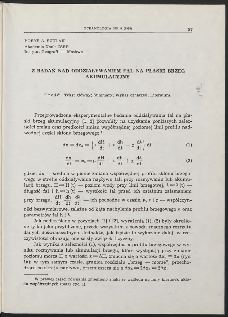 lacji brzegu, H = H (t) — poziom wody przy linii brzegowej, 1 = 1 (t) —