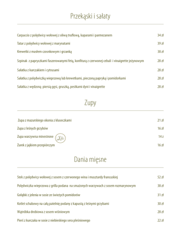 Przekąski i sałaty Carpaccio z polędwicy wołowej z oliwą truflową, kaparami i parmezanem 34 zł Tatar z polędwicy wołowej z marynatami 39 zł Krewetki z masłem czosnkowym i grzanką 38 zł Szpinak z papryczkami faszerowanymi fetą, konfiturą z czerwonej cebuli i vinaigrette jeżynowym 28 zł Sałatka z kurczakiem i cytrusami 28 zł Sałatka z polędwiczką wieprzową lub krewetkami, pieczoną papryką i pomidorkami 28 zł Sałatka z wędzoną piersią gęsi, gruszką, pestkami dyni i vinaigrette 28 zł Zupy Zupa z mazurskiego okonia z kluseczkami 21 zł Zupa z leśnych grzybów 16 zł Zupa warzywna minestrone 14 z Żurek z jajkiem przepiórczym 16 zł Dania mięsne Stek z polędwicy wołowej z sosem z czerwonego wina i musztardy francuskiej 52 zł Polędwiczka wieprzowa z grilla podana na smażonych warzywach z sosem rozmarynowym 38 zł Gołąbki z jelenia w sosie ze świeżych pomidorów 31 zł Kotlet schabowy na całą patelnię podany z kapustą z leśnymi grzybami 30 zł Wątróbka drobiowa z sosem wiśniowym 28 zł Pierś z kurczaka w sosie z niebieskiego sera pleśniowego 22 zł Dania rybne Filet z sandacza w sosie szafranowym z grillowaną cukinią i suszonymi pomidorami 38 zł Filet z sandacza w śmietanie ze świeżo siekanym koprem 37 zł Łosoś w sosie curry na szpinaku 38 zł Filet z okonia jeziorowego z patelni 17 zł /100 g Makarony i pierogi Makaron z grillowaną piersią kurczaka i świeżym szpinakiem w sosie śmietanowym z parmezanem 38 zł Makaron z sosem pomidorowym, parmezanem i warzywami 25 zł Pierogi z cielęciną okraszone borowikami 25 zł Dodatki Ziemniaki z grilla 8 zł Kopytka domowe z wody lub z patelni 11 zł Puree ziemniaczane 7 zł Frytki 8 zł Warzywa z grilla z ziołowym vinaigrette 12 zł Bukiet gotowanych warzyw 10 zł Mizeria 8 zł Pomidory ze śmietaną i cebulką 8 zł Sałaty z warzywami i ziołowym sosem vinaigrette Surówka sezonowa 12 zł 9 zł Desery Torcik bezowy z mascarpone i sosem owocowym 19 zł Tarta z mlecznej czekolady zapiekana z wiśniami 20 zł Sernik z lodami i czekoladą 15 zł Creme brulee z cytrusami i sosem wiśniowym 16 zł Naleśniki z czekoladą lub malinami 12 zł Lody z bitą śmietaną i chrupiącą posypką 10 zł Lody z malinami lub karmelem 19 zł Naturalne lody i sorbety z rodzinnej produkcji Państwa Kroczek 4,80 zł/gałka lody śmietankowe, czekoladowe, ciasteczkowe, słony karmel, sorbet truskawkowy, sorbet mango Menu dla dzieci Bulion drobiowy z domowym makaronem 11 zł Zupa ze świeżych pomidorów z domowym makaronem 11 zł Lizaki z piersi kurczaka z frytkami i surówką z marchewki i jabłka 15 zł Filet z sandacza w złocistej panierce z puree ziemniaczanym i mizerią 21 zł Makaron spaghetti z sosem bolognese 19 zł Naleśniki z czekoladą lub kremem kajmakowym 12 zł Naleśniki z malinami 12 zł