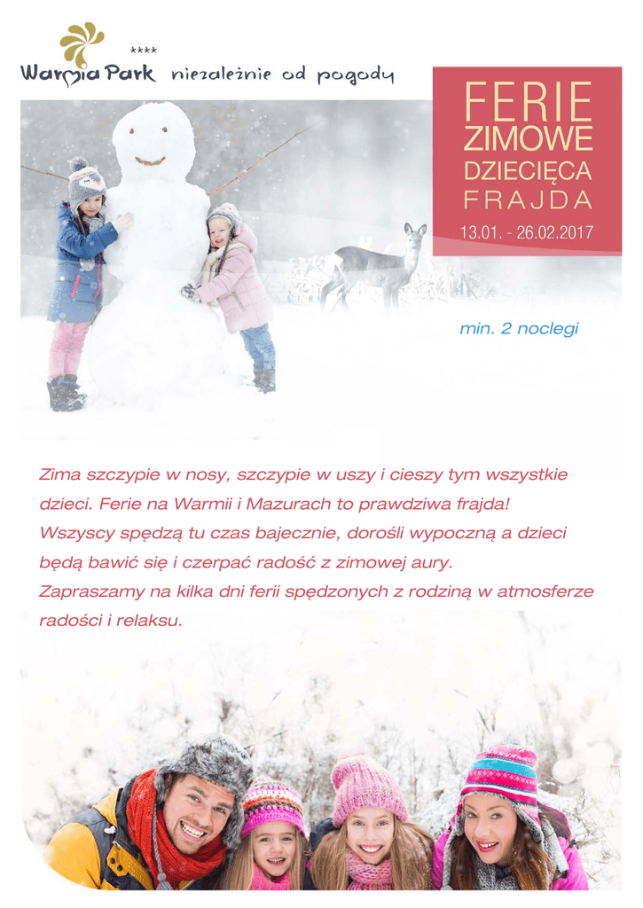 min. 2 noclegi Zima szczypie w nosy, szczypie w uszy i cieszy tym wszystkie dzieci. Ferie na Warmii i Mazurach to prawdziwa frajda! Wszyscy spędzą tu czas bajecznie, dorośli wypoczną a dzieci będą bawić się i czerpać radość z zimowej aury. Zapraszamy na kilka dni ferii spędzonych z rodziną w atmosferze radości i relaksu. W cenie pobytu oferujemy noclegi w komfortowych pokojach śniadania i obiadokolacje przygotowane według autorskich przepisów Szefa Kuchni atrakcje programu „Dziecięca frajda” • zabawy plastyczne (poniedziałek) • "Mega-gracz" (poniedziałek, czwartek) • zabawy sportowe (wtorek) • zabawy z balonami (środa) • warsztaty pierwszej pomocy (środa) • gry i zabawy z Olafem (czwartek) • zajęcia z konikami (piątek) • ogniska z pieczeniem kiełbasek przy muzyce i grzańcu (wtorek, piątek) • "Wyprawa na Madagaskar" – zabawa dla dzieci (sobota) • "Słodka chwila" (niedziela) Prosimy, by dzieci do 4 lat brały udział w zajęciach pod opieką osoby dorosłej. GRATIS atrakcje 3-poziomowego aquaparku możliwość korzystania z saun korzystanie z siłowni możliwość korzystania z saloniku zabaw dla dzieci (pod opieką osoby dorosłej) możliwość wypożyczenia sanek WiFi zestaw do przyrządzania kawy i herbaty osccosccosccosccosccsccs Gościom, którzy wykupią pobyty w standardowych pokojach 1- i 2-osobowych oferujemy bezpłatny nocleg dla dzieci do 12 lat śpiących z opiekunami. osccosccosccosccosccsccs Dziecko do lat 4 bez oddzielnego łóżka gościmy w naszym hotelu BEZPŁATNIE! (na życzenie Gościa możliwość wstawienia do pokoju łóżeczka). Dziecko do12 lat na łóżku standardowym otrzymuje rabat 20% od ceny noclegu (z wyłączeniem apartamentów). Rabaty nie łączą się. Parking samochodowy, dozorowany – płatny 20 PLN/doba. Opłata miejscowa nie jest wliczona w cenę pobytu. Warunkiem rezerwacji gwarantowanej jest dokonanie zadatku w wysokości 20% wartości zamówionych świadczeń w terminie do 3 dni po potwierdzeniu rezerwacji przez hotel. Uprzejmie informujemy, iż istnieje możliwość pobytu z czworonogiem 70 PLN/doba (pokoje w wyznaczonym skrzydle hotelu). Chęć przyjazdu ze zwierzęciem należy zgłosić w chwili dokonywania rezerwacji. Ceny zawierają podatek VAT. Hotel zastrzega sobie możliwość zmiany cen oraz zmian w programie. Oferta obowiązuje w terminie 13.01. – 26.02.2017. Za dodatkową opłatą Gościom hotelowym proponujemy rekreację konną zajęcia fitness z instruktorką bilard możliwość wypożyczenia kijków do nordic walking bogatą ofertę zabiegów pielęgnacyjnych i zdrowotnych w SPA korzystanie z basenu solankowego seanse Aqua Musicale prezenty w postaci voucherów SPA korzystanie z zabiegów w Dolinie Zdrowia w aquaparku smakołyki kuchni Fusion oraz kuchni regionalnej w restauracji hotelowej „Pyszności dla aquaparkowych Gości” w aquabarze wieczorne drinki w klubie muzycznym Prosimy o wcześniejszą rezerwację zabiegów w SPA min. 7 dni przed przyjazdem. Dokonanie wcześniejszej rezerwacji gwarantuje skorzystanie z oferty zabiegów. Zima na Warmii W miejscowości Pluski znajduje się wypożyczalnia sprzętów do uprawiania sportów zimowych, tj. bojery, skutery śnieżne, narty biegowe, łyżwy. W miejscowości Ruś (ok. 20 km od miejscowości Pluski) znajduje się wyciąg i stok narciarski Kartasiówka. Serdecznie zapraszamy do Plusk! Hotel & SPA WARMIA PARK Pluski ul. Pluszna 36, 11-034 Stawiguda tel.: +48-89-519-53-00, fax: +48-89-519-53-03 [email protected] www.warmiapark.pl www.warmiaparkclub.pl
